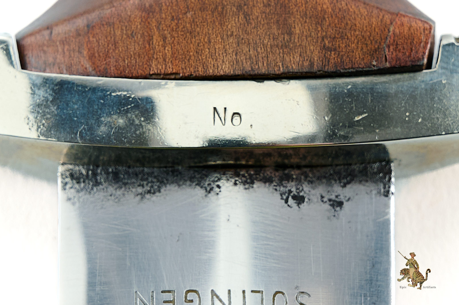 The blade exhibits light pitting and surface wear, consistent with age and service use, but remains in excellent overall condition, with legible maker mark and motto. Blade shows corrosion up near guard, and a small spot of corrosion to the edge, but the tip remains intact. The lower crossguard bears the “No” Gau district stamp, indicating issue in the Nordsee region—an important regional designation sought by many collectors.