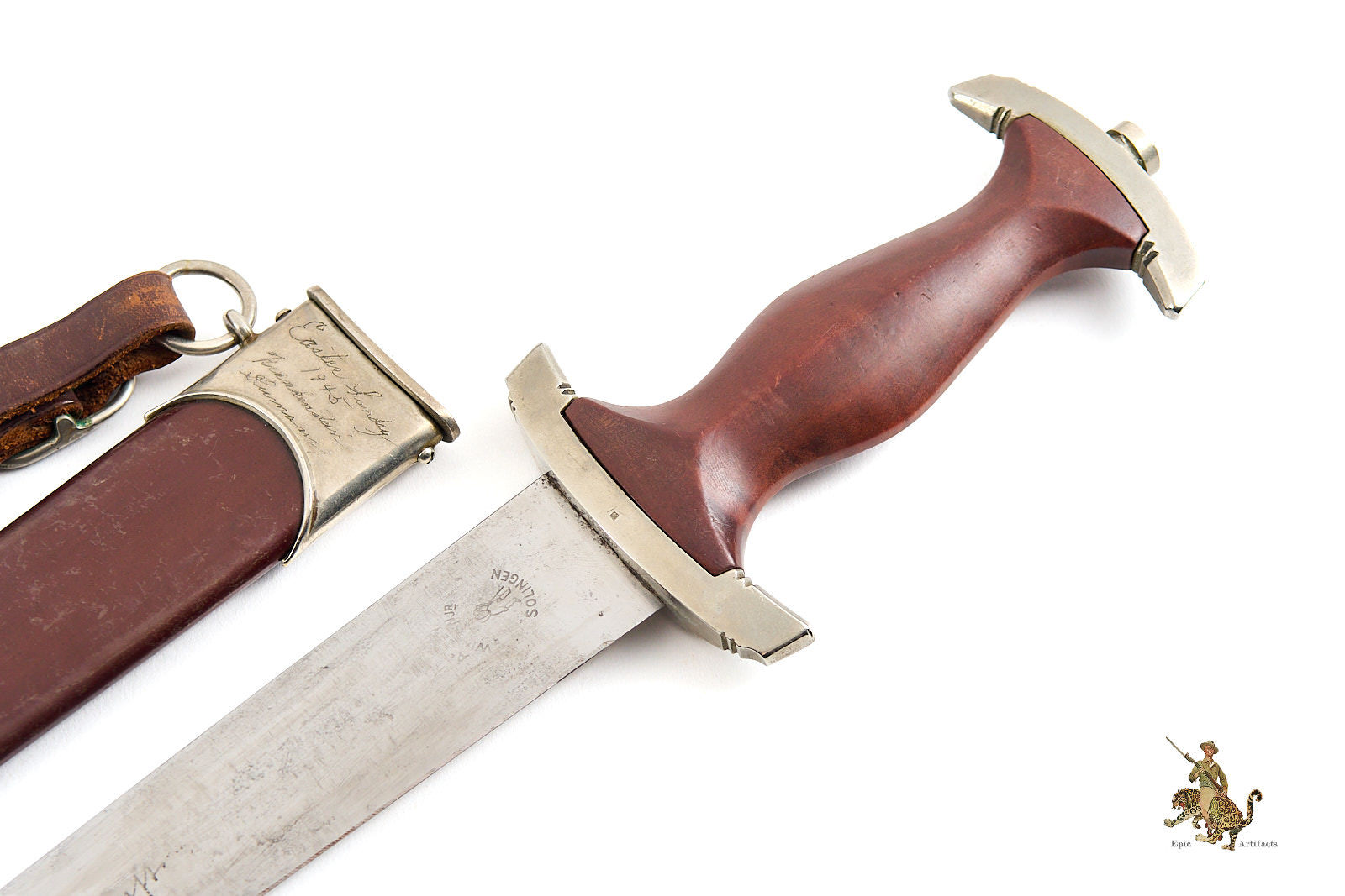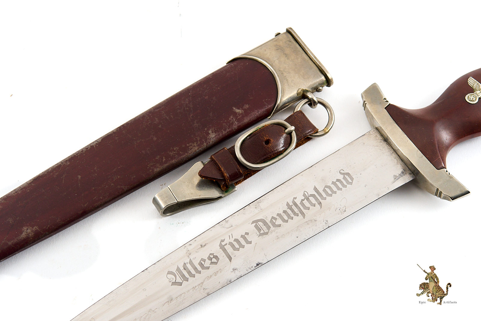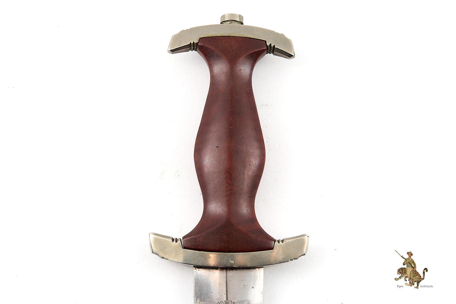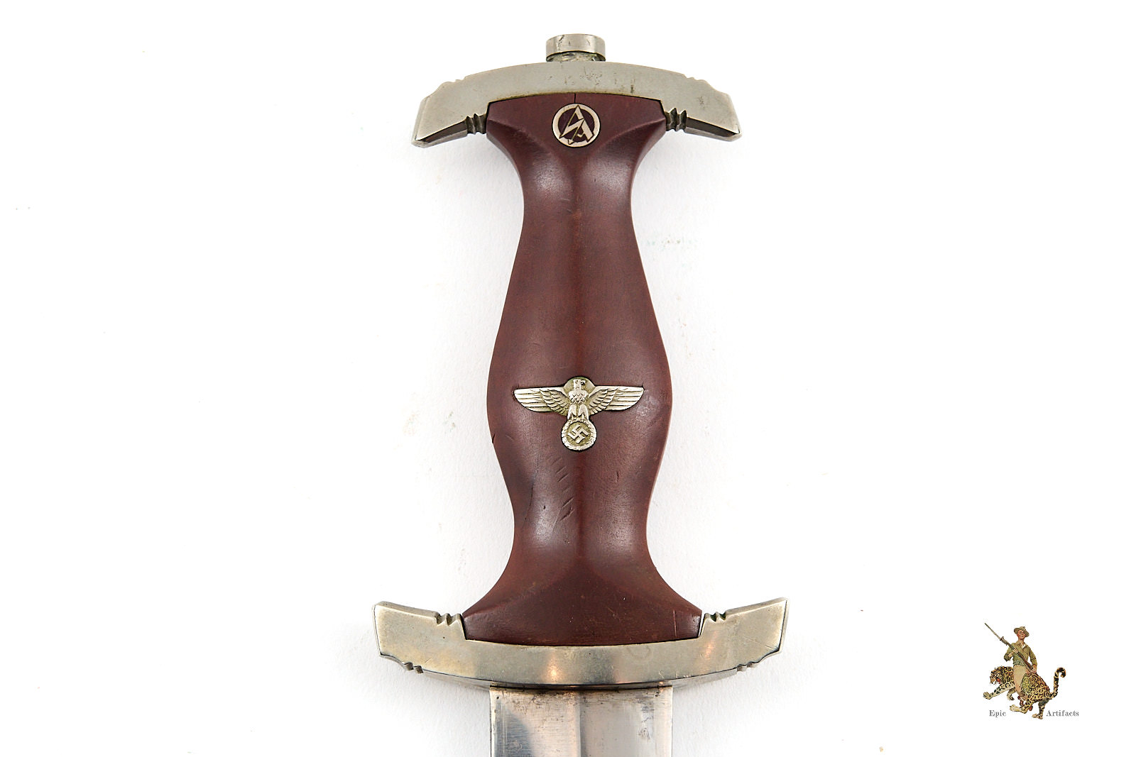 Historical Description: The “Sturmabteilung” (SA), formed in 1921, was the original paramilitary branch of the Nazi party. With the Nazi rise to power in 1933, a dress dagger was introduced for wear with the iconic “brown shirt” uniform. As the SA was a huge organization, with an eventual strength of close to three million men, there was a huge demand for these daggers, and they were produced by 123 different makers, from larger factories to small, cottage-industry workshops. The daggers featured a wood grip with an inset enameled SA emblem and the German national eagle and swastika emblem. The blade was etched with the motto of the SA, “Alles für Deutschland.” The early daggers were crafted with the utmost quality, in both workmanship and materials. Originally, the name and logo of each manufacturer was etched on the reverse of the blade. These early daggers featured hand-fitted nickel silver fittings, and scabbards that had an anodized coating. Prior to around 1935, the daggers were stamped with an SA group letter on the reverse of the crossguard. In 1936, the Reichszeugmeisterie der NSDAP (RZM) organization began to standardize the manufacture of the SA dagger. Commercial type manufacturer markings were to be eliminated and replaced with the RZM logo, as well as an RZM code, to indicate the manufacturer. Late production daggers marked with RZM logos usually are made with plated zinc fittings and have aluminum grip eagles. Instead of the early anodizing process, later scabbards were simply painted. During the transitional period around 1936, many daggers were manufactured bearing the RZM logo and maker code in combination with the earlier type maker names and logos. These transitional daggers can be found with early or late features, or a mix of both.