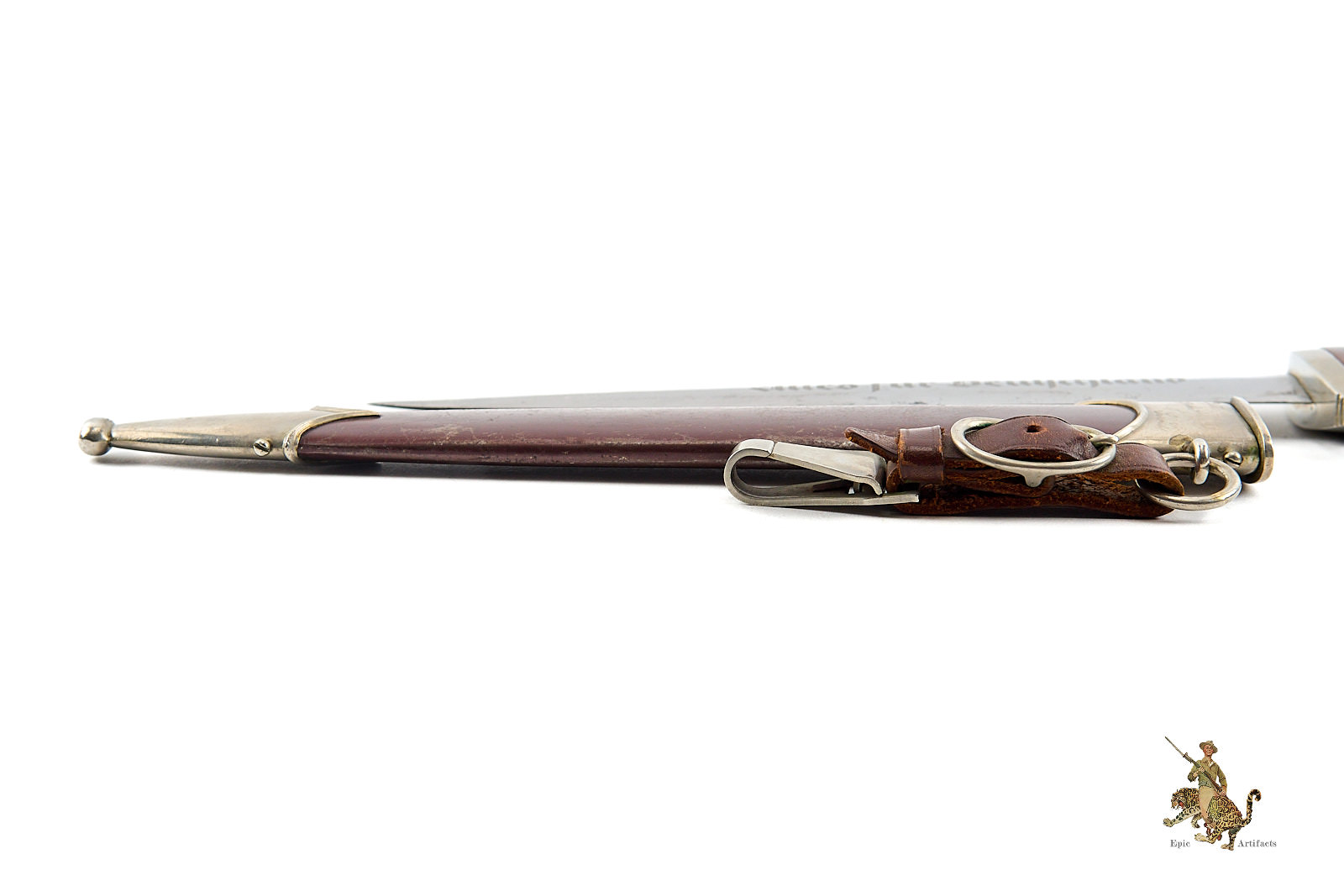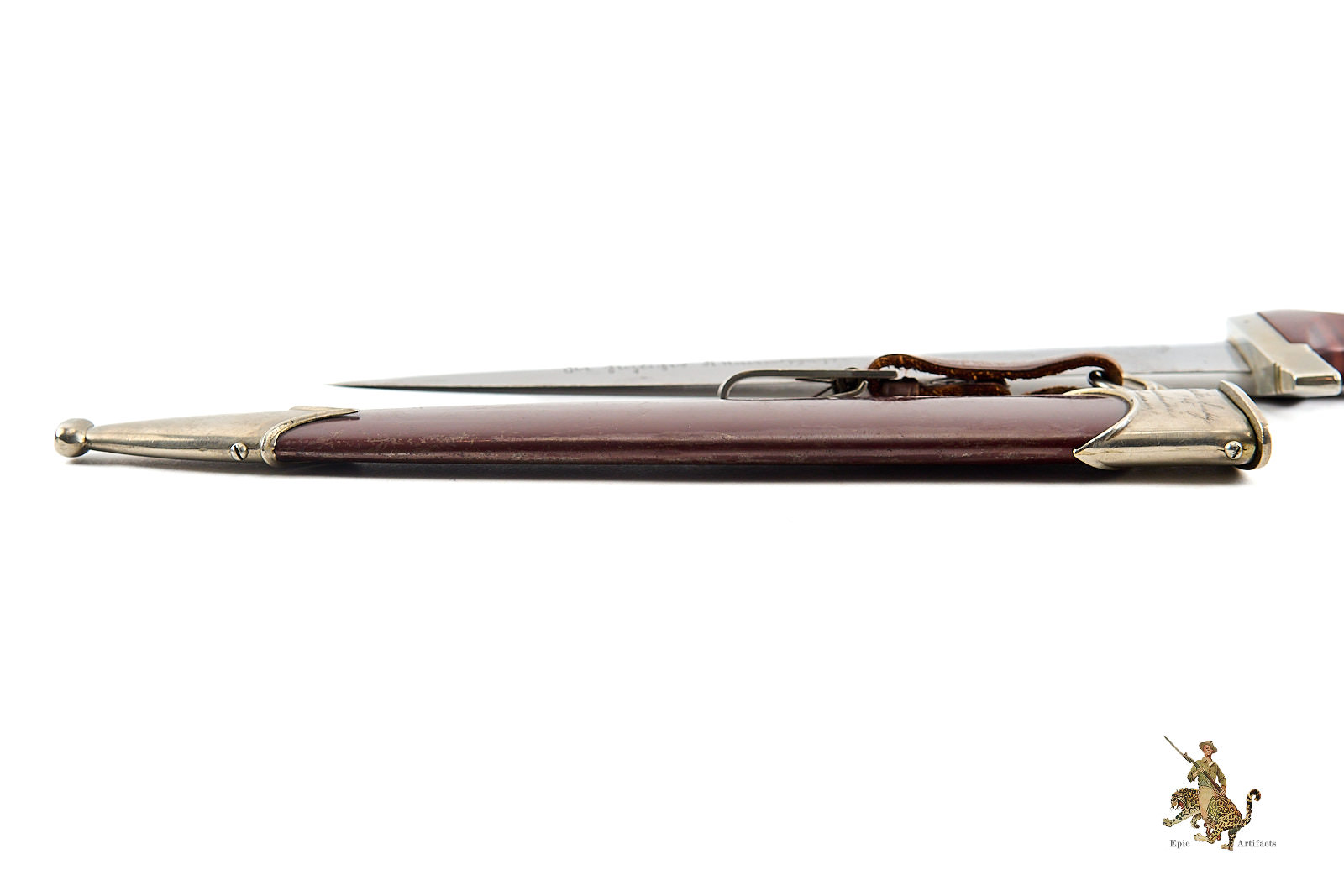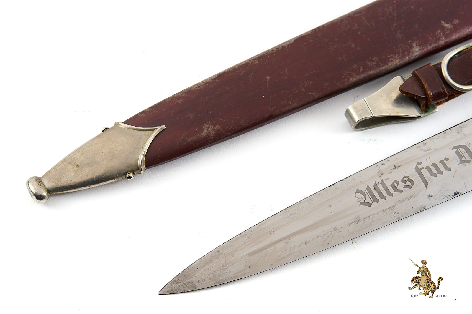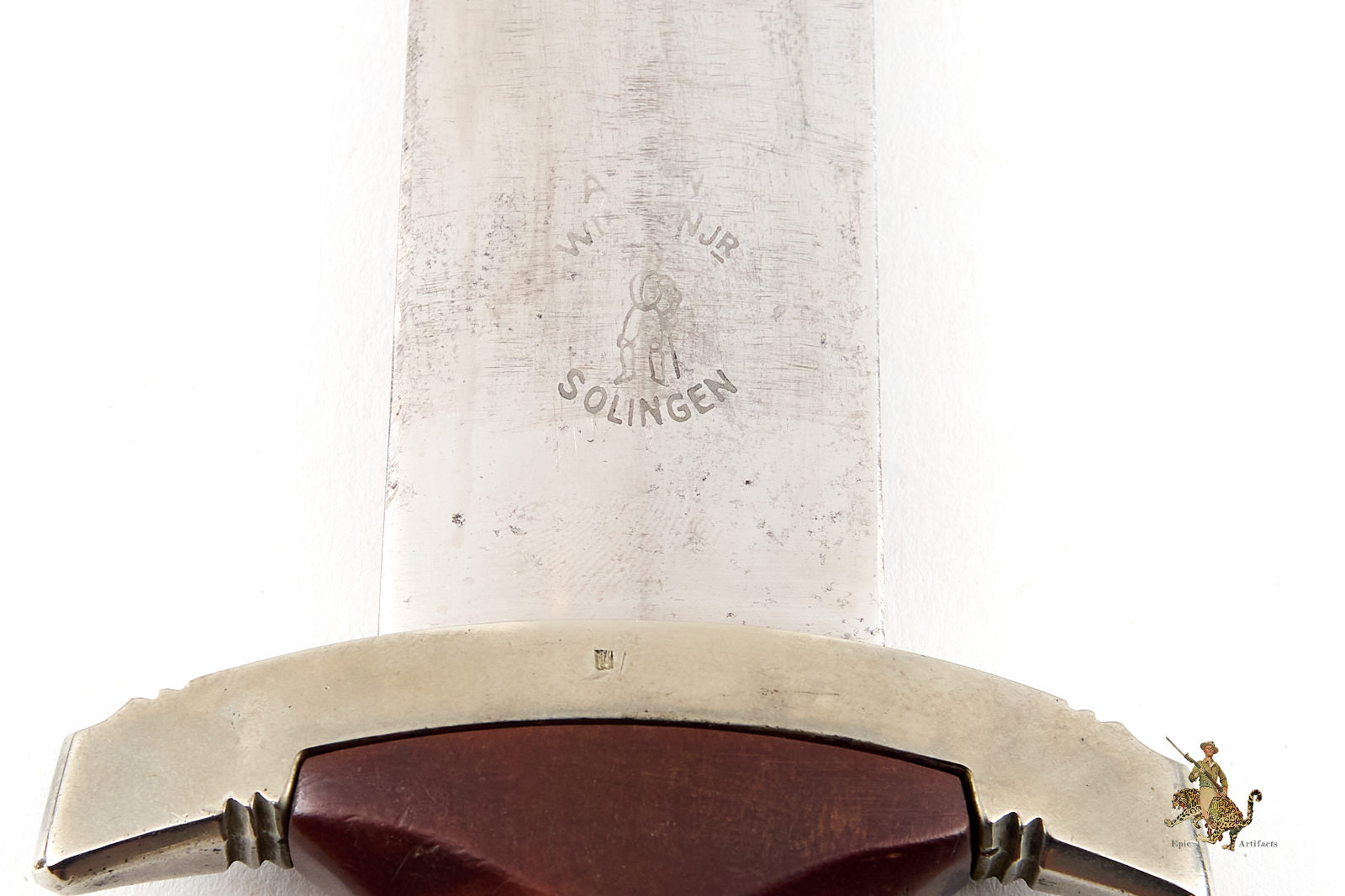 Historical Description: The “Sturmabteilung” (SA), formed in 1921, was the original paramilitary branch of the Nazi party. With the Nazi rise to power in 1933, a dress dagger was introduced for wear with the iconic “brown shirt” uniform. As the SA was a huge organization, with an eventual strength of close to three million men, there was a huge demand for these daggers, and they were produced by 123 different makers, from larger factories to small, cottage-industry workshops. The daggers featured a wood grip with an inset enameled SA emblem and the German national eagle and swastika emblem. The blade was etched with the motto of the SA, “Alles für Deutschland.” The early daggers were crafted with the utmost quality, in both workmanship and materials. Originally, the name and logo of each manufacturer was etched on the reverse of the blade. These early daggers featured hand-fitted nickel silver fittings, and scabbards that had an anodized coating. Prior to around 1935, the daggers were stamped with an SA group letter on the reverse of the crossguard. In 1936, the Reichszeugmeisterie der NSDAP (RZM) organization began to standardize the manufacture of the SA dagger. Commercial type manufacturer markings were to be eliminated and replaced with the RZM logo, as well as an RZM code, to indicate the manufacturer. Late production daggers marked with RZM logos usually are made with plated zinc fittings and have aluminum grip eagles. Instead of the early anodizing process, later scabbards were simply painted. During the transitional period around 1936, many daggers were manufactured bearing the RZM logo and maker code in combination with the earlier type maker names and logos. These transitional daggers can be found with early or late features, or a mix of both.