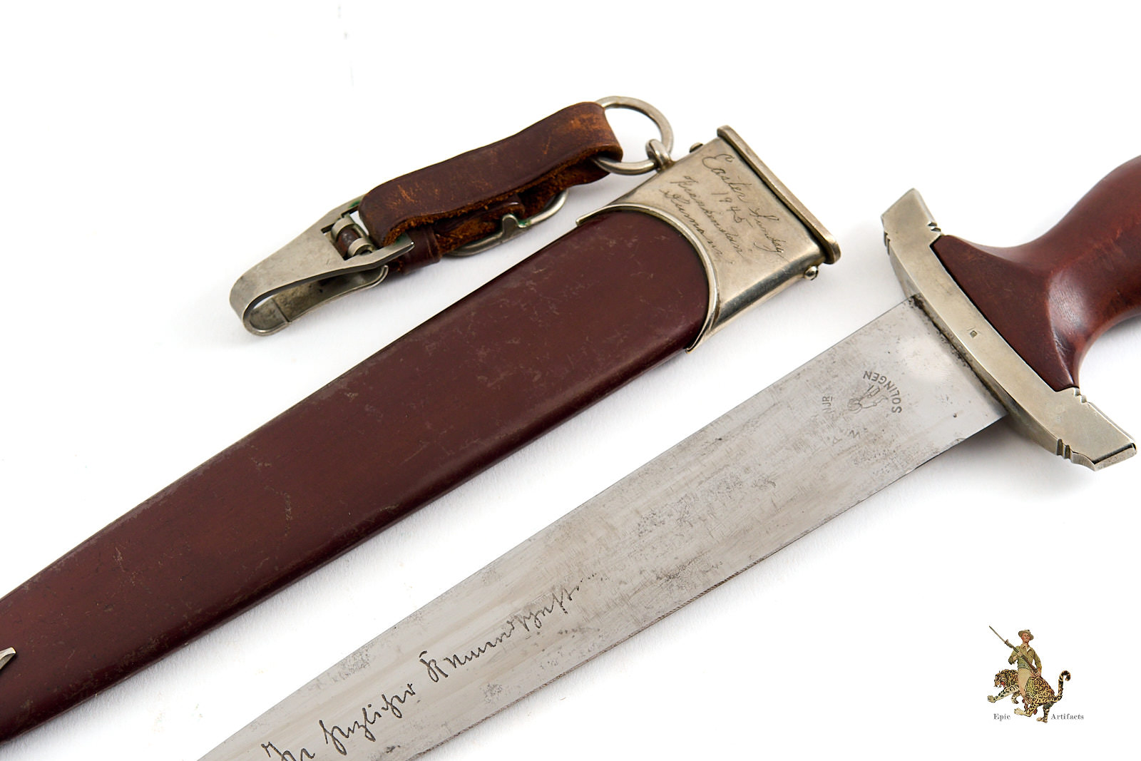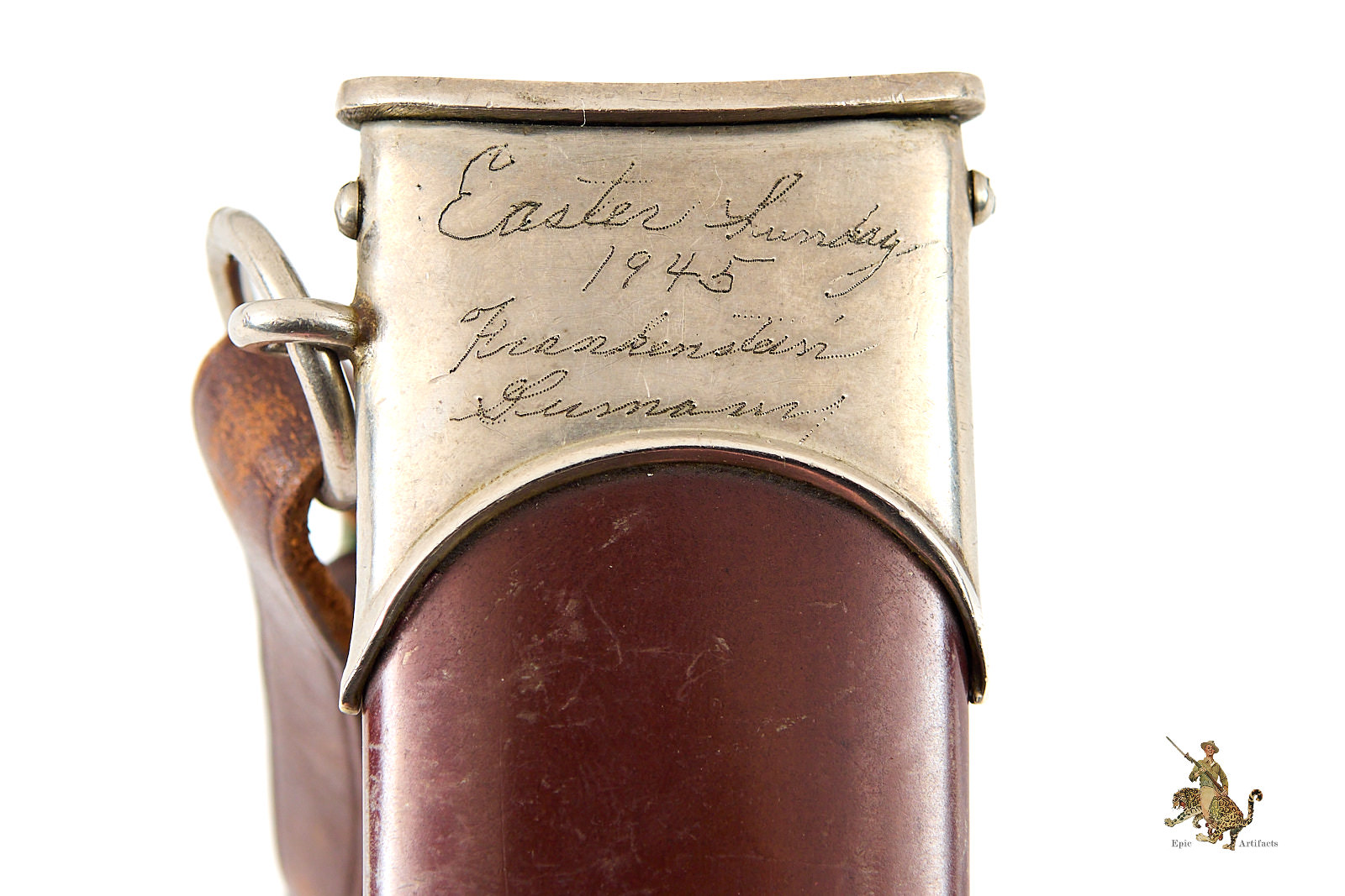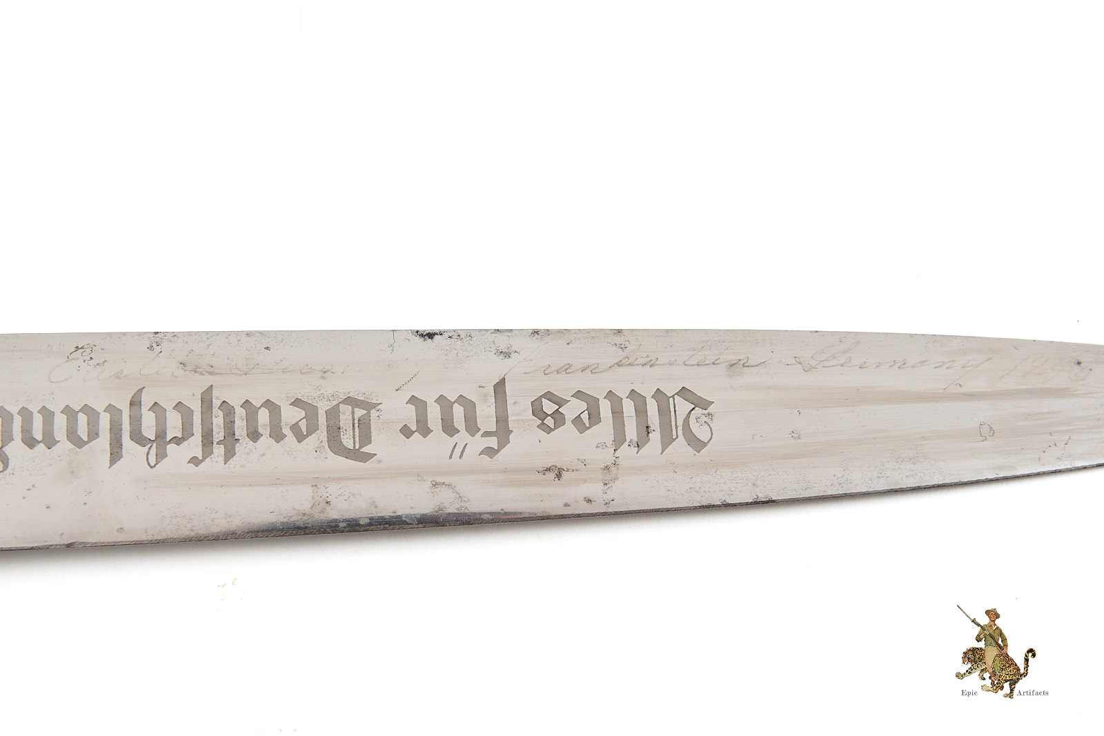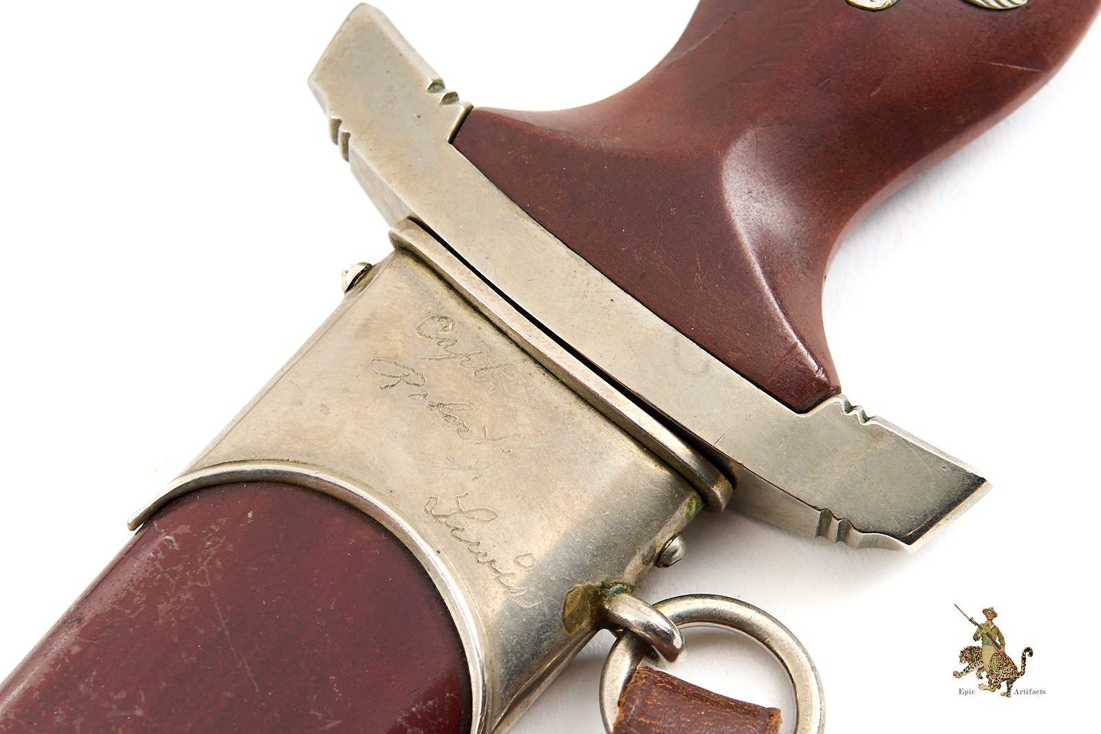Product Description:  This Early SA Partial Ground Röhm Dagger – Veteran Named, is a highly desirable and visually compelling example, distinguished by a partially ground Ernst Röhm dedication and notable personalized wartime embellishments by Capt. Robert J. Louis. The blade is in very fine condition, retaining clear original crossgraining, with the “Alles für Deutschland” motto lightly etched and visually pleasing. Above the motto is a finely hand-etched inscription reading “Easter Sunday Frankenstein Germany 1945,” attributed to Robert J. Louis. The reverse bears the maker’s mark of Anton Wingen, and was originally etched with the Röhm dedication; this was partially ground in accordance with regulations following the Night of the Long Knives, with discernible remnants of the original inscription remaining visible—a rare and desirable feature. The blade is further Gau stamped.  The T-Nut has been turned, leaving some marking, but it doesn’t detract from the overall piece.