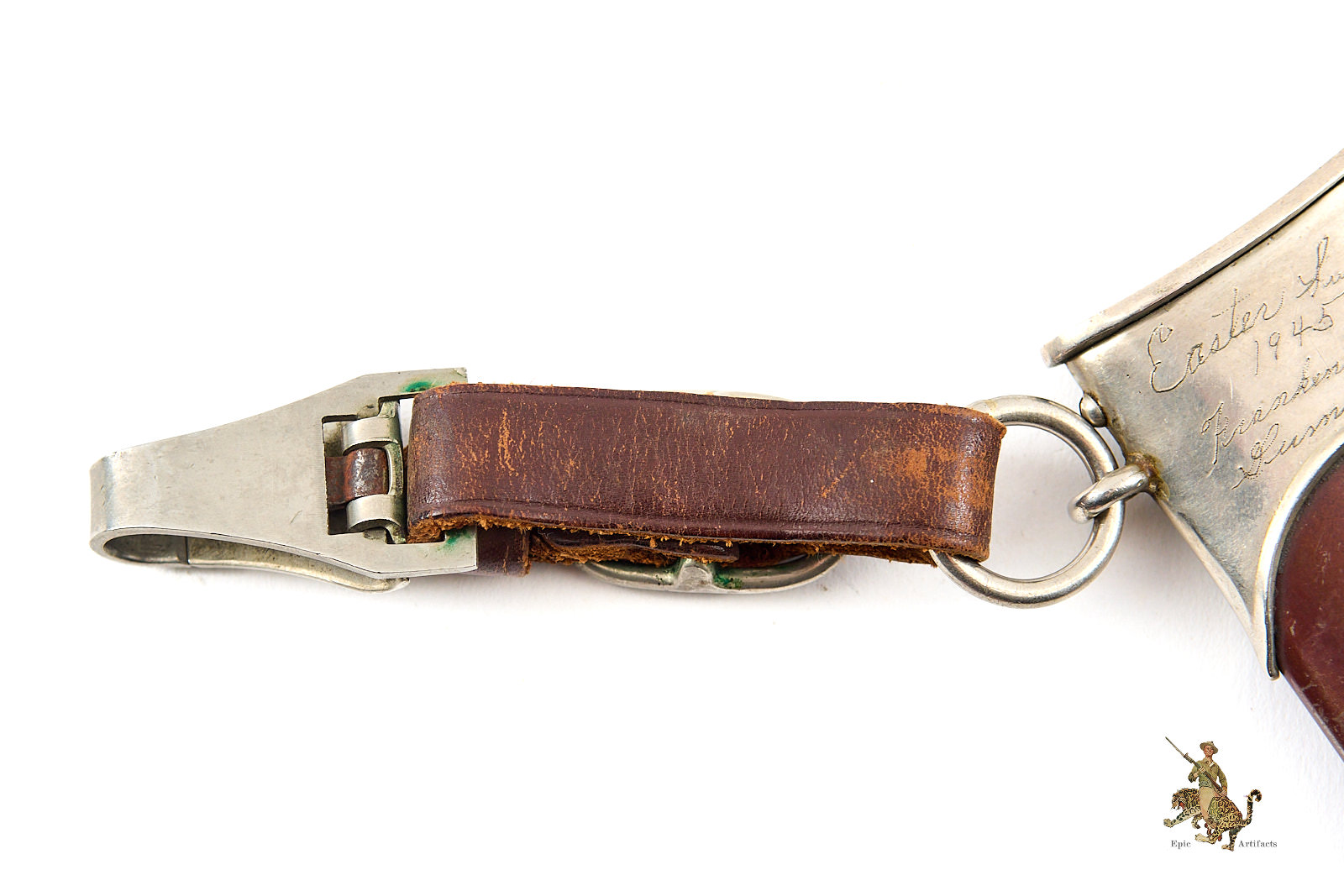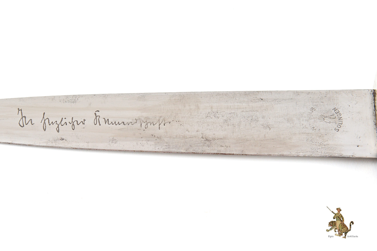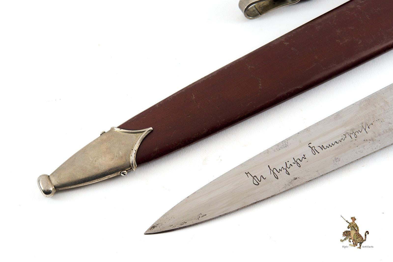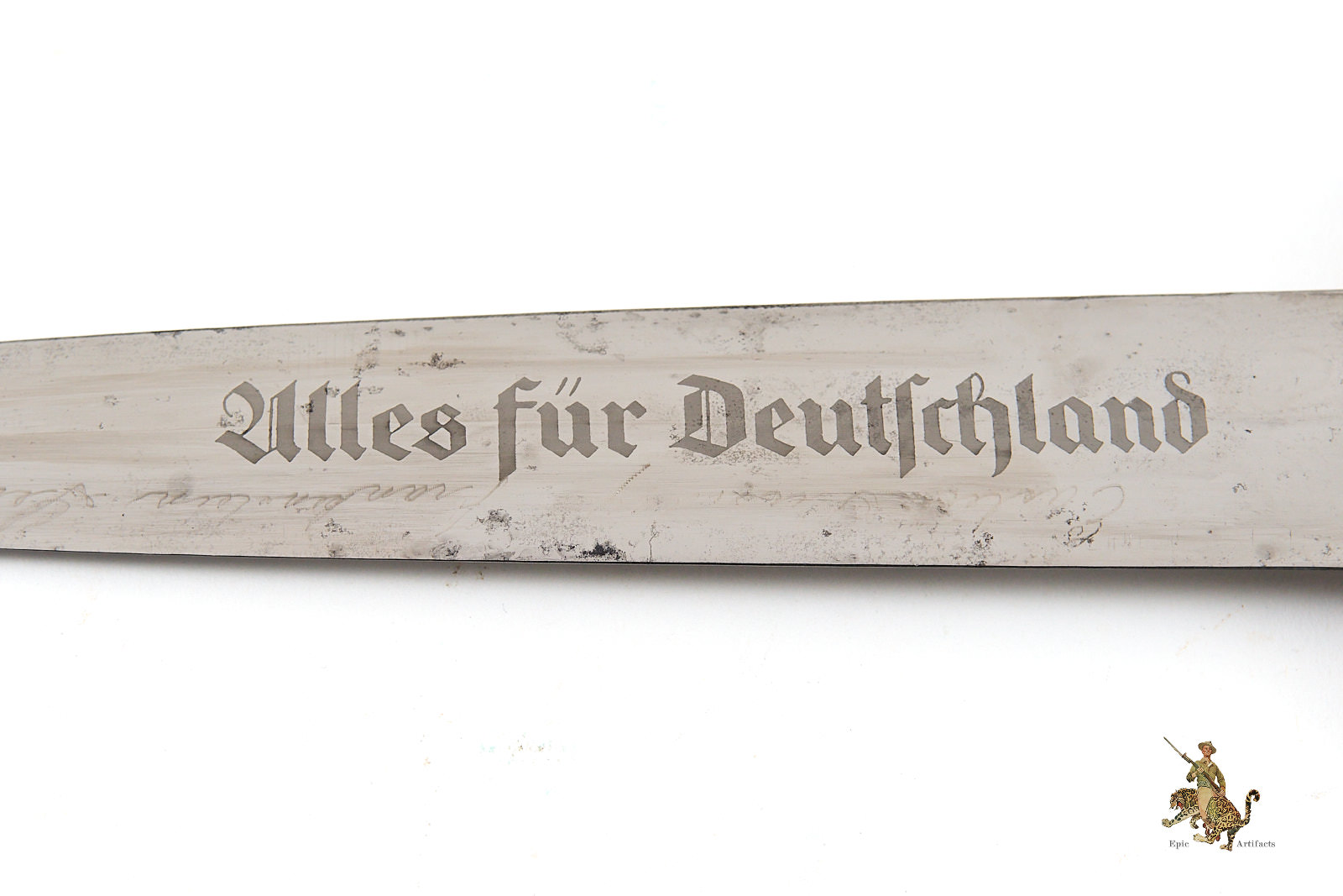 Product Description:  This Early SA Partial Ground Röhm Dagger – Veteran Named, is a highly desirable and visually compelling example, distinguished by a partially ground Ernst Röhm dedication and notable personalized wartime embellishments by Capt. Robert J. Louis. The blade is in very fine condition, retaining clear original crossgraining, with the “Alles für Deutschland” motto lightly etched and visually pleasing. Above the motto is a finely hand-etched inscription reading “Easter Sunday Frankenstein Germany 1945,” attributed to Robert J. Louis. The reverse bears the maker’s mark of Anton Wingen, and was originally etched with the Röhm dedication; this was partially ground in accordance with regulations following the Night of the Long Knives, with discernible remnants of the original inscription remaining visible—a rare and desirable feature. The blade is further Gau stamped.  The T-Nut has been turned, leaving some marking, but it doesn’t detract from the overall piece.