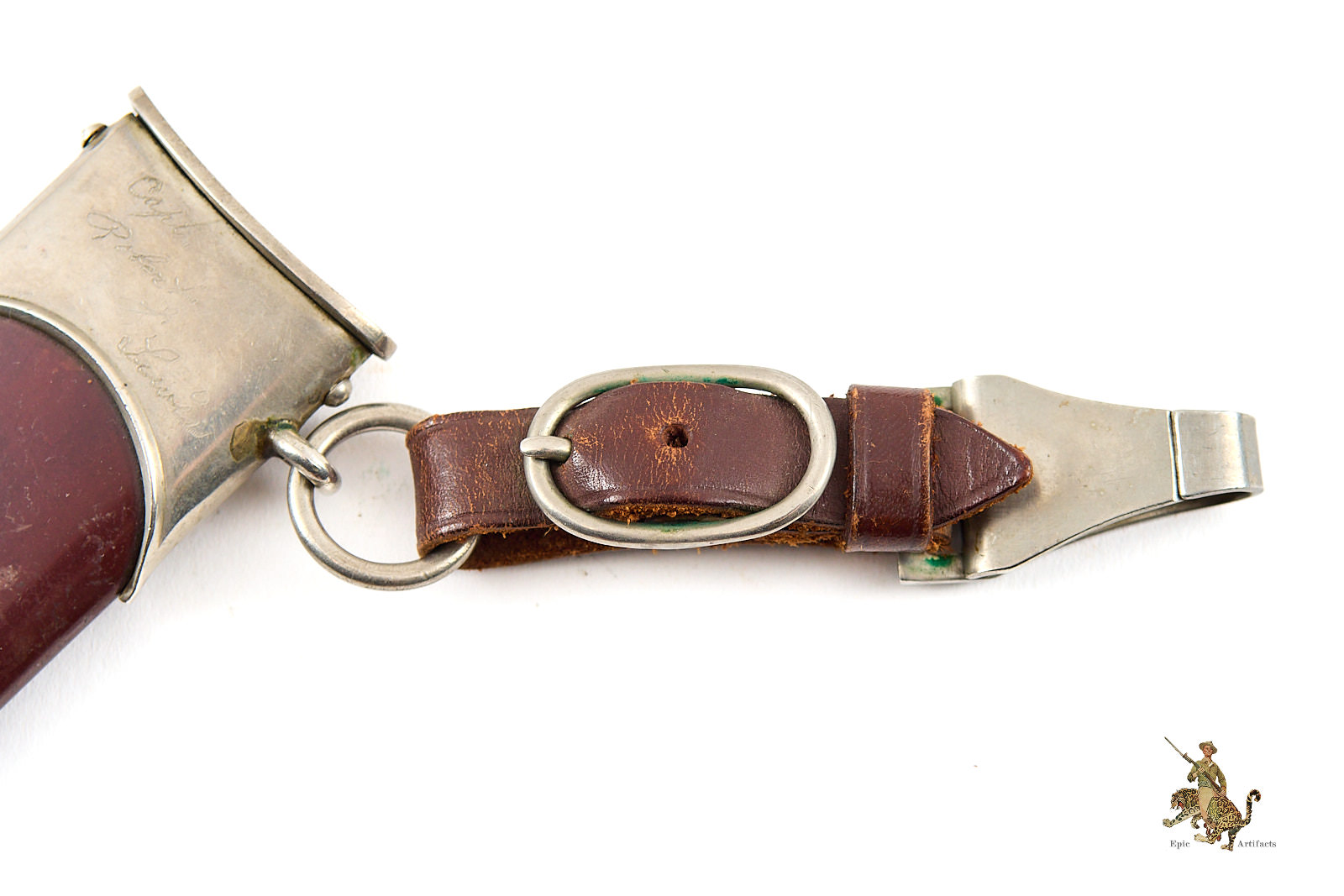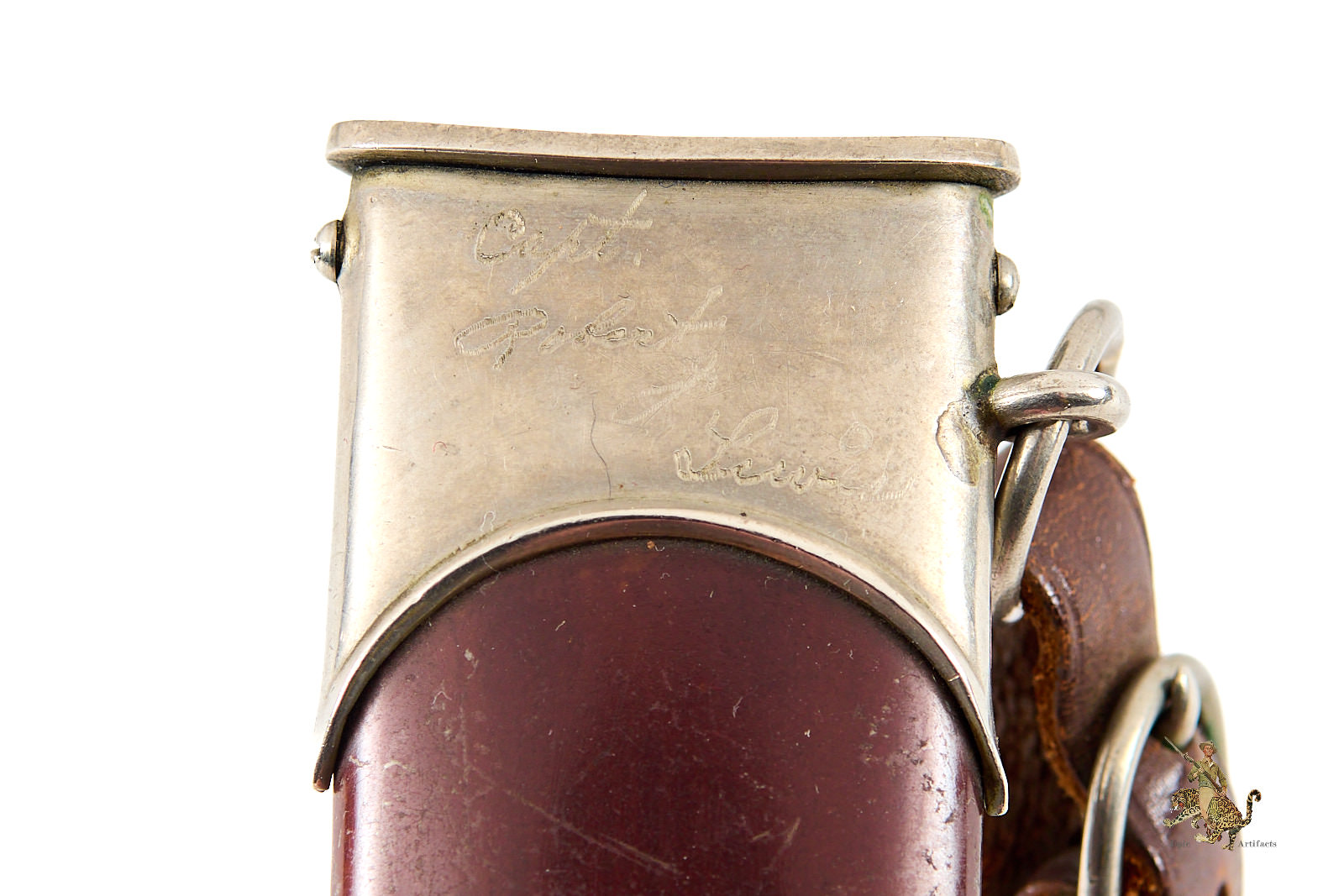 The scabbard is a textbook early type, retaining a well-preserved brown anodized finish with only minor scattered marks and limited color loss. The early nickel fittings match the hilt, with some denting to the lower fitting at the ball, as commonly encountered. The suspension ring retains an early hanger of brown leather with nickel silver fittings, complete and sound, with a fully functional spring clip.