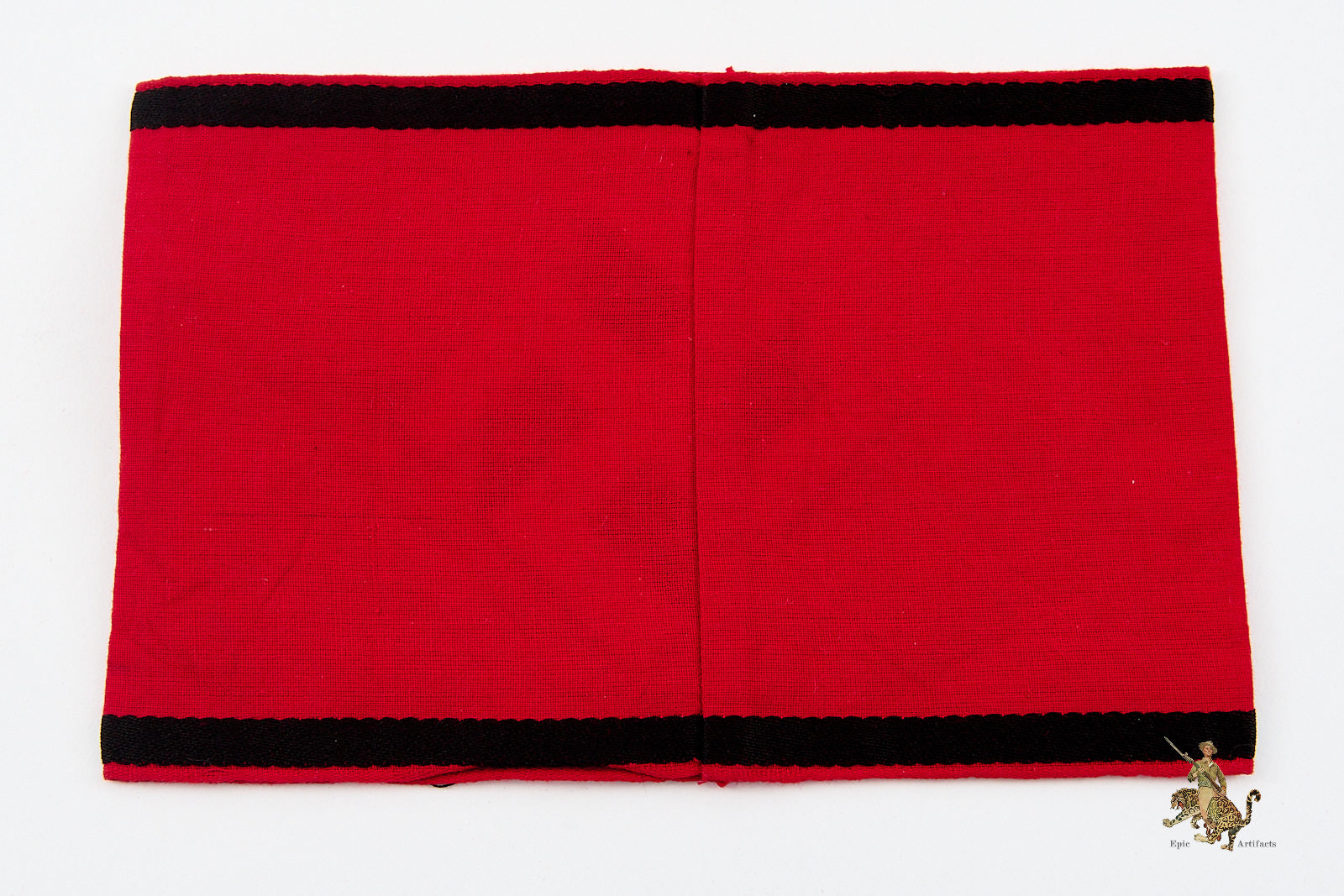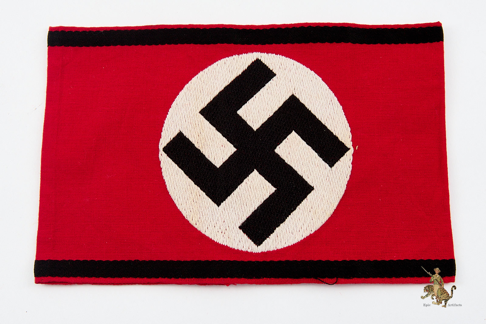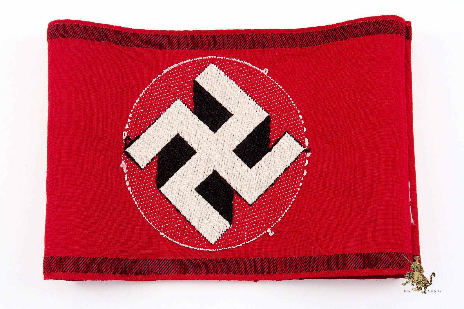 Historical Description: Nearly every military, civil, political, and paramilitary organization in existence during the Third Reich used armbands. Armbands were worn on military and civilian uniforms and also on civilian clothes, from suit jackets to work clothing. They were used to denote membership in organizations, to indicate a specific role or function of the bearer, and as insignia of rank. Many organizations would change the design of their armbands over time, which added to the variety produced. These were manufactured in countless variations, ranging from simple printed bands to elaborately hand-embroidered pieces of the highest quality. Some Nazi armbands were worn by all members of large organizations and were made by the millions. Others were intended for use at a specific time and place and were unique. Many types were made in very limited numbers. Some bore metal insignia or special identifiers that indicated the wearer’s rank, unit affiliation, or nationality. Armbands were sometimes but not always marked with ink stamps by the issuing authorities.