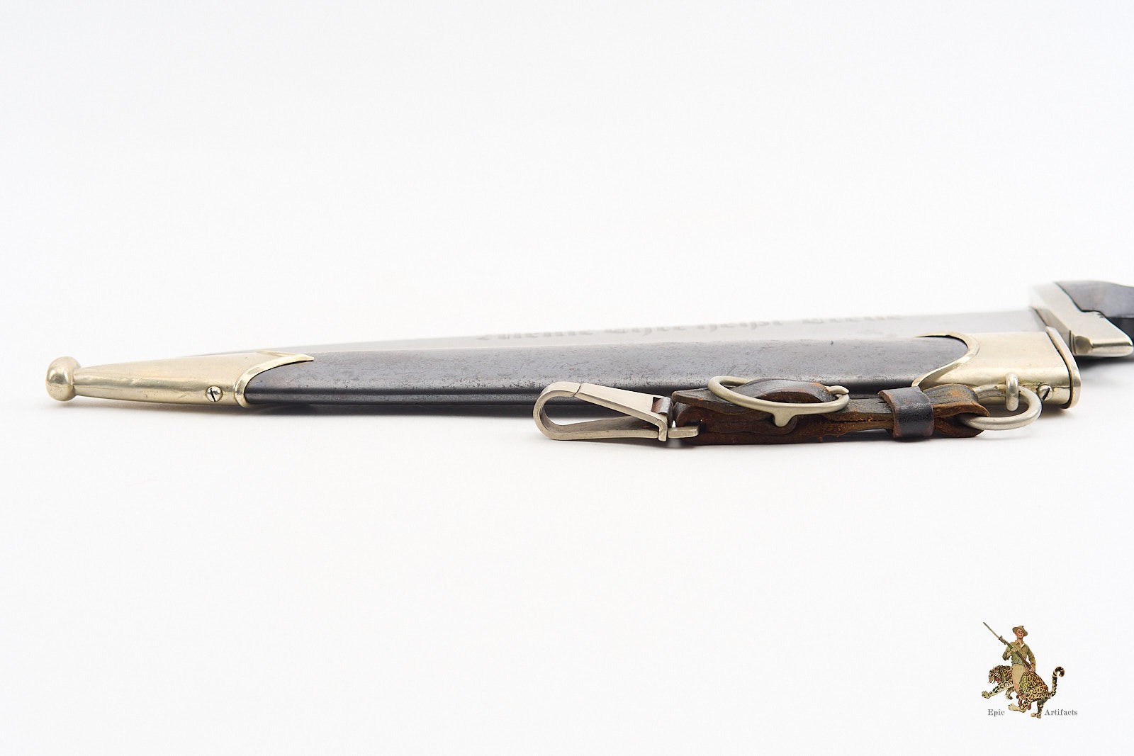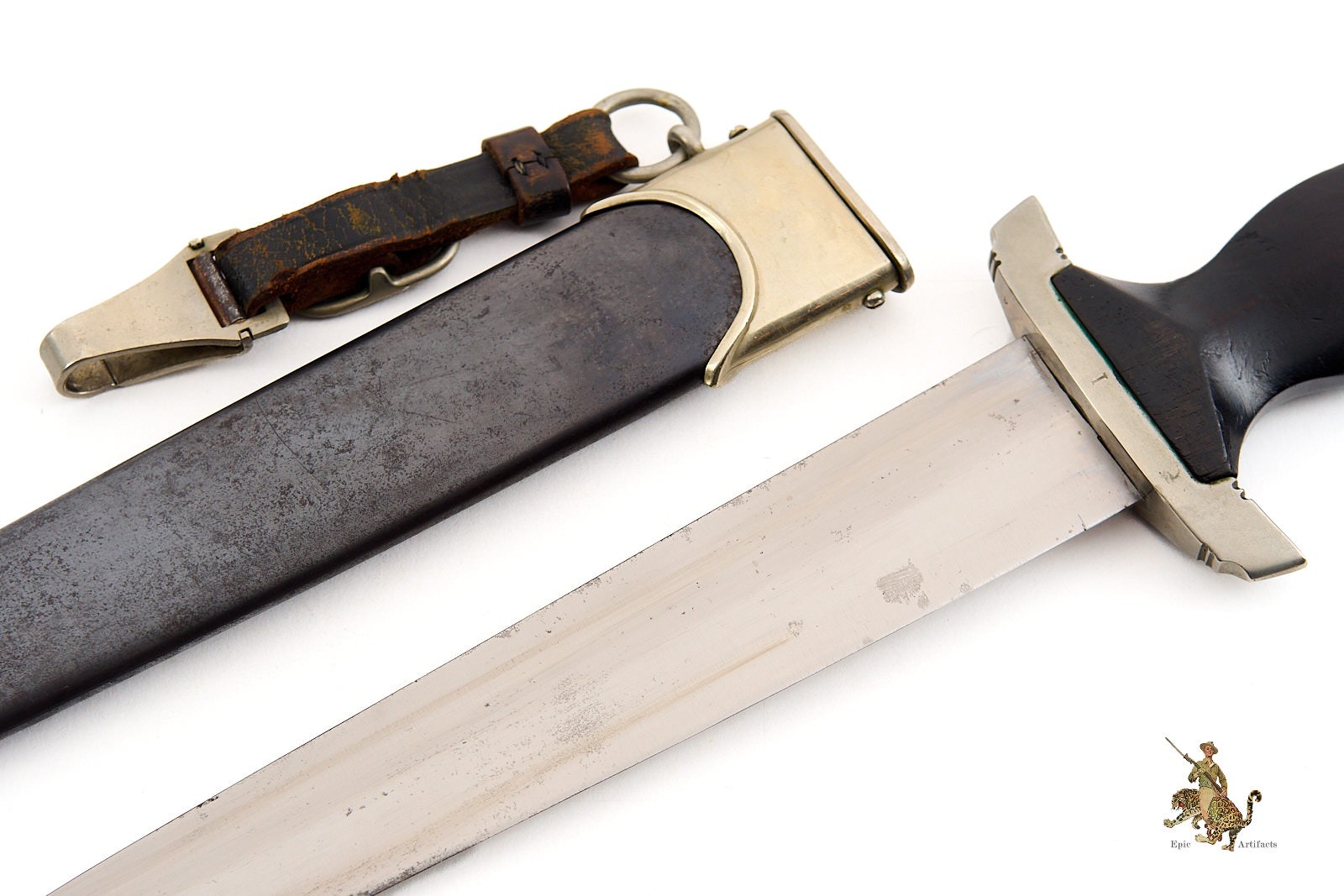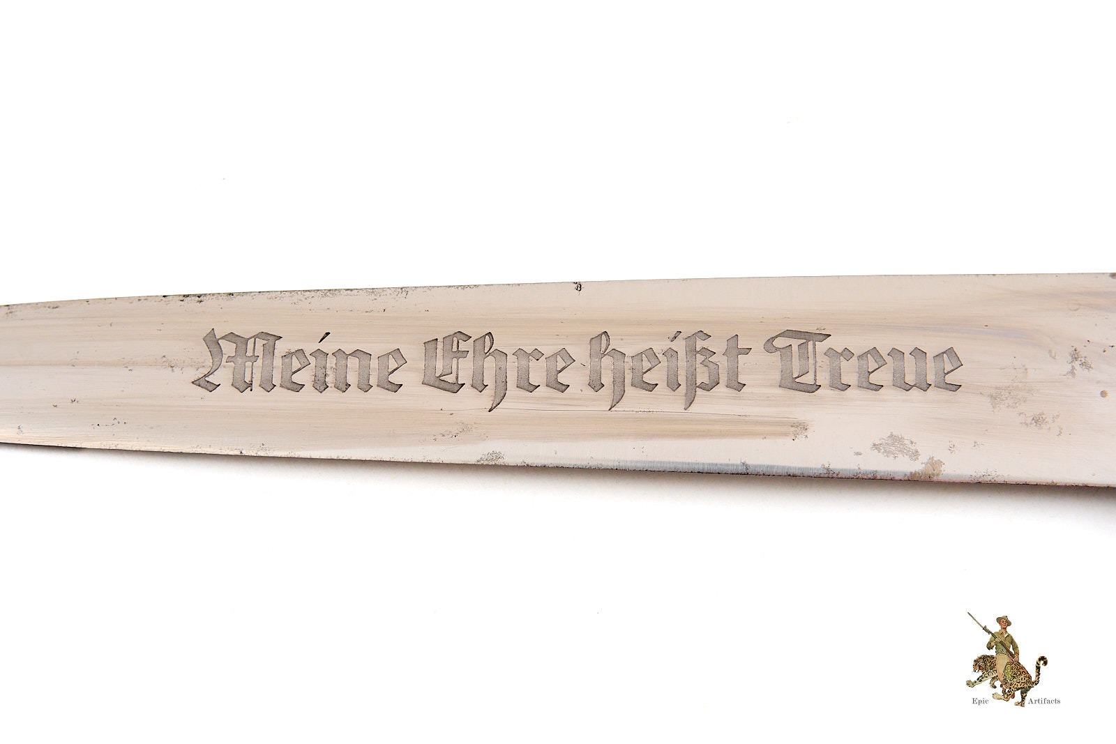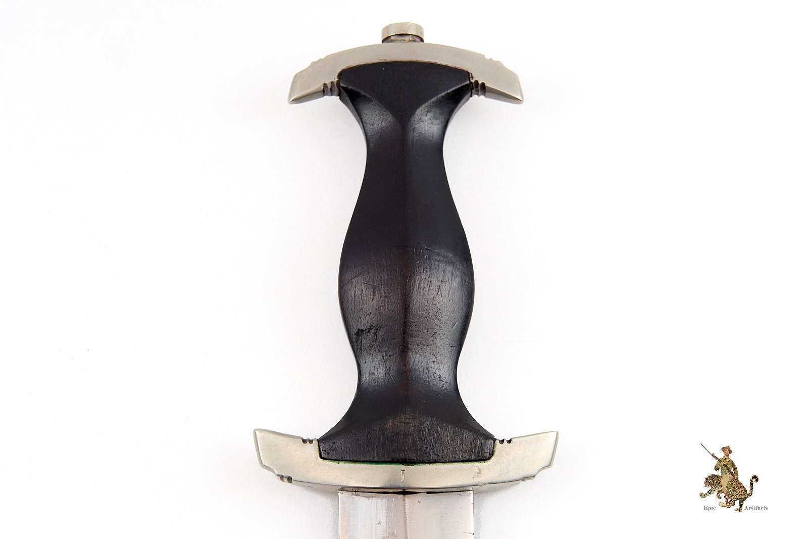 Product Description: This early Early SS Dagger – Eickhorn is a nice and extremely desirable ground Röhm example. It’s a textbook piece, with all early features. The blade shows some light age, with normal runner marks and some minimal spotting, but retains original crossgraining throughout. The crisply etched motto retains nice original darkening. The Röhm dedicationand the Carl Eickhorn makers mark has been ground off to comply with regulations after the Night of the Long Knives. The handle is beautiful, with nickel silver crossguards. The lower crossguard has the Numeral “I” on the backside of cross guard. Also has a “4” on the undertside of the crossguard. The early type grip eagle and enameled SS roundel are intact, with light patina and no damage. The wooden grip shows no chips or cracks. This early Early SS Dagger – Eickhorn is complete with its correct early scabbard. The scabbard body retains nearly all of the original black anodized finish, with scattered marks and freckling. The nickel silver scabbard fittings match the handle perfectly. The lower fitting ball has a knock in it and has mushroom out. which is typical on these early daggers. The suspension ring is intact, and retains a correct, early type roller hanger, made of brown leather with nickel silver fittings and a functional spring clip. This is an attractive, Early SS Dagger – Eickhorn – Ground Röhm, with great visual appeal. The condition is excellent.