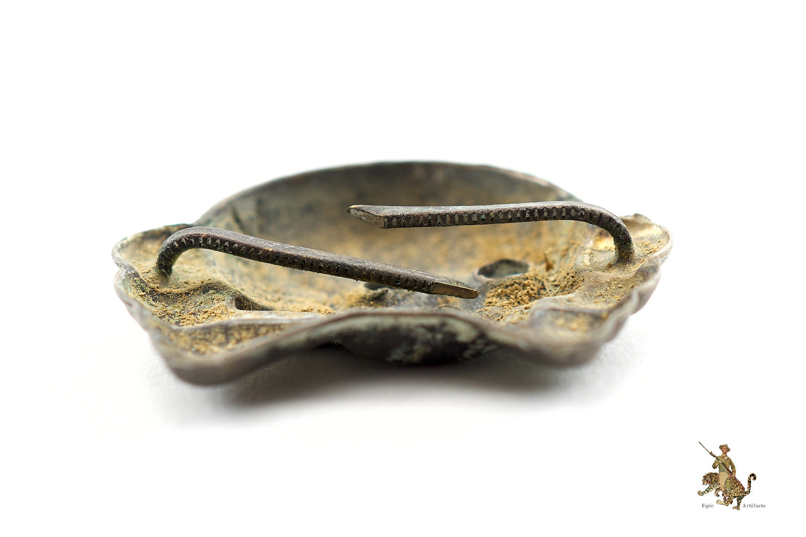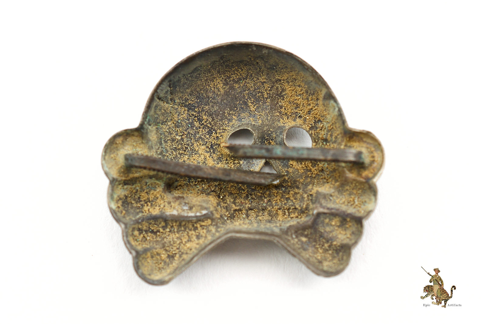 The reverse preserves both original attachment prongs, intact and fully functional, indicative of careful preservation. Minor wear to the raised surfaces reveals the underlying base metal, enhancing the visual depth of the design while attesting to authenticity and period use. A scarce and historically significant artifact of early Third Reich uniform development, this Early SS/SA Visor Cap Skull – CUPAL represents an important example of pre-RZM insignia and remains in excellent condition overall.