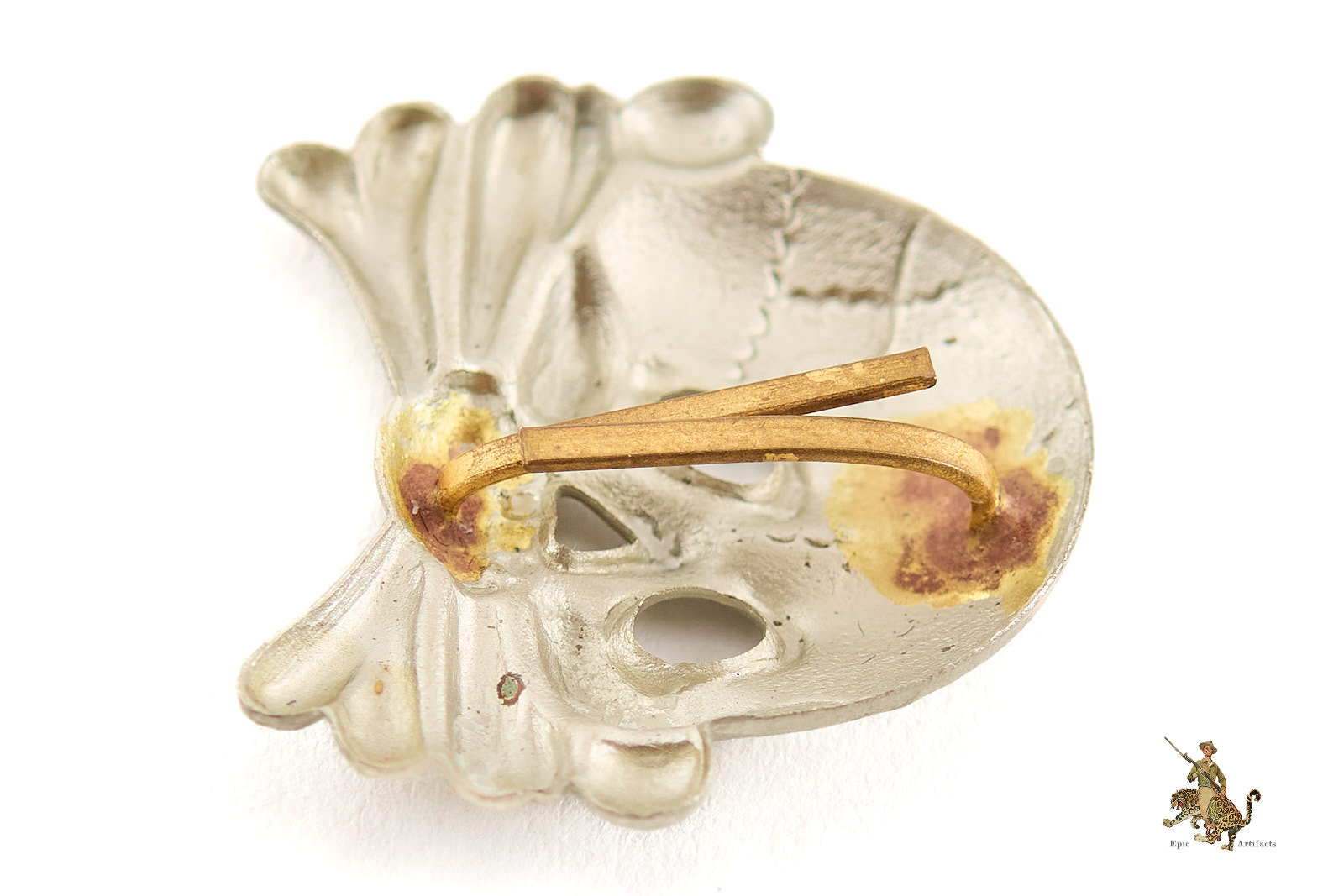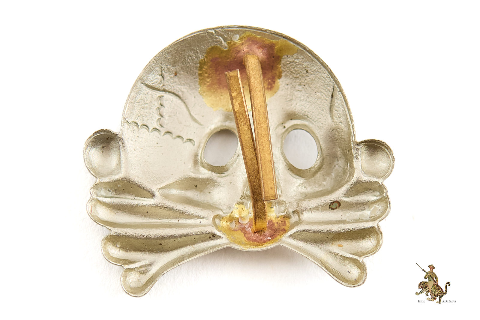 Historical Description: The SS was founded as a paramilitary branch of the Nazi Party in 1925. Beginning in 1927, the SS began to wear a German national eagle and swastika emblem on their headgear. The SS were the first to adopt this practice, but the SA and other Nazi organizations soon began to use the same pinned-on metal cap eagle, which became known as a “political” type cap eagle as it was different from those used by the various military branches. Beneath this eagle, instead of a wreathed national colors cockade, the early SS wore a jawless skull emblem, sometimes called a “Danziger” skull, which was based on a traditional “Totenkopf” death’s-head emblem that had been used in the Prussian military since the time of Frederick the Great. This jawless skull is referred to by collectors as the first pattern SS skull. On October 6, 1934, the SS introduced a new pattern of cap skull that was unlike the traditional design that had previously been adopted. This second pattern SS skull was used until the end of WWII and is the iconic Totenkopf widely associated with the SS today. It was initially worn in conjunction with the political style cap eagle, but in February 1936 the SS introduced a new type of cap eagle to differentiate from other political organizations. This eagle had longer wings than the early political type, and was the pattern worn by the SS together with the second pattern Totenkopf, until 1945. Early SS cap insignia was made from a variety of materials including aluminum, which was left bare, and Tombak, a brass alloy, which was treated with a silver finish. Some examples were made of a composite material called CupAl, which is made by coating aluminum with copper sheet using a special mechanical process. Later, during the later years of WWII, SS cap insignia was generally made of zinc that was treated with a silver wash. As with all SS regalia, SS cap insignia is very collectible today.