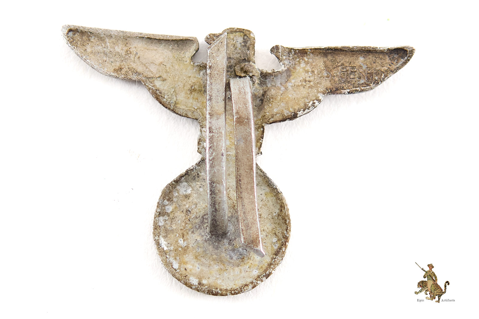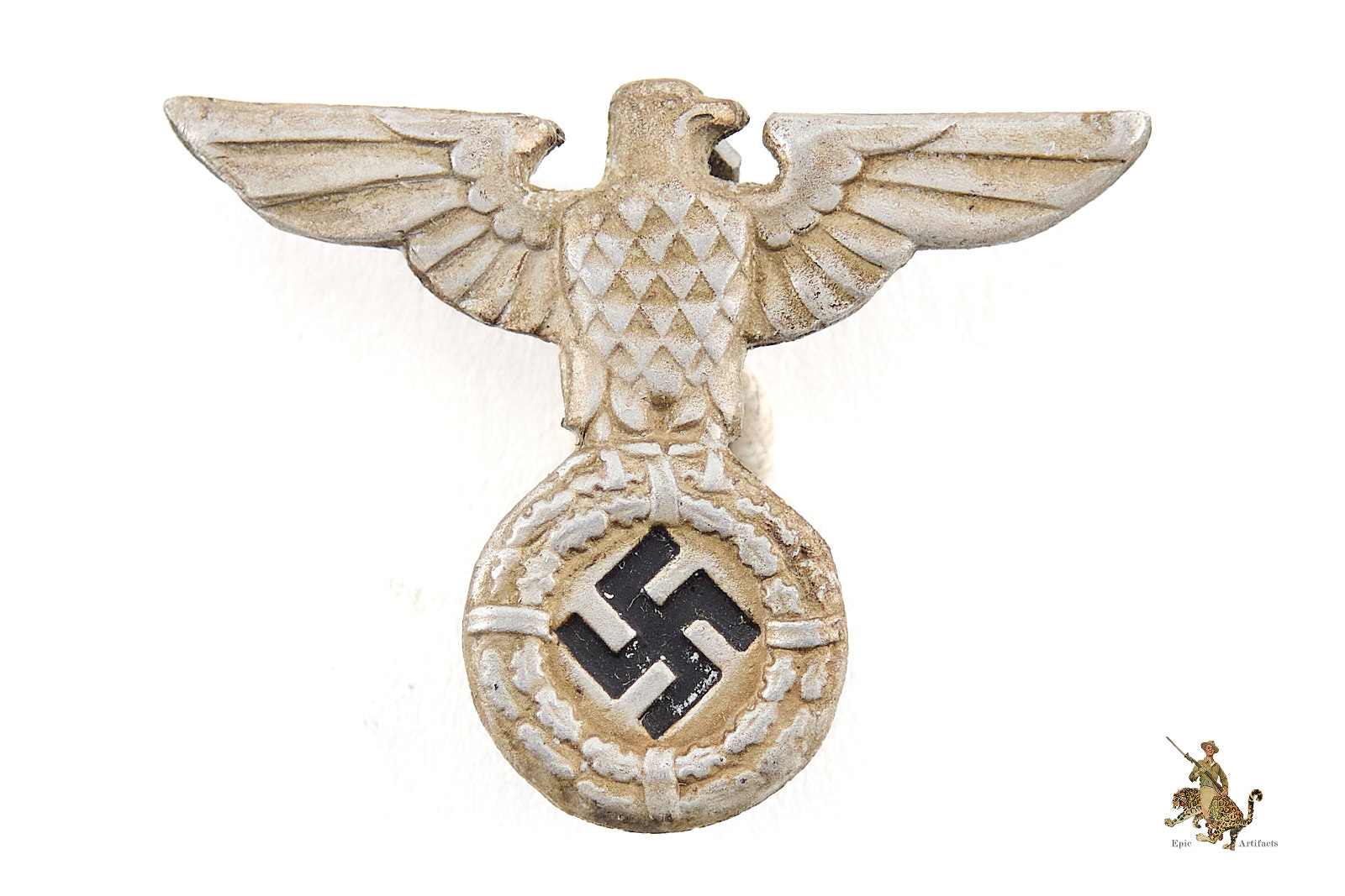 Historical Description: The SS was founded as a paramilitary branch of the Nazi Party in 1925. Beginning in 1927, the SS began to wear a German national eagle and swastika emblem on their headgear. The SS were the first to adopt this practice, but the SA and other Nazi organizations soon began to use the same pinned-on metal cap eagle, which became known as a “political” type cap eagle as it was different from those used by the various military branches. Beneath this eagle, instead of a wreathed national colors cockade, the early SS wore a jawless skull emblem, sometimes called a “Danziger” skull, which was based on a traditional “Totenkopf” death’s-head emblem that had been used in the Prussian military since the time of Frederick the Great. This jawless skull is referred to by collectors as the first pattern SS skull. On October 6, 1934, the SS introduced a new pattern of cap skull that was unlike the traditional design that had previously been adopted. This second pattern SS skull was used until the end of WWII and is the iconic Totenkopf widely associated with the SS today. It was initially worn in conjunction with the political style cap eagle, but in February 1936 the SS introduced a new type of cap eagle to differentiate from other political organizations. This eagle had longer wings than the early political type, and was the pattern worn by the SS together with the second pattern Totenkopf, until 1945. Early SS cap insignia was made from a variety of materials including aluminum, which was left bare, and Tombak, a brass alloy, which was treated with a silver finish. Some examples were made of a composite material called CupAl, which is made by coating aluminum with copper sheet using a special mechanical process. Later, during the later years of WWII, SS cap insignia was generally made of zinc that was treated with a silver wash. As with all SS regalia, SS cap insignia is very collectible today.