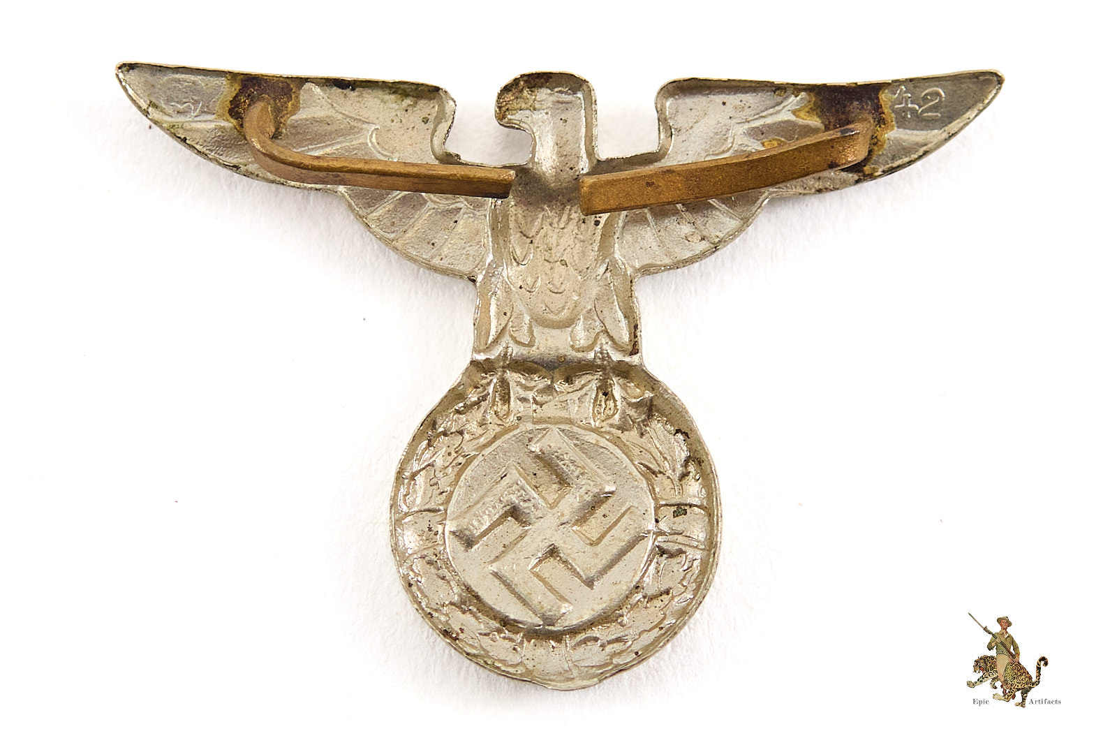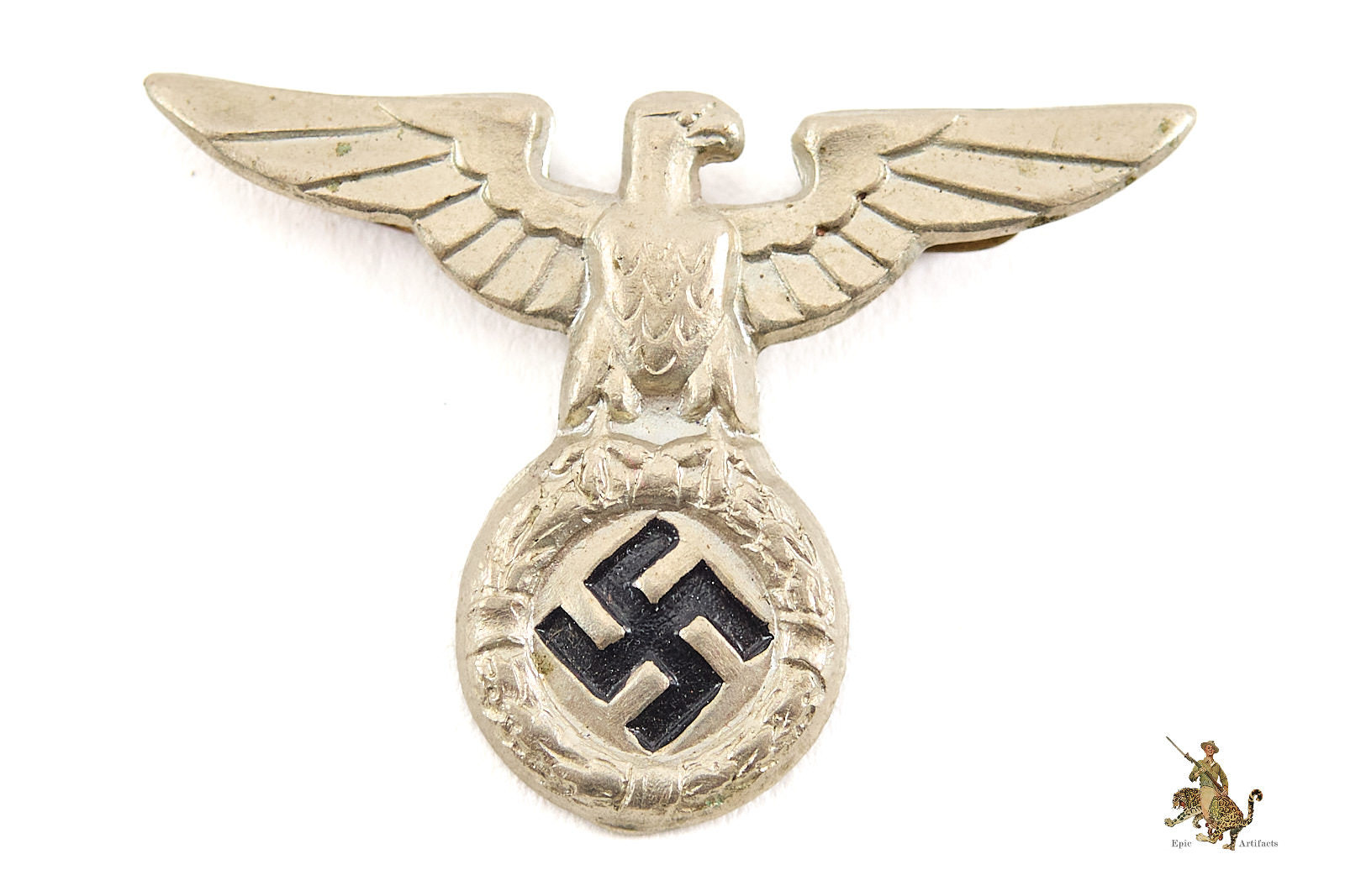 Product Description: An nice example of the Early SS/SA Visor Cap Eagle. The silvering shows little to no wear. The silver finish and black paint on the swastika are fully intact. The reverse is unmarked but continues with the same patina. Insignia rates in excellent + condition. Both original attachment prongs remain firmly intact.
