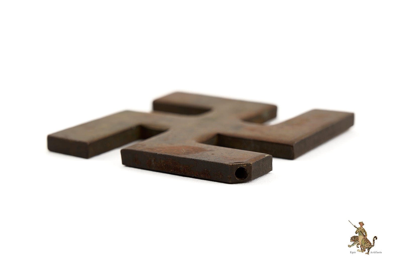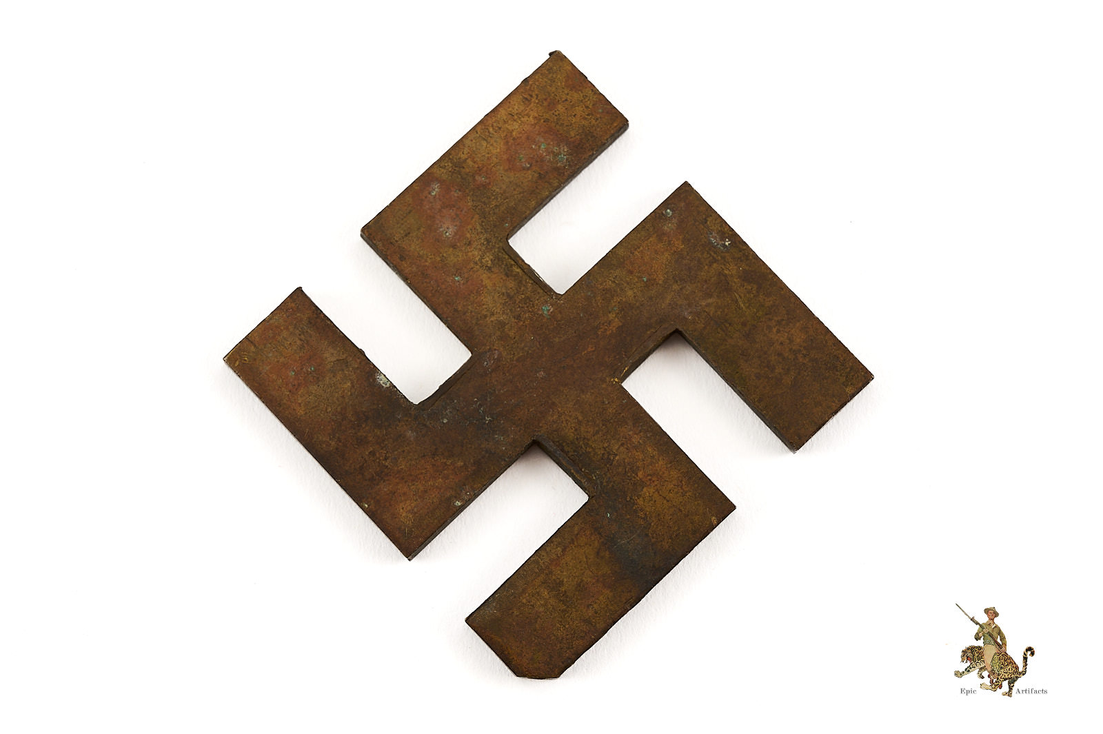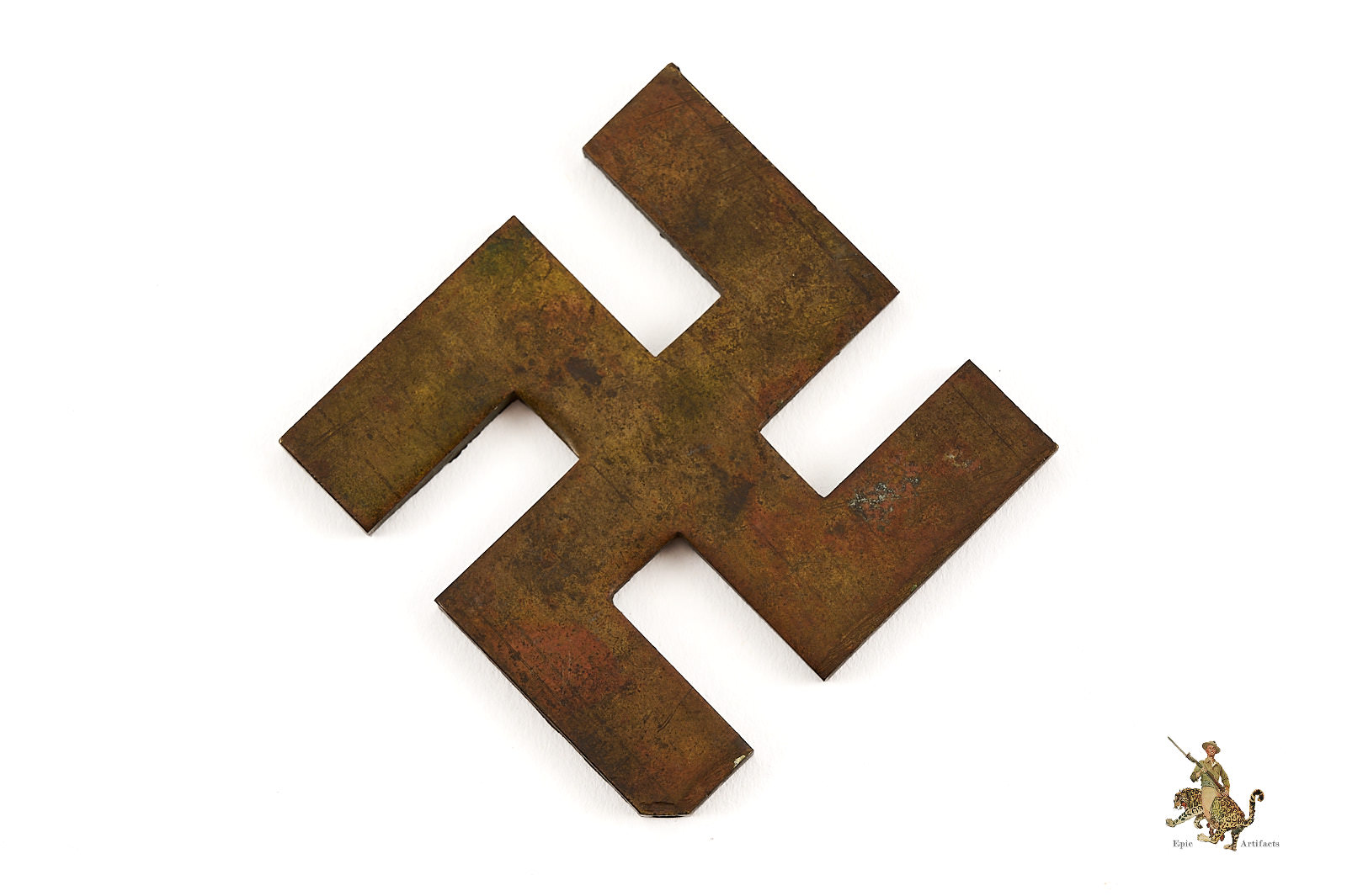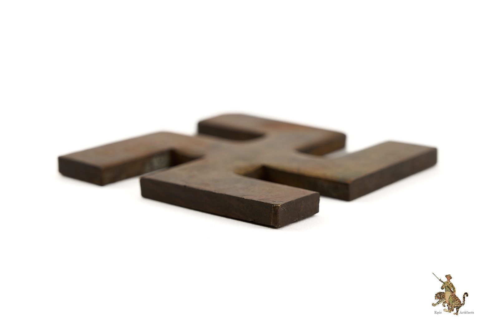 Product Description: This Early Swastika Finial Pole Top Small measures 3-1/2 inches tall, and 3-1/2 inches wide. It is a quality piece, made of a substantial brass alloy. This Third Reich pole top design features a bold-looking, cut out swastika, with a small threaded hole at the bottom for affixing it to a pole. It appears to have seen use, with some scratches and marks to the surface. This Early Swastika Finial Pole Top Small is an attractive display piece, and remains in excellent condition.