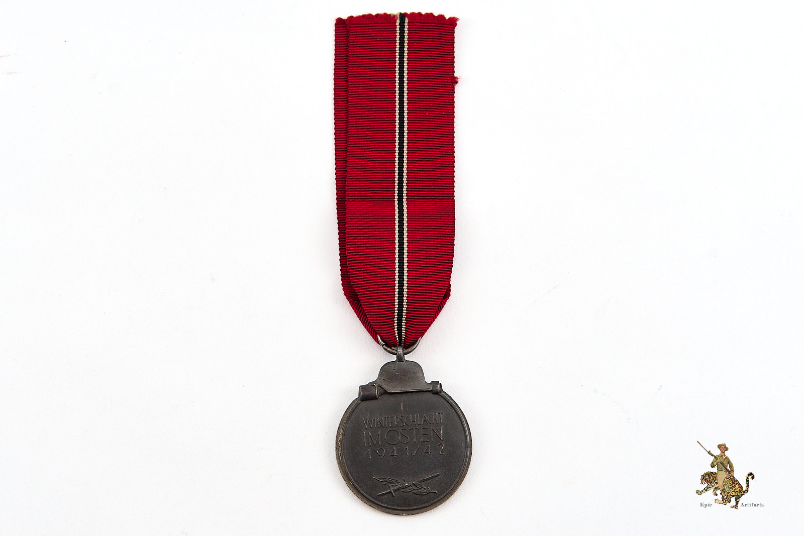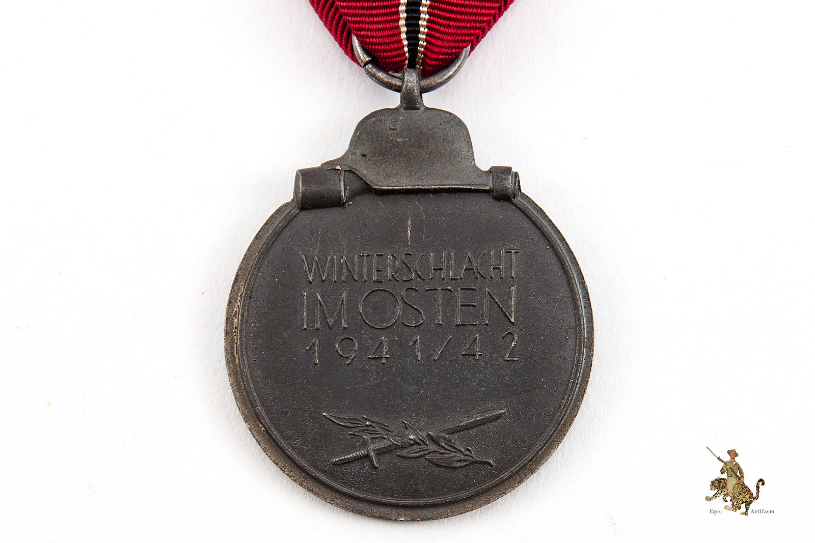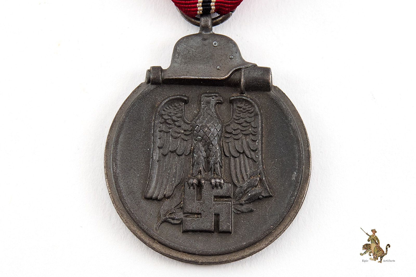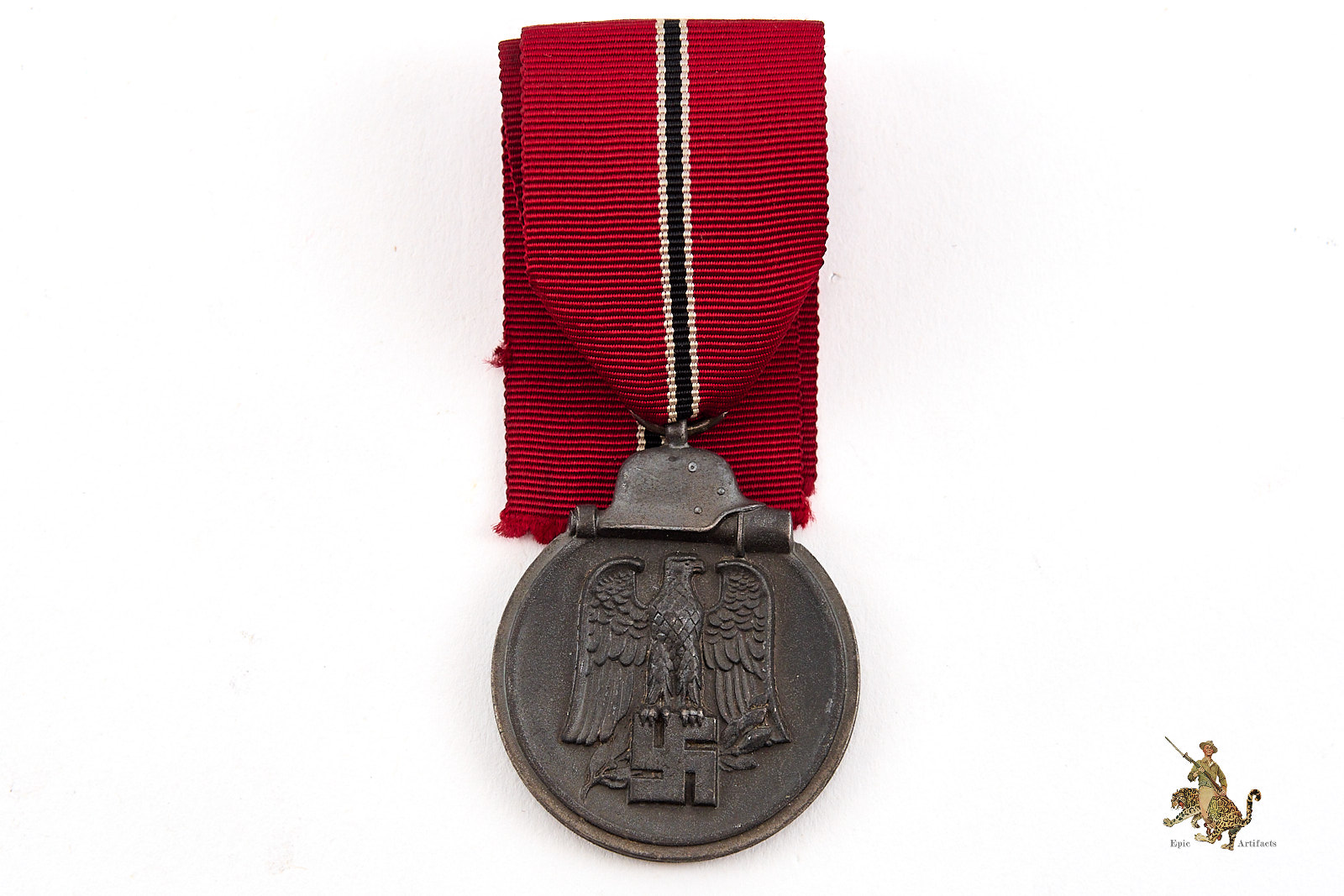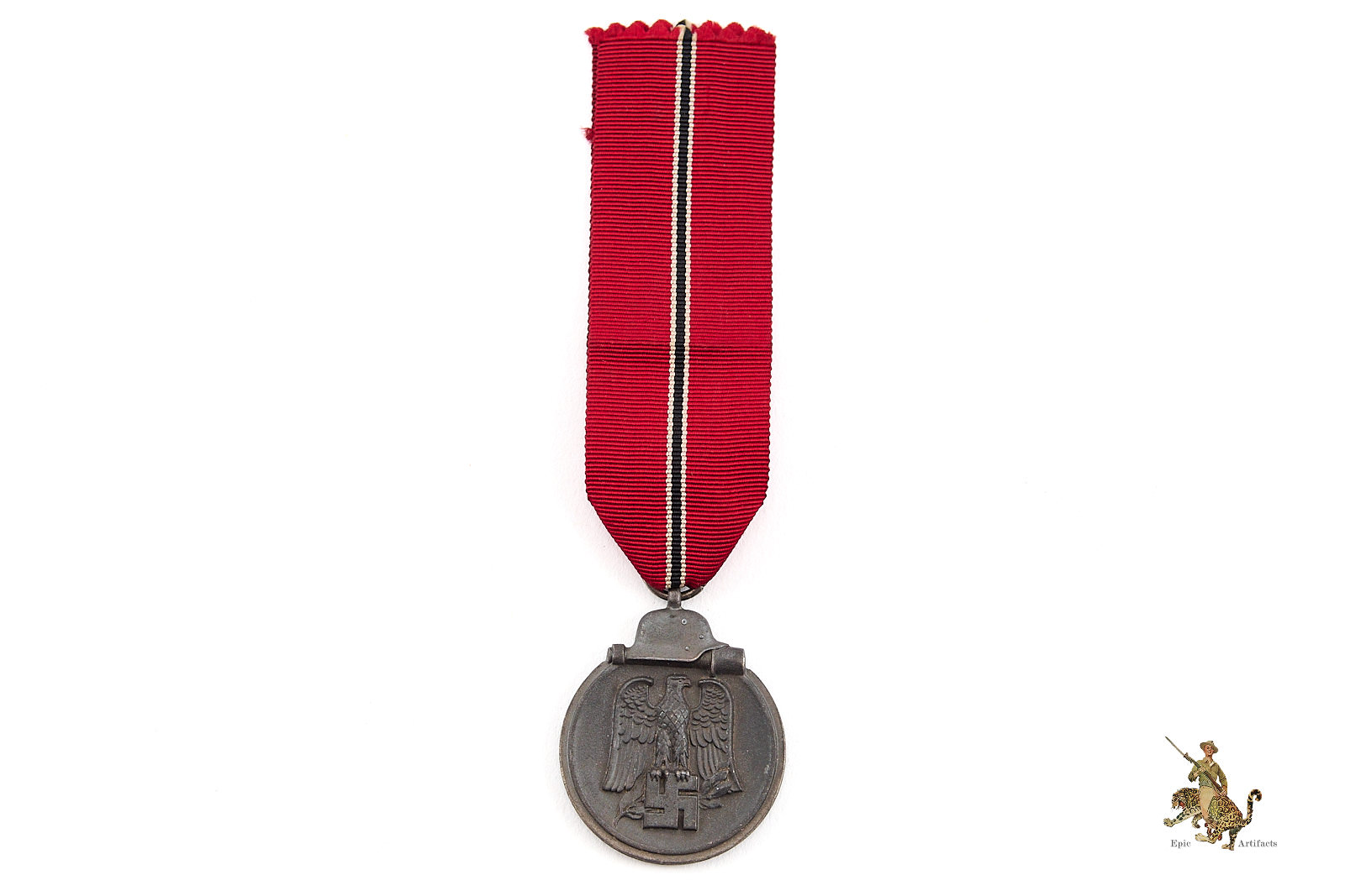 Historical Description: The Eastern Front Medal (Medaille “Winterschlacht im Osten” 1941/42) was a German military campaign decoration awarded to all Axis personnel who met specific criteria pertaining toduty on the Eastern Front between November 15, 1941, and April 15, 1942. This was the bitter, horrible first winter on the Eastern Front, in which millions of men who were unprepared for the brunt of the Russian winter were forced to fight in often inhuman conditions. The award was designed by SS-Unterscharführer Ernst Krauit. The obverse featured a striking Wehrmacht eagle on a massive, static swastika, surmounted by a Wehrmacht steel helmet and hand grenade. Early examples of this award were tombak, with later issues being struck from zinc. The medal had a chemically darkened finish, with silvering on the rim and to the helmet and hand grenade motif. It was suspended from a red, white and black striped ribbon. On field uniforms, only the ribbon was worn; the medal could be worn as part of a medal bar on dress uniforms. To earn this award, soldiers had to have served within a specific geographic region that had been officially designated as the area of the Eastern Front. Within this region, to qualify for the award, ground soldiers had to have experienced 14 days of active combat, or 60 days of continuous service in a combat zone. Soldiers who were wounded in combat or who suffered frostbite severe enough to merit the award of a Wound Badge were also eligible for the Eastern Front Medal. Luftwaffe soldiers had to have flown 30 combat sorties over the Front to qualify. In 1943, the award criteria were expanded to allow for awards to non-combatants who had served within the area of the Front. By the time award of the Eastern Front Medal ceased in September 1944, over three million of the medals had been awarded.