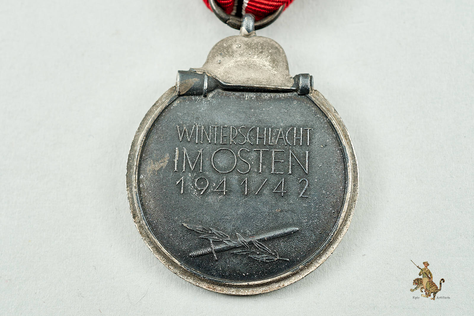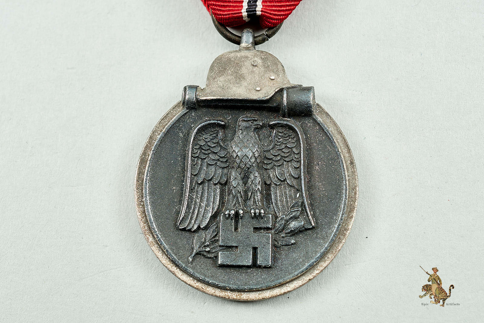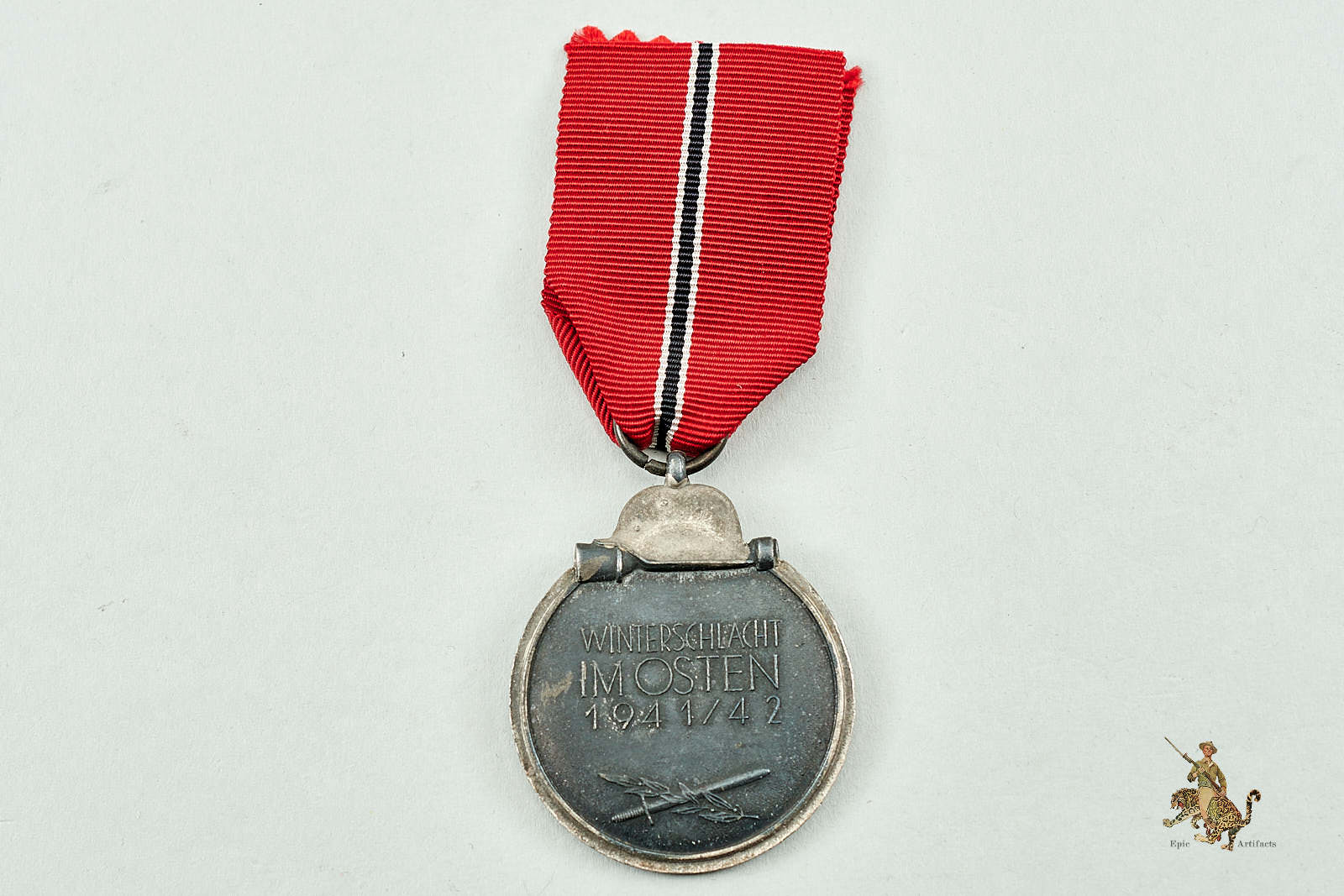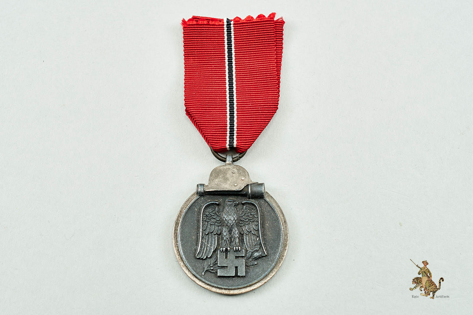 Historical Description: The Eastern Front Medal (Medaille “Winterschlacht im Osten” 1941/42) was a German military campaign decoration awarded to all Axis personnel who met specific criteria pertaining toduty on the Eastern Front between November 15, 1941, and April 15, 1942. This was the bitter, horrible first winter on the Eastern Front, in which millions of men who were unprepared for the brunt of the Russian winter were forced to fight in often inhuman conditions. The award was designed by SS-Unterscharführer Ernst Krauit. The obverse featured a striking Wehrmacht eagle on a massive, static swastika, surmounted by a Wehrmacht steel helmet and hand grenade. Early examples of this award were tombak, with later issues being struck from zinc. The medal had a chemically darkened finish, with silvering on the rim and to the helmet and hand grenade motif. It was suspended from a red, white and black striped ribbon. On field uniforms, only the ribbon was worn; the medal could be worn as part of a medal bar on dress uniforms. To earn this award, soldiers had to have served within a specific geographic region that had been officially designated as the area of the Eastern Front. Within this region, to qualify for the award, ground soldiers had to have experienced 14 days of active combat, or 60 days of continuous service in a combat zone. Soldiers who were wounded in combat or who suffered frostbite severe enough to merit the award of a Wound Badge were also eligible for the Eastern Front Medal. Luftwaffe soldiers had to have flown 30 combat sorties over the Front to qualify. In 1943, the award criteria were expanded to allow for awards to non-combatants who had served within the area of the Front. By the time award of the Eastern Front Medal ceased in September 1944, over three million of the medals had been awarded.