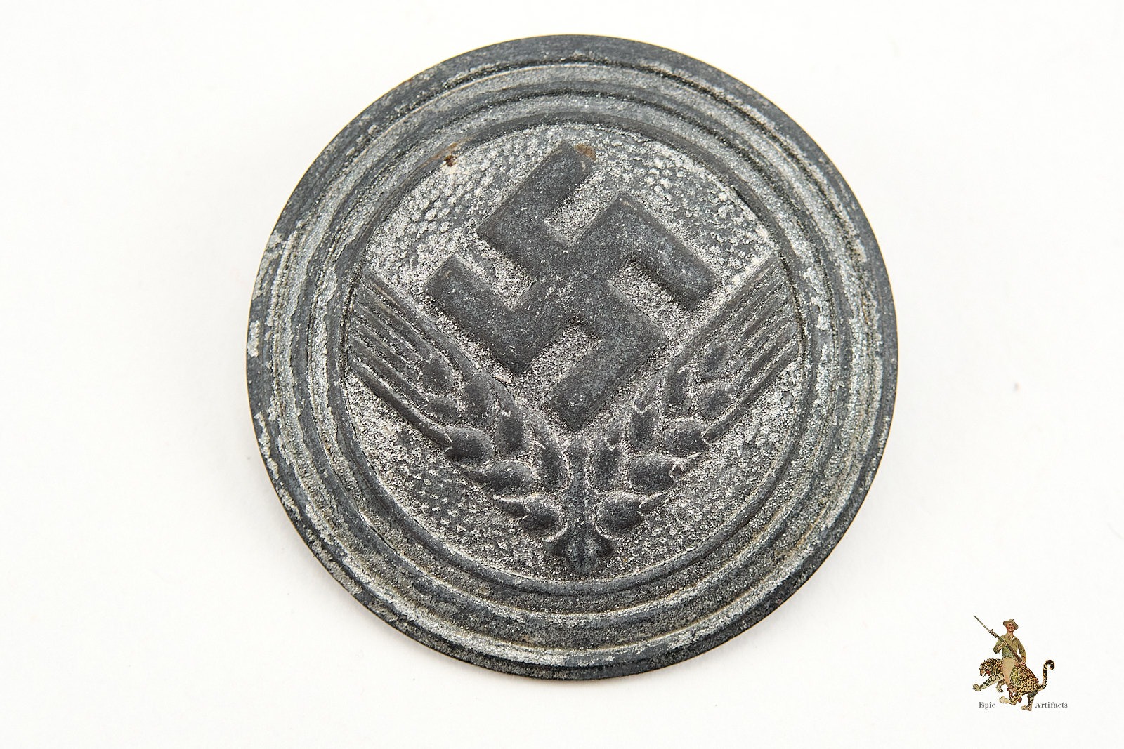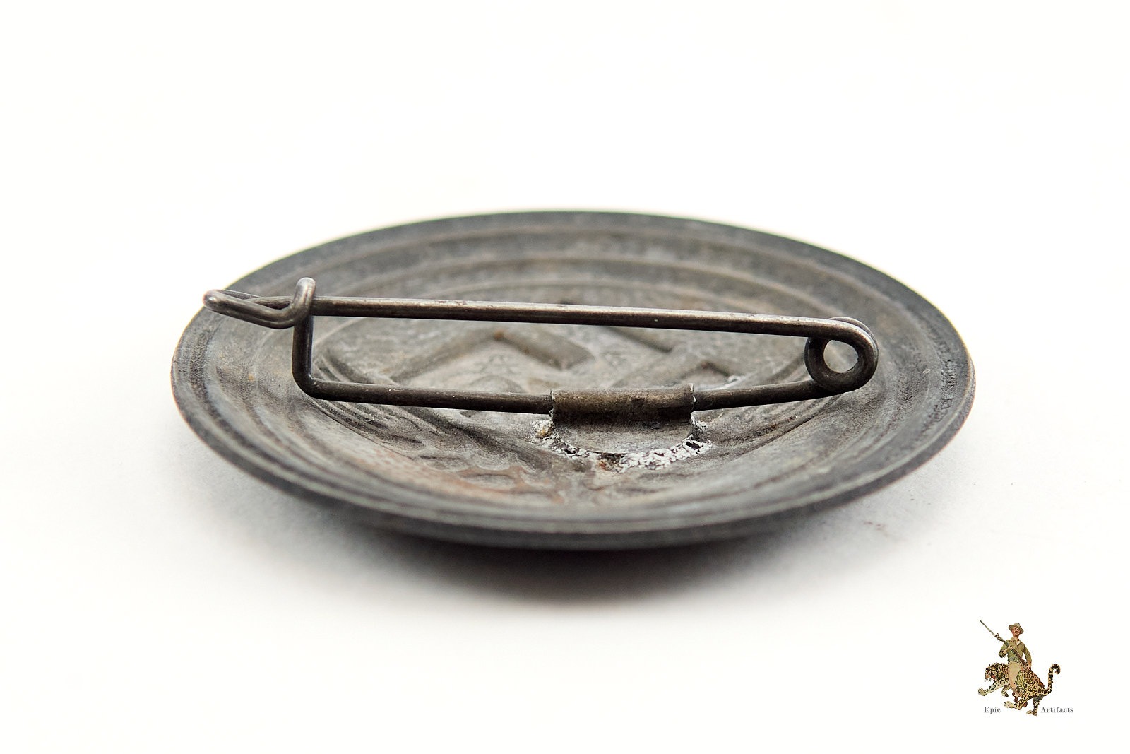 The obverse retains much of its original silver tone with a nice even patina. The reverse features a functional horizontal pinback and is marked by Assmann.