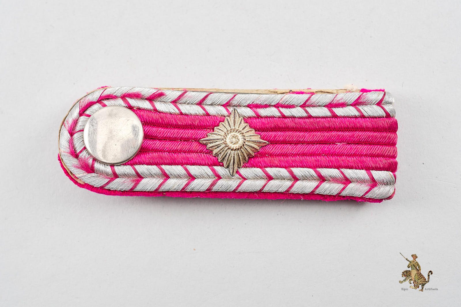 Historical Description: The German military as well as civil, political and paramilitary organizations traditionally used shoulder straps and shoulder boards as uniform insignia, to denote the rank or function of the wearer. After the Nazi rise to power in 1933, there was a tremendous increase in the number of groups and organizations in Germany wearing officially sanctioned uniforms, and most of these organizations used shoulder straps and shoulder boards as a component of their regalia. The exact color of piping utilized, the material color, the type of braid or Tresse that was used, and the number or location of devices and pips present, allow shoulder boards to be tracked to the exact organization that issued them, and often yield even further detail such as the wearer’s rank and even his specific military unit. Normally worn in pairs, the boards were in some cases plain, and in other cases adorned with detailed embroidery or metal emblems. Some shoulder boards were made in the millions, others were specific to a single individual.
