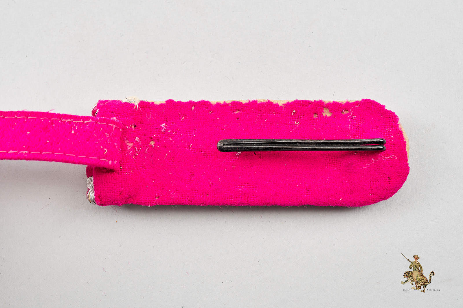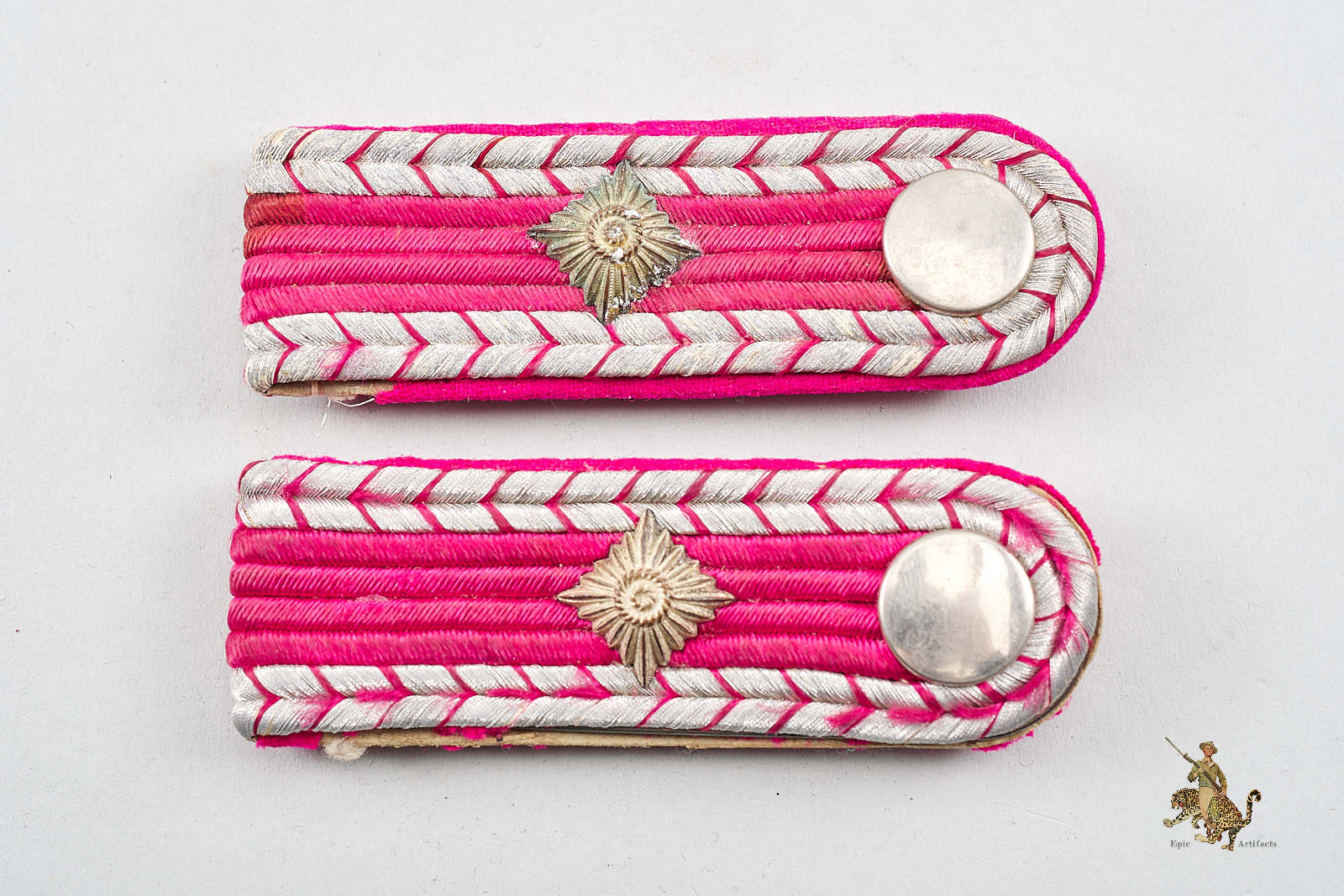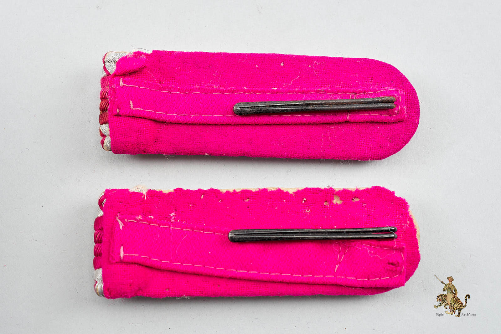 Product Description: German Fire Protection Police Shoulder Board Set showing wear from age and use. Each board features a pink Waffenfarbe wool underlay retaining strong color. The silver/aluminum tress remains intact and in good condition. Shoulder boards have obvious mothing affecting one board more than the other. An excellent, field-worn example of Fire Protection Police insignia from WWII, combining authenticity and visual appeal. This Fire Protection Police Shoulder Board Set rates in very good condition.