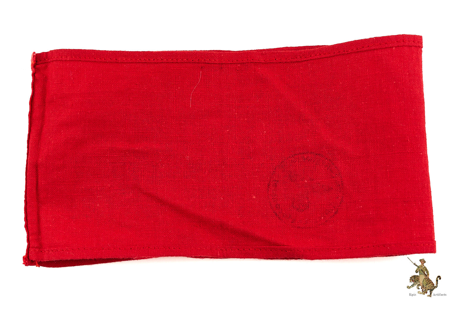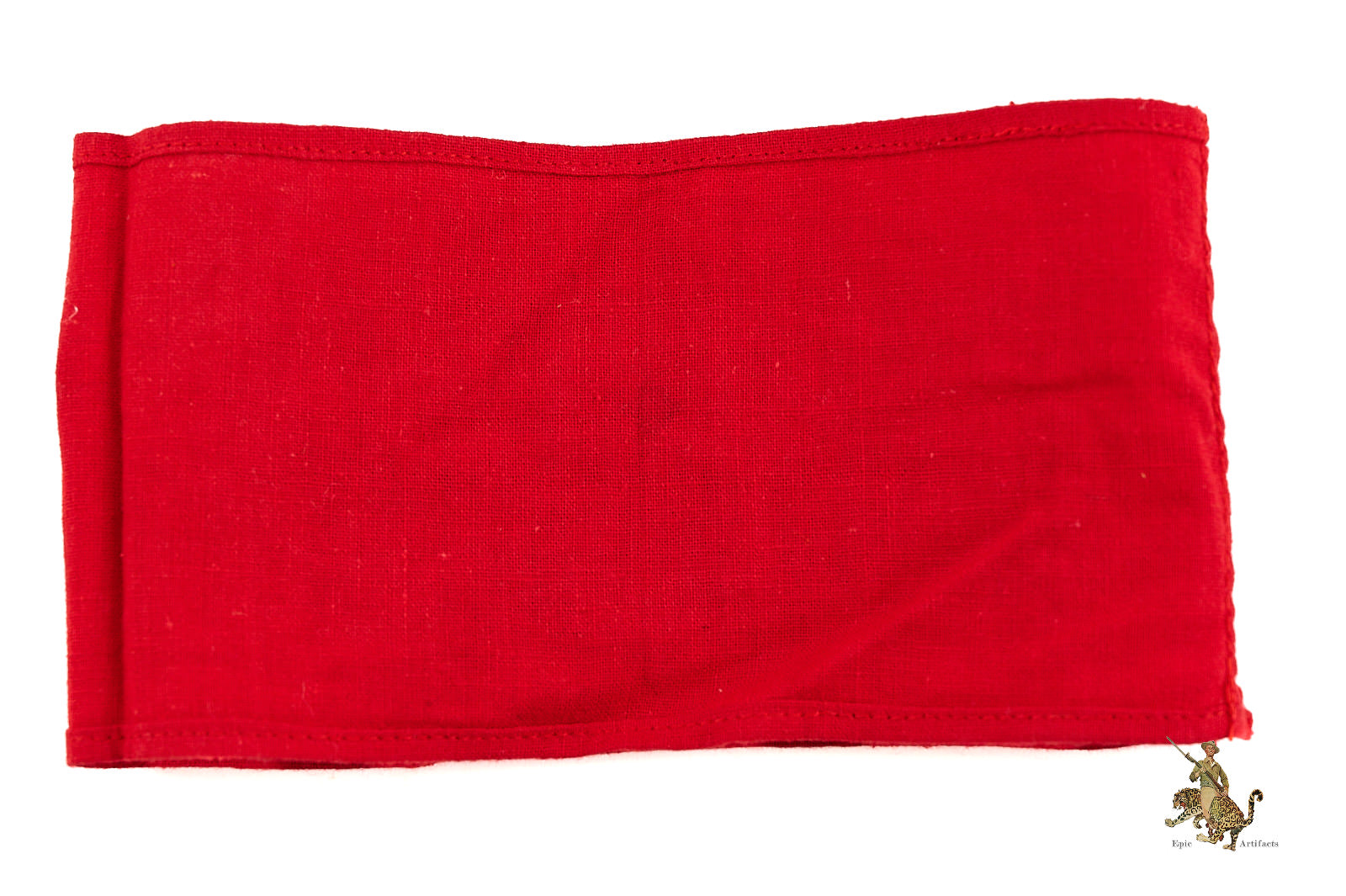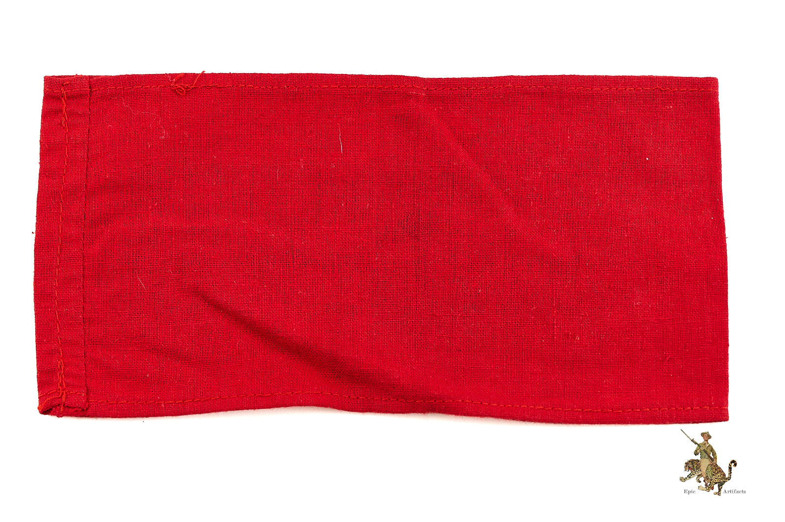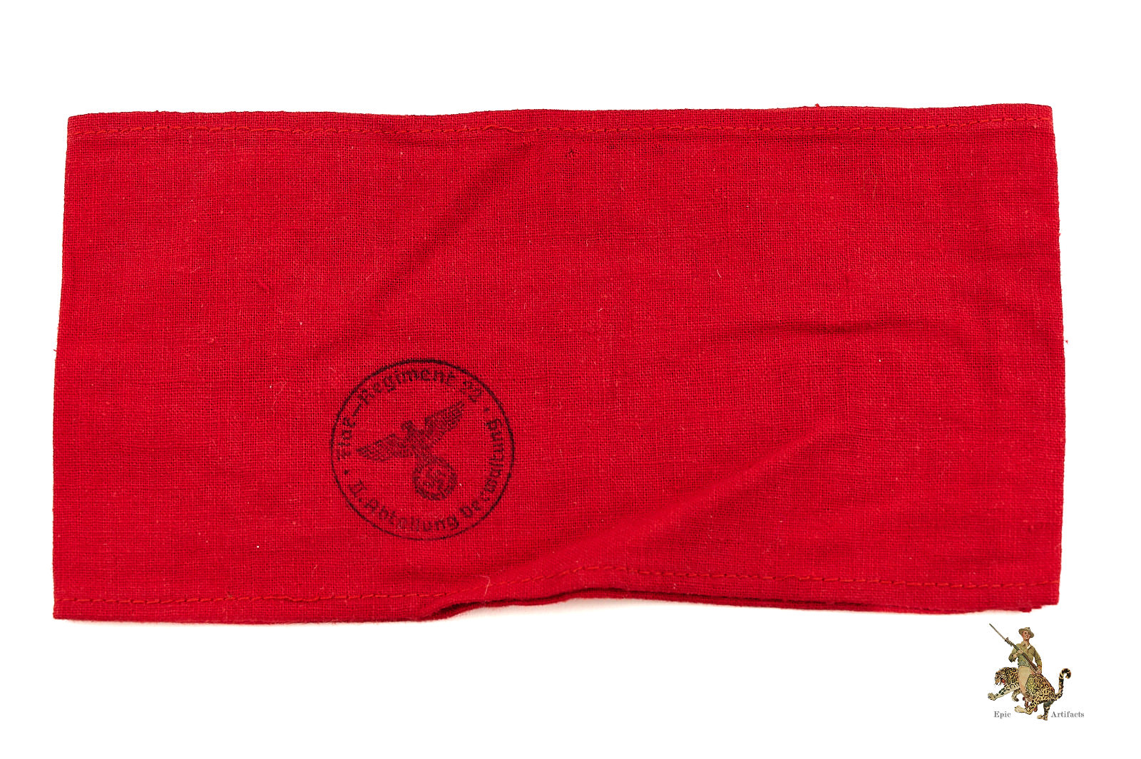 Product Description: An excellent example of the Flak Regiment Armband Stamped, constructed of bright red cotton and machine-stitched along the upper and lower edges as well as at the ends. The armband bears a clear unit stamp for Flak Regiment 22.