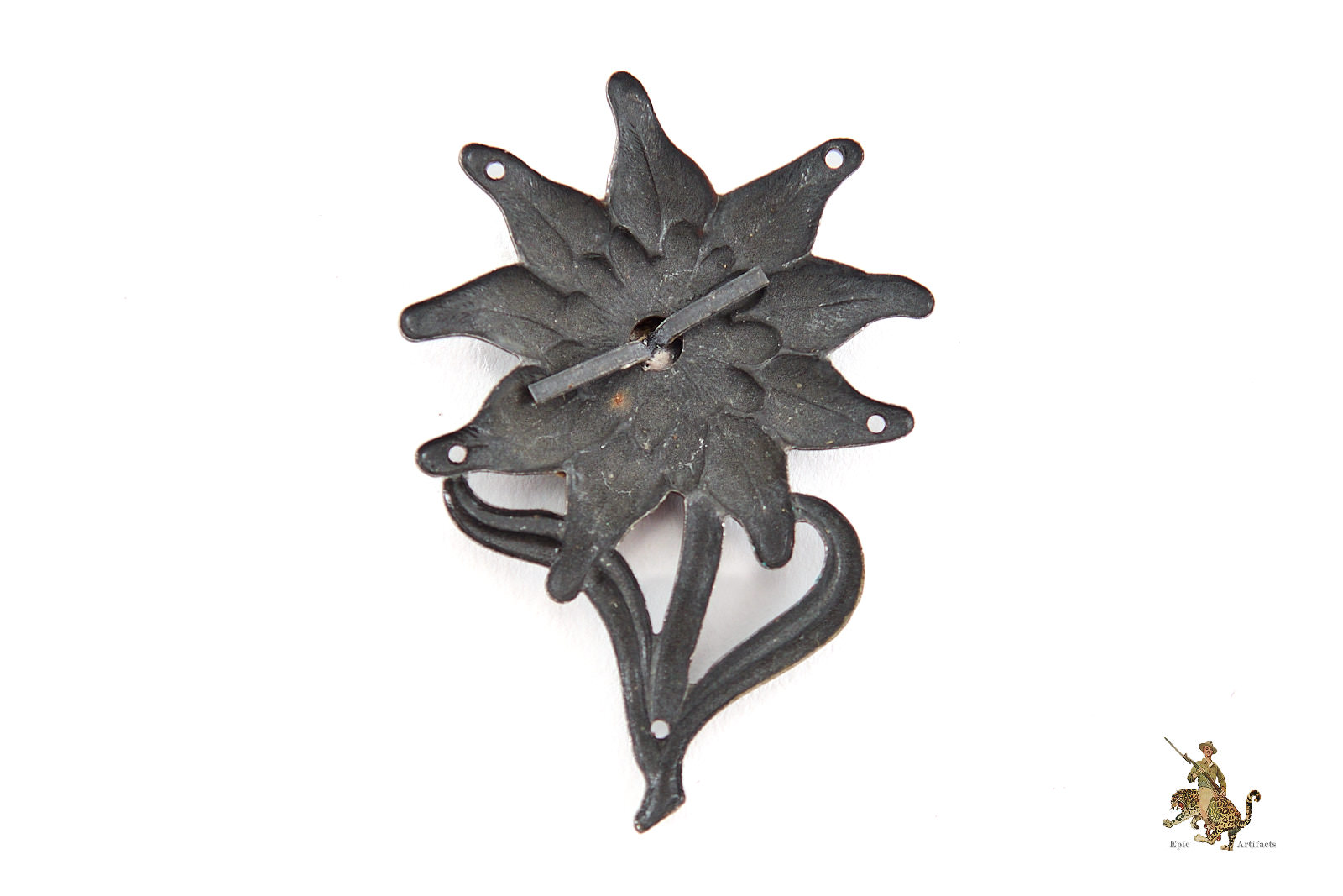 Product Description: This Gebirgsjäger Edelweiss 2 Piece Metal Cap Insignia is two-piece stamped metal construction, the insignia depicting the edelweiss flowe, emblematic of the elite Gebirgsjäger (mountain troops) of the Wehrmach, comprising a silvered flower and stem with finely detailed veining and a separately applied gilt-toned center, designed to slot securely into the base. Reverse fitted with original twin prongs for attachment to the Bergmütze field cap. Displaying minor, even toning consistent with age; preserved in Excellent Plus condition with no signs of repair or alteration.