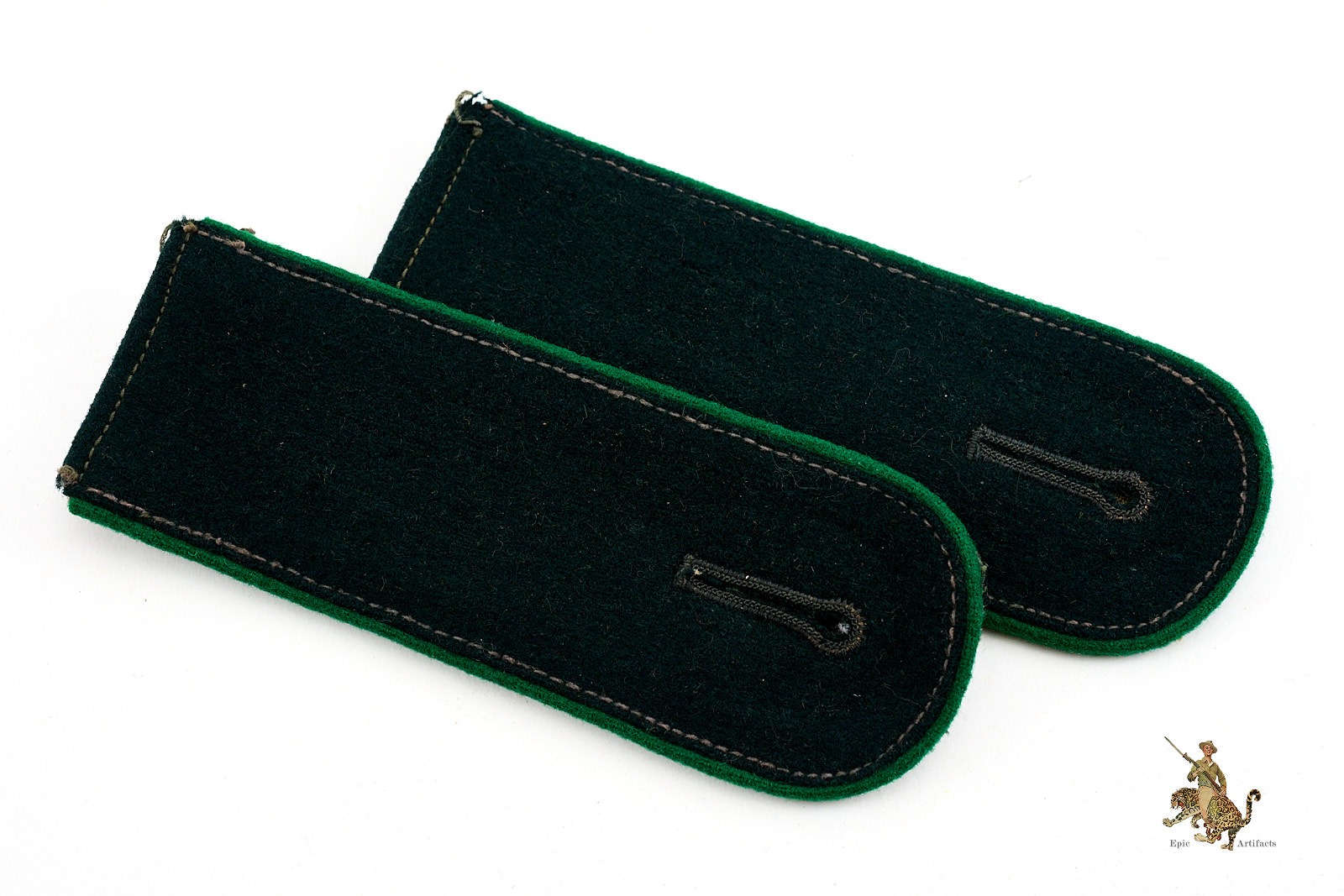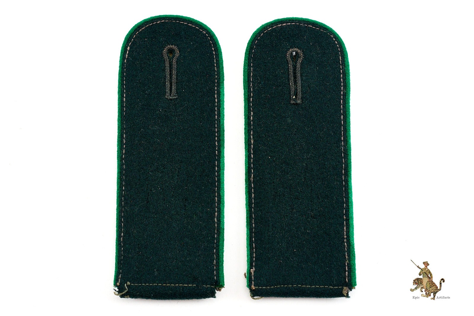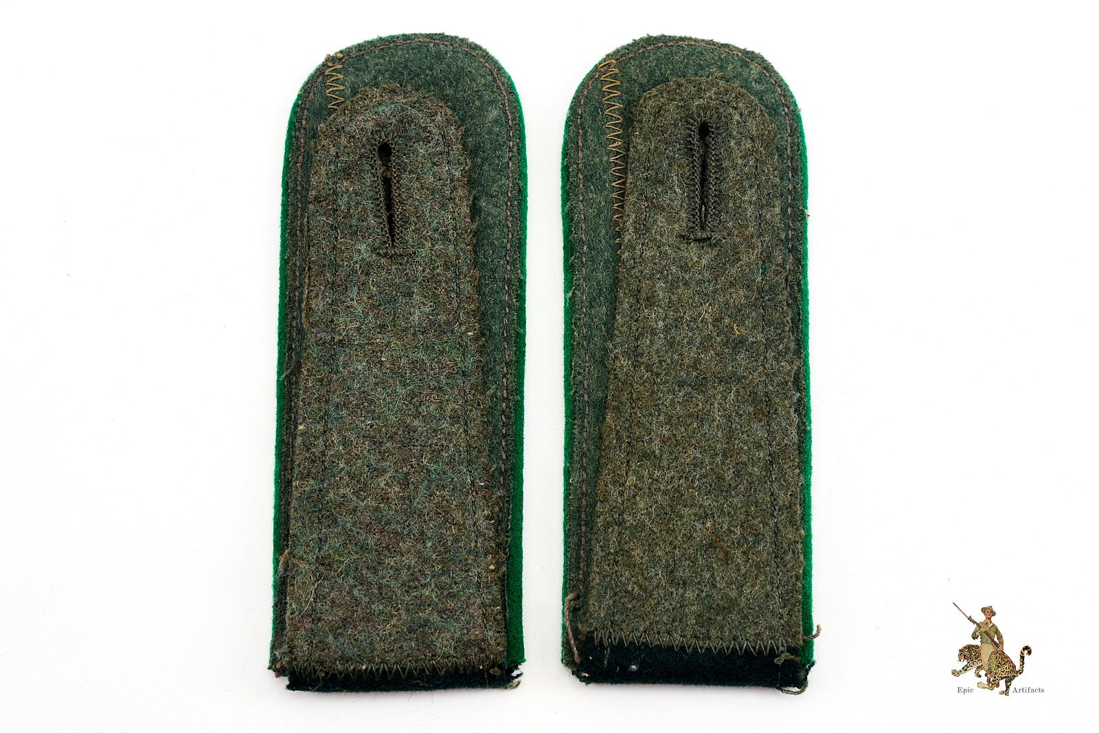 Product Description: An excellent matched pair of WWII German Heer Gebirgsjäger (Mountain Troops) enlisted shoulder straps, constructed from field-grey wool with dark green wool tops and edelweiss green wool Waffenfarbe piping. These are the standard issue slip on style worn by mountain infantry throughout the war. The straps show light, even wear consistent with age and field service, with no repairs or significant damage. A clean and original example of Gebirgsjäger EM insignia, known for its distinctive branch color and elite troop association.