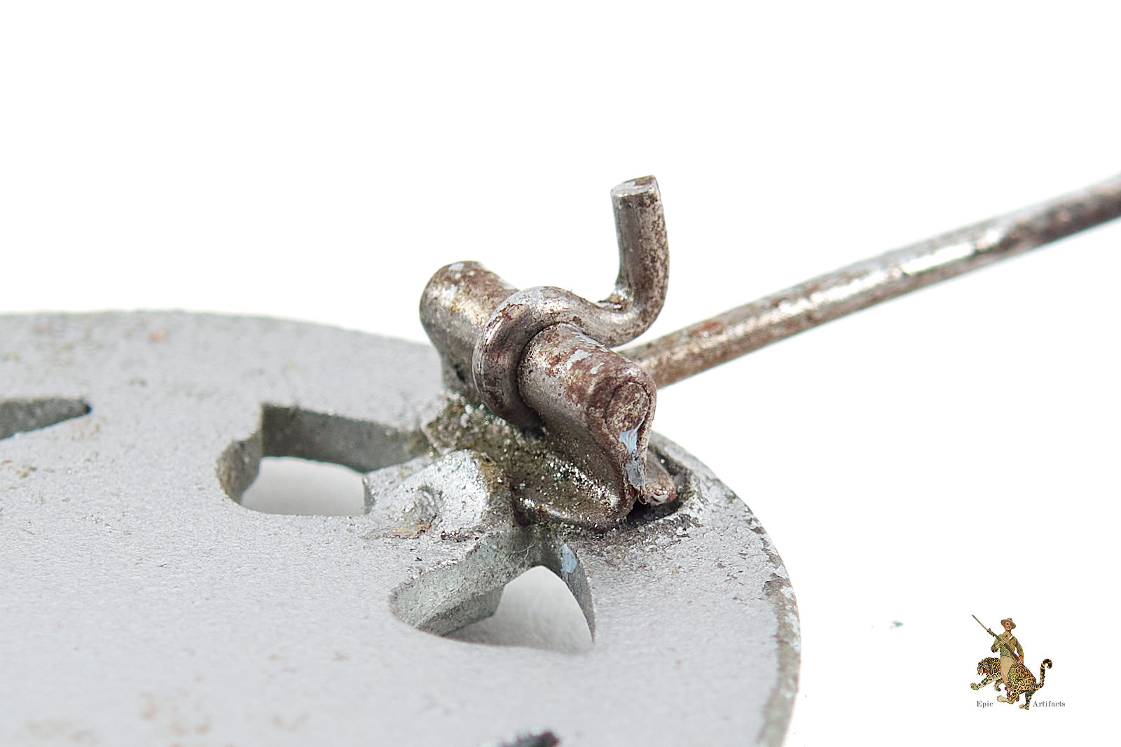 The reverse is flat and exhibits the typical light bubbling associated with zinc finishes. While unmarked, this distinct variant is confidently attributed to the firm of Biedermann. The hardware setup is textbook for this maker, featuring a crimped hinge, round wire catch, and a fully functional round wire pin.