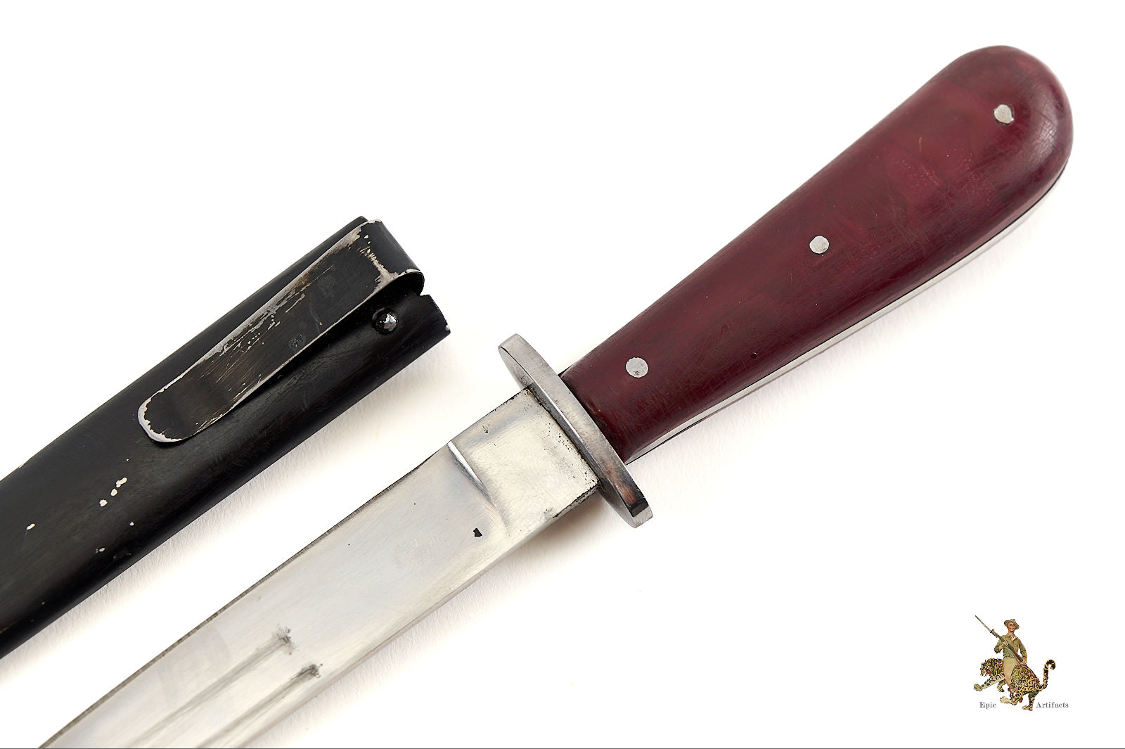 Historical Description: The typical German fighting knife of the World Wars was a conventional, general purpose knife, sturdily made, with a full tang and slab grips, and a steel scabbard. The blade length was about 6 inches long. Between 1914 and 1918, there were many makers of these knives, known as “Grabenmesser” (trench knives). Wooden handles were common, and most had a leather belt loop on the scabbard. Some of these knives were privately purchased by the soldiers, while others were issued items. There were many variations, including stag grips, solid metal handles, and even some with offset handles and slots that allowed them to be fixed to rifles, bayonet style.