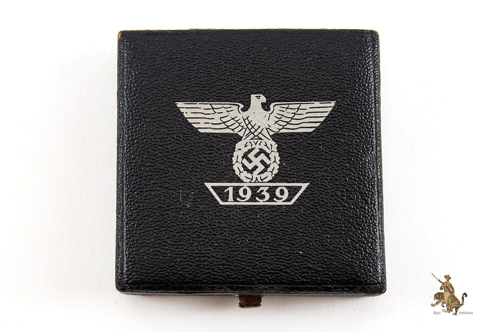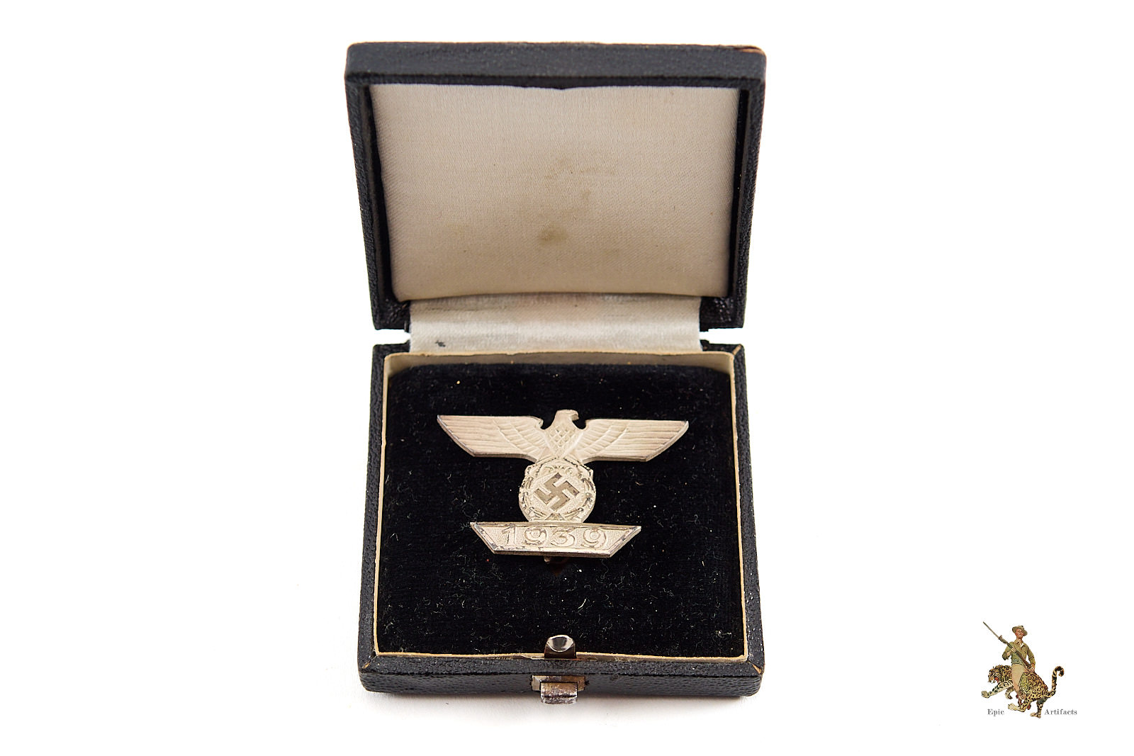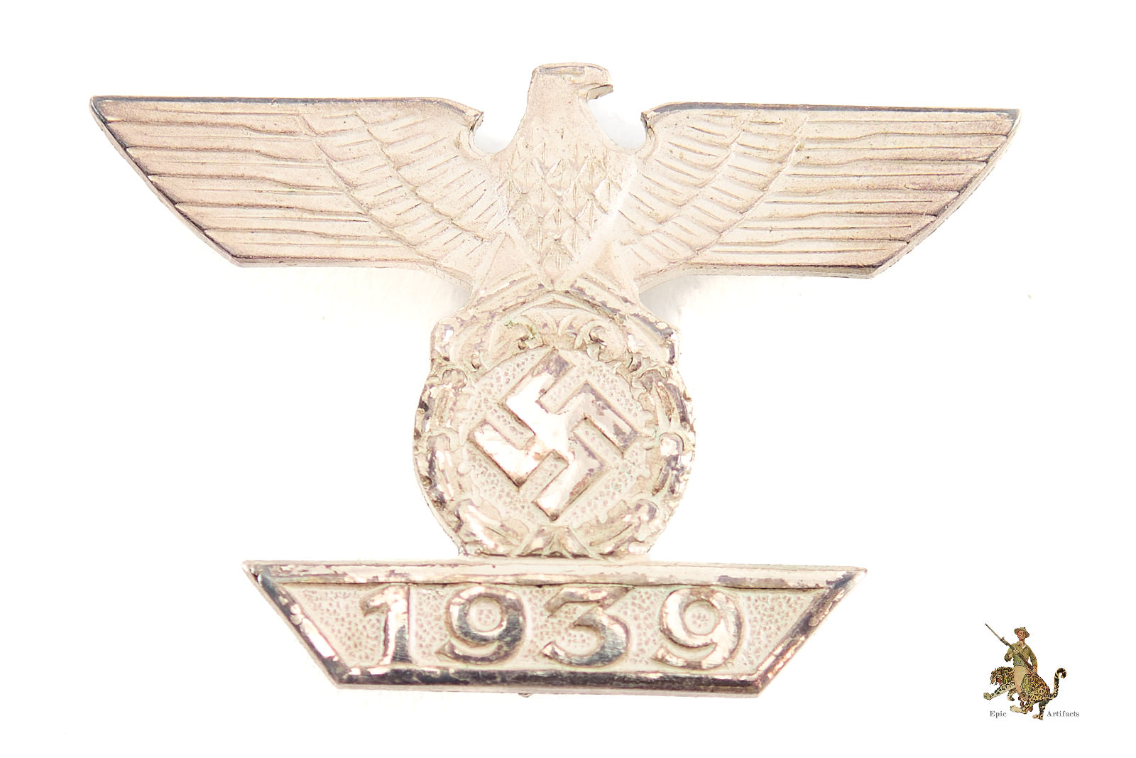 Historical Description: When Adolf Hitler reinstituted the historical Iron Cross was decoration on September 1, 1939, he also instituted a special new award, the “Wiederholungsspange,” to recognize people who had earned the 1914 Iron Cross during WWI and whose actions in this new war merited being awarded the Iron Cross again. There were two different patterns of this Spange, for the First and Second Classes of the Iron Cross. Both of them took the form of a German national eagle and swastika emblem, with outstretched wings, over a bar with the date “1939.” The First-Class award had a pin attachment or screw back, to enable it to be worn on the uniform pocket over the 1914 Iron Cross. Some combo-type awards are also known, with the Spange fastened to the top arm of the 1914 cross. The Second Class Spange had two or four prongs on the reverse and was affixed to a length of 1914 pattern Iron Cross ribbon. Most of the Spange awards were made of a brass alloy (Buntmetall) with a silver finish, while late war examples were produced from zinc. As with most German combat awards, there were many variations of the Spange produced, including miniature awards for the ribbon bar