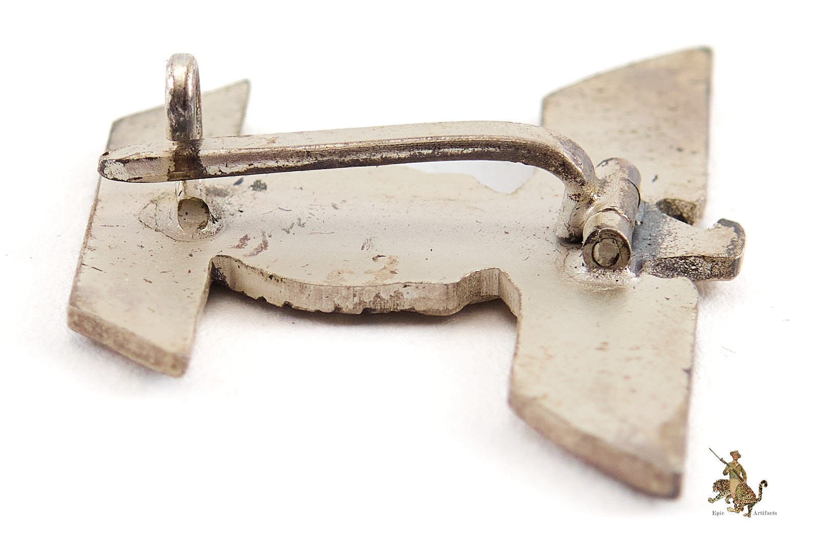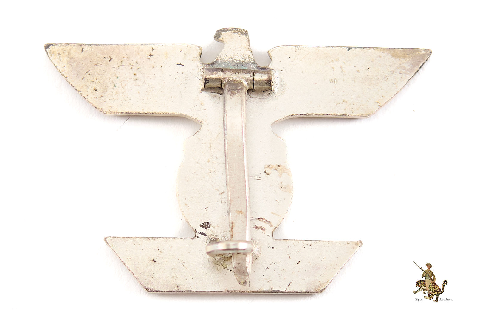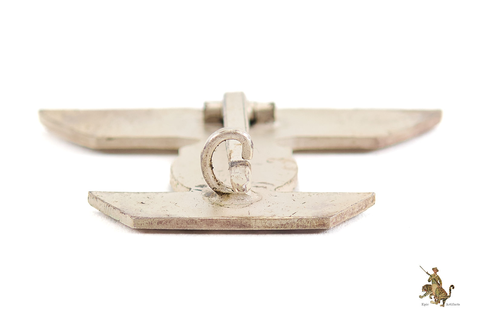 Historical Description: When Adolf Hitler reinstituted the historical Iron Cross was decoration on September 1, 1939, he also instituted a special new award, the “Wiederholungsspange,” to recognize people who had earned the 1914 Iron Cross during WWI and whose actions in this new war merited being awarded the Iron Cross again. There were two different patterns of this Spange, for the First and Second Classes of the Iron Cross. Both of them took the form of a German national eagle and swastika emblem, with outstretched wings, over a bar with the date “1939.” The First-Class award had a pin attachment or screw back, to enable it to be worn on the uniform pocket over the 1914 Iron Cross. Some combo-type awards are also known, with the Spange fastened to the top arm of the 1914 cross. The Second Class Spange had two or four prongs on the reverse and was affixed to a length of 1914 pattern Iron Cross ribbon. Most of the Spange awards were made of a brass alloy (Buntmetall) with a silver finish, while late war examples were produced from zinc. As with most German combat awards, there were many variations of the Spange produced, including miniature awards for the ribbon bar