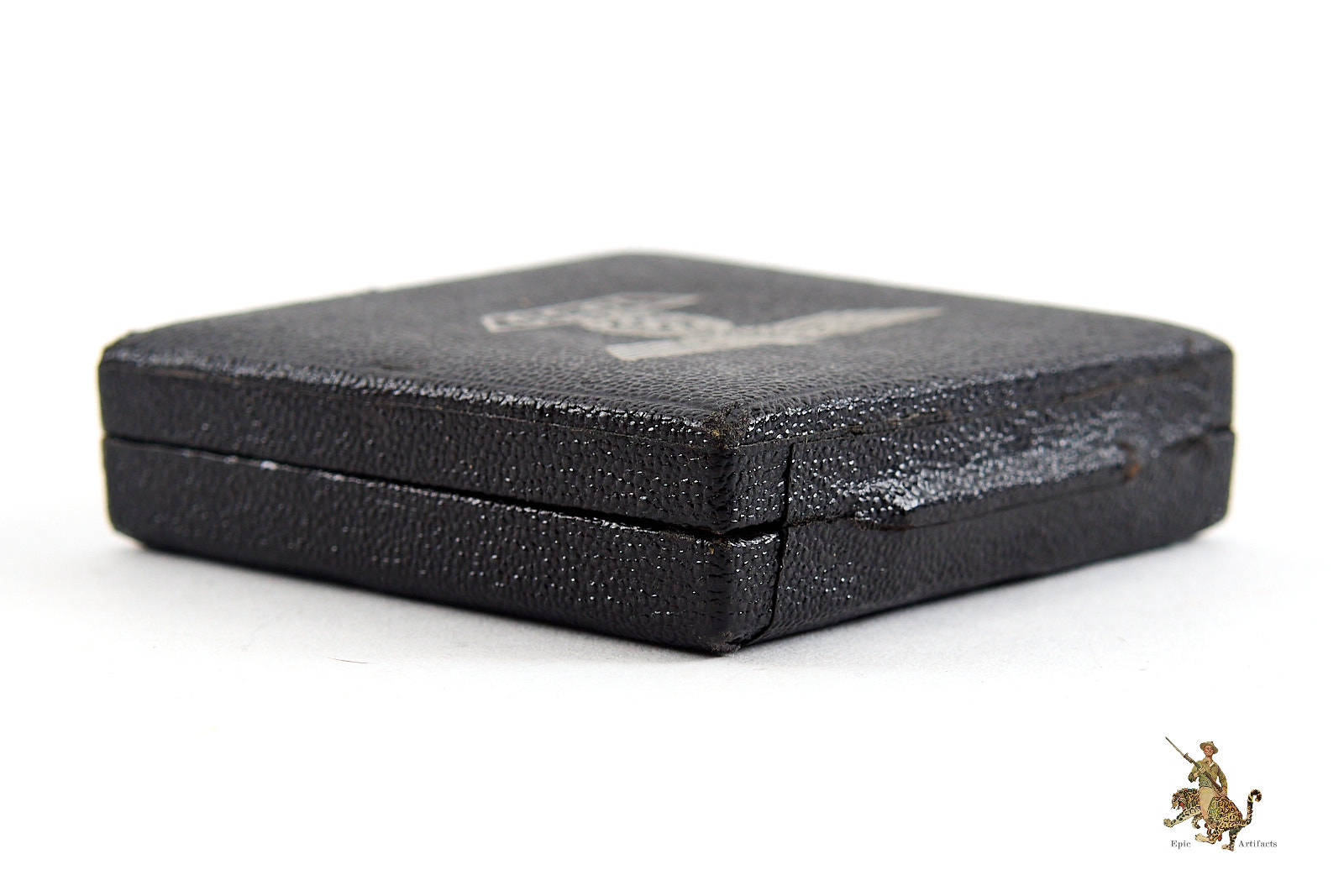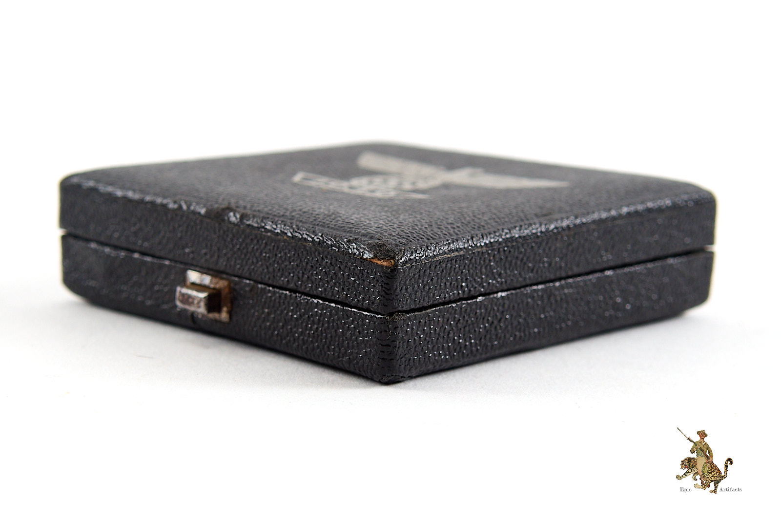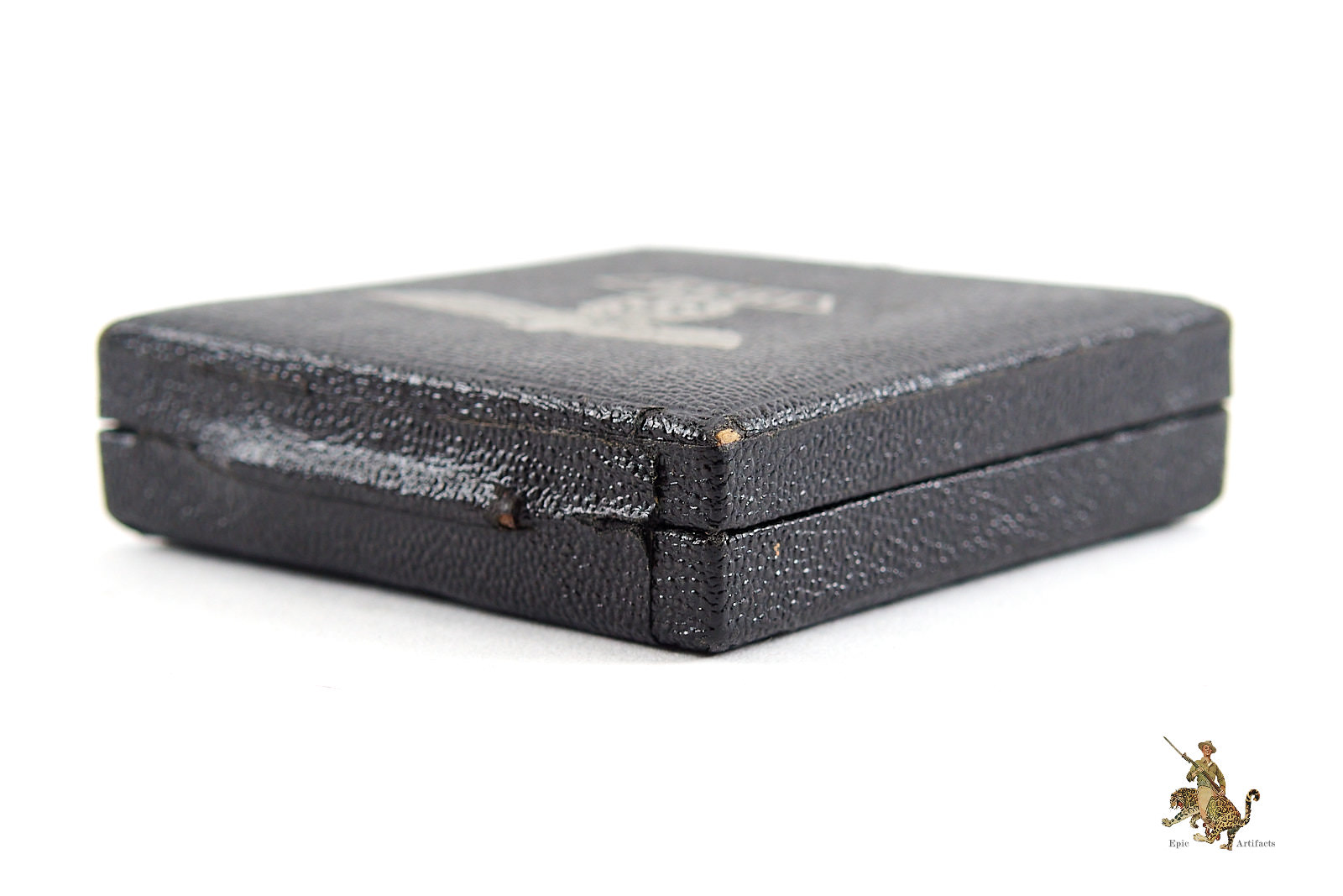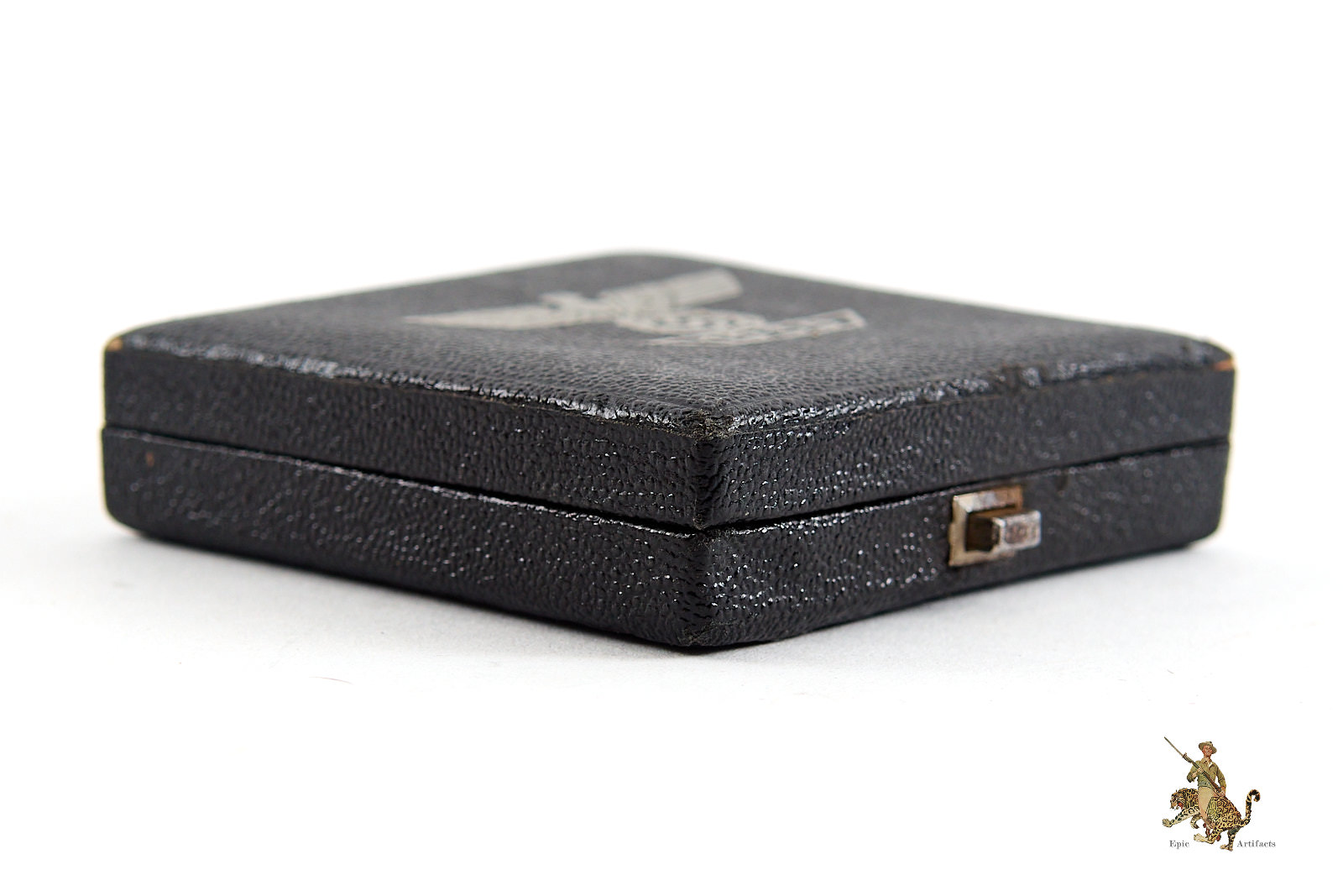 Product Description: This German Cased EK1 Spange set is from the firm of B. H. Mayer. Both the Spange and the case are made by Mayer, making this a matching set. The Spange itself is a top quality piece, struck from a brass alloy (Tombak). The obverse retains a good amount of the high quality silver electroplating and burnishing. It is unmarked, but is a classic Mayer variant, with a wide pin, barrel hinge, and square wire catch. This Spange is housed in a scarce and extremely well-preserved original case. The exterior of the case is beautiful, and in excellent condition, with the typical glossy “wet” look that these Mayer boxes will have. The lid of the box features a really nice embossed illustration of the award, in silver leaf, which is fresh and pristine. The push button and hinge function perfectly. Inside, the case shows light, even patina to the white rayon lining. There is a small flaw in the rayon that covers the hinge, which is normal to see. This German Cased EK1 Spange set has a lot going for it, and rates as excellent plus. The German Cased EK1 Spange is always missing from many collections, and this one is in excellent plus condition and extremely desirable piece.