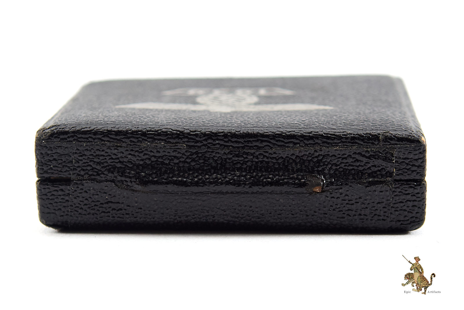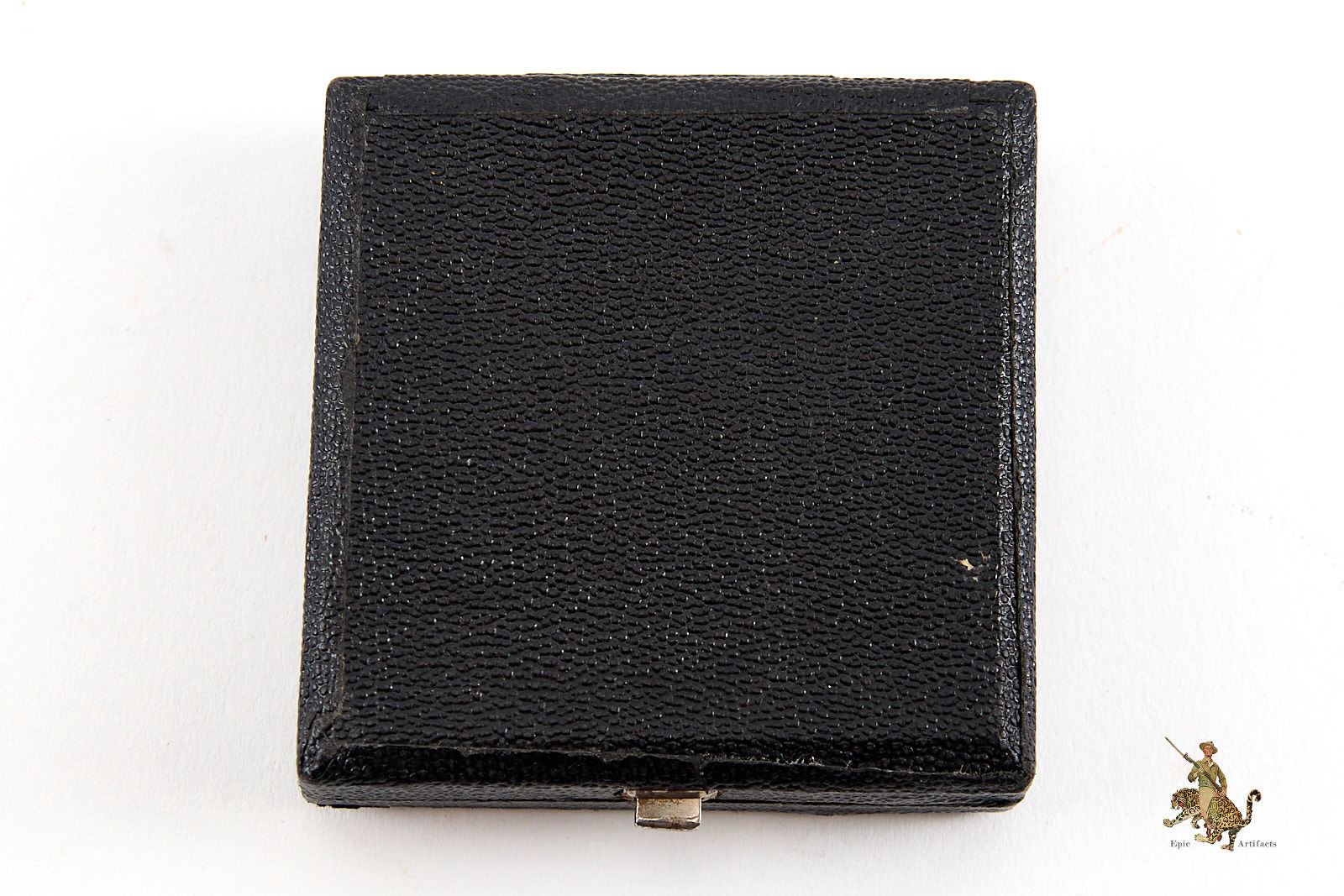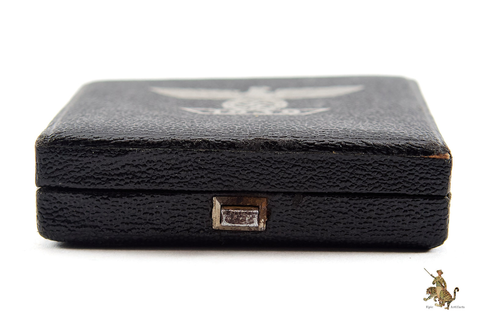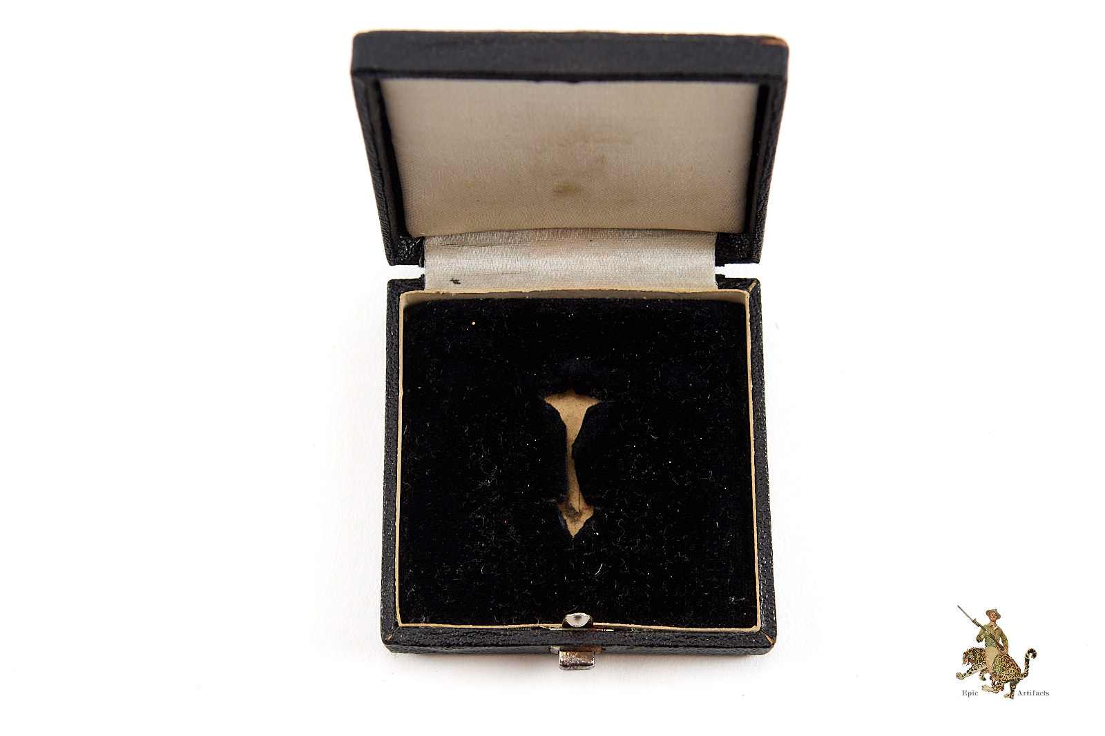 Product Description: This German Cased EK1 Spange set is from the firm of B. H. Mayer. Both the Spange and the case are made by Mayer, making this a matching set. The Spange itself is a top quality piece, struck from a brass alloy (Tombak). The obverse retains a good amount of the high quality silver electroplating and burnishing. It is unmarked, but is a classic Mayer variant, with a wide pin, barrel hinge, and square wire catch. This Spange is housed in a scarce and extremely well-preserved original case. The exterior of the case is beautiful, and in excellent condition, with the typical glossy “wet” look that these Mayer boxes will have. The lid of the box features a really nice embossed illustration of the award, in silver leaf, which is fresh and pristine. The push button and hinge function perfectly. Inside, the case shows light, even patina to the white rayon lining. There is a small flaw in the rayon that covers the hinge, which is normal to see. This German Cased EK1 Spange set has a lot going for it, and rates as excellent plus. The German Cased EK1 Spange is always missing from many collections, and this one is in excellent plus condition and extremely desirable piece.