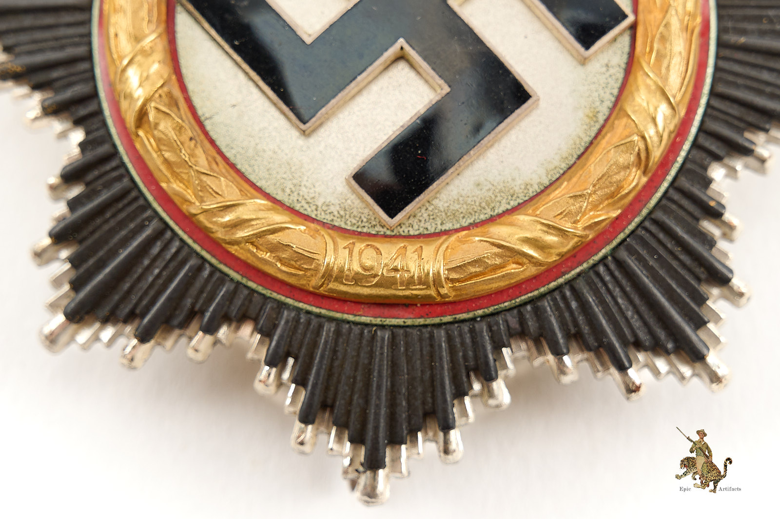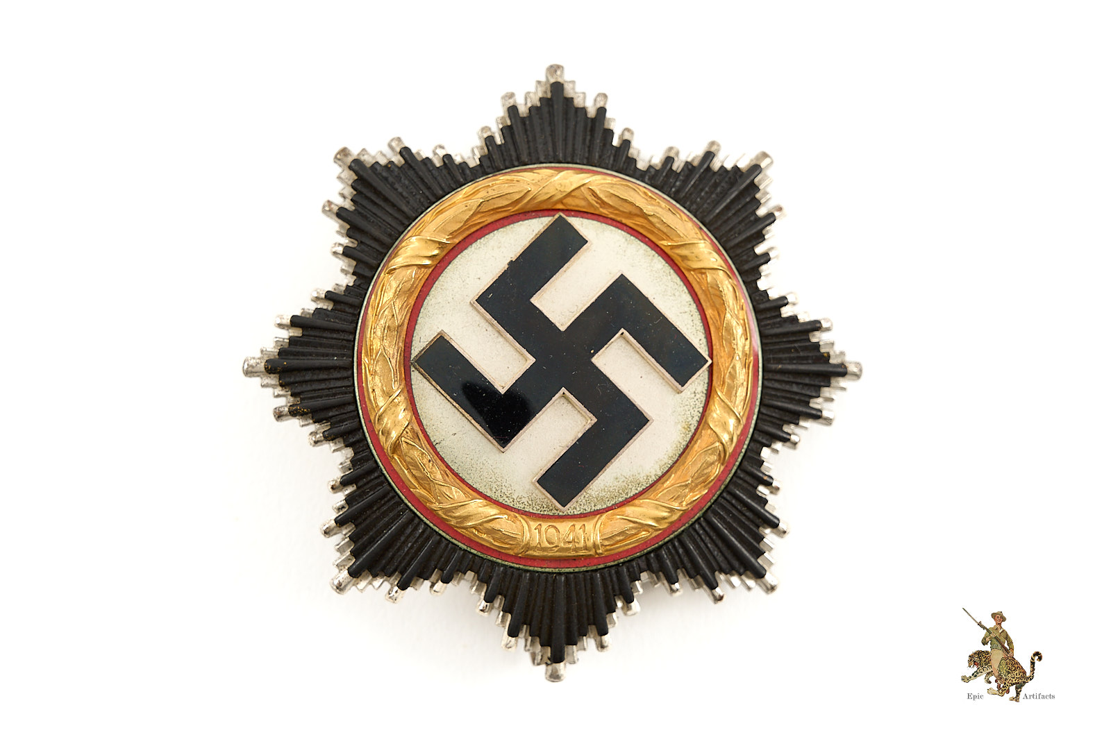 Historical Description: The German Cross in Gold was instituted on September 28th, 1941. The German High Command saw it necessary to create an award which would bridge the gap between the Iron Cross First Class and the Knights Cross of the Iron Cross. Once instituted, the German Cross became Germany’s second highest military decoration, second only to the Knights Cross anditssubsequent grades. The German Cross was similar to the Knights Cross in regards that the award was not based off of any previous awards in German history. It was a unique creation which also ended with the war. There were approximately 26,000 recipients of the German Cross in Gold. This number, however, does not reflect the total amount of German Crosses produced.