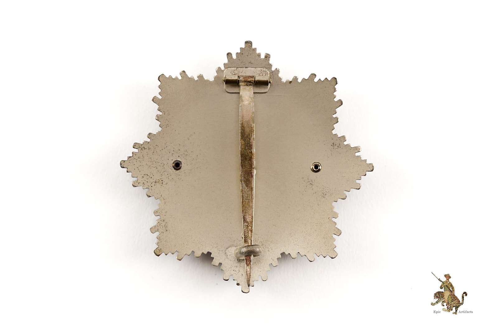 The German Cross was actually not a cross at all. It took on the form of an eight-pointed star, resembling some of the former breast awards of the Imperial era. The award came in two forms, a metal version and a cloth version. The metal version being the most complex of the two, it consisted of five separate pieces being fitted and held together using four to twelve rivets depending on who the manufacturer was. The cloth version follows the exact same design as the metal produced version except the entire cross is clothwith the exception of the laurel wreath still being metal.