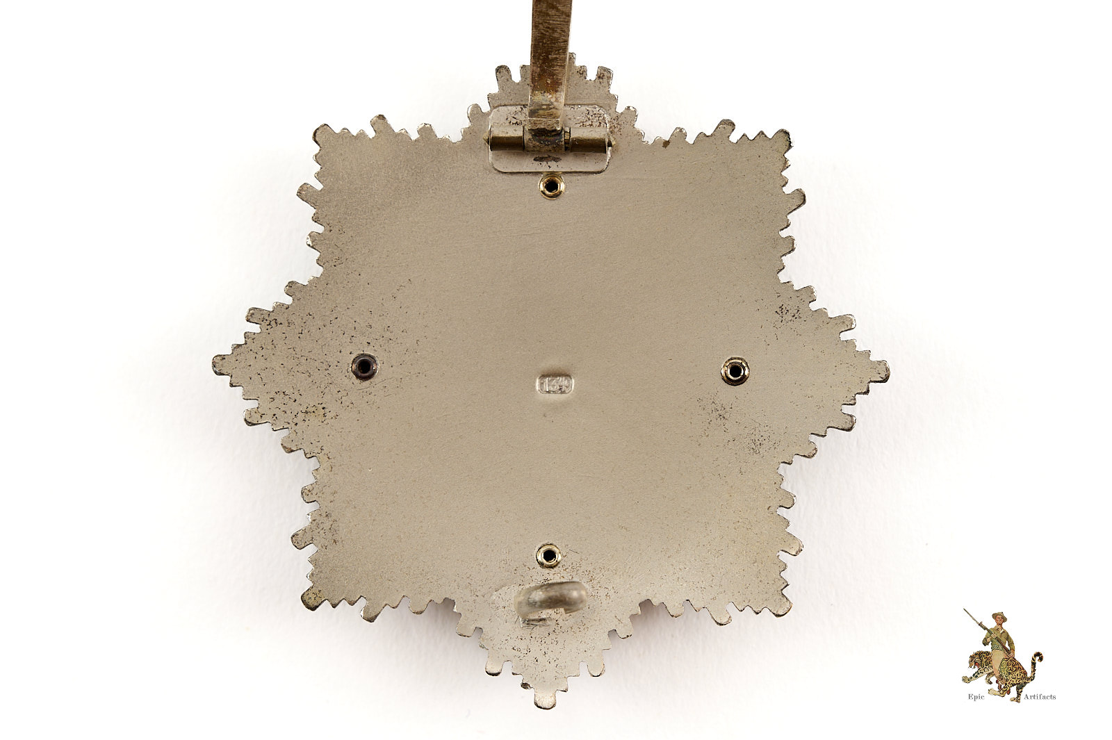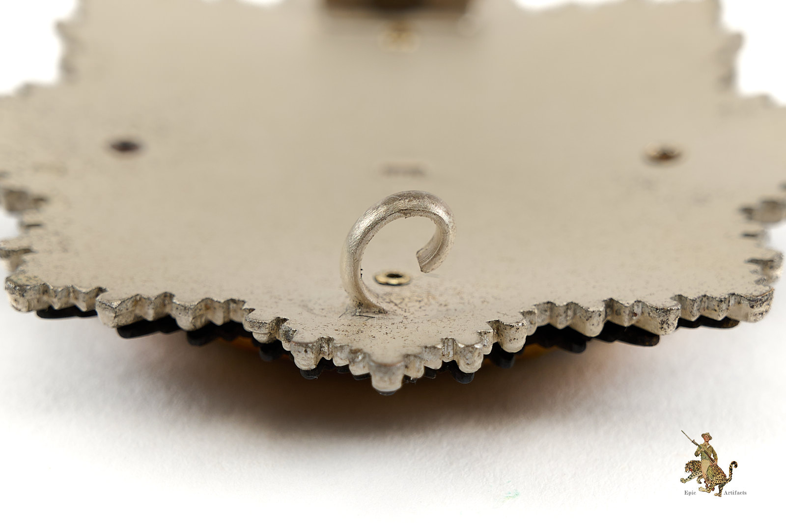 The reverse displays perfectly set, untouched rivets—tight, unaltered, and exactly as issued—attesting to the badge’s unquestioned integrity. The obverse is particularly remarkable: the starburst retains a rich, even darkened finish with no noticeable wear, an extraordinary and seldom-encountered state of preservation for this award. The gilded wreath remains vibrant and luminous, showcasing crisp detail and radiant factory burnished highlights. The central white enamel disc is beautifully preserved with only the faintest whisper of age toning, while the enameled swastika is immaculate, entirely free from chips, crazing, or surface imperfections.