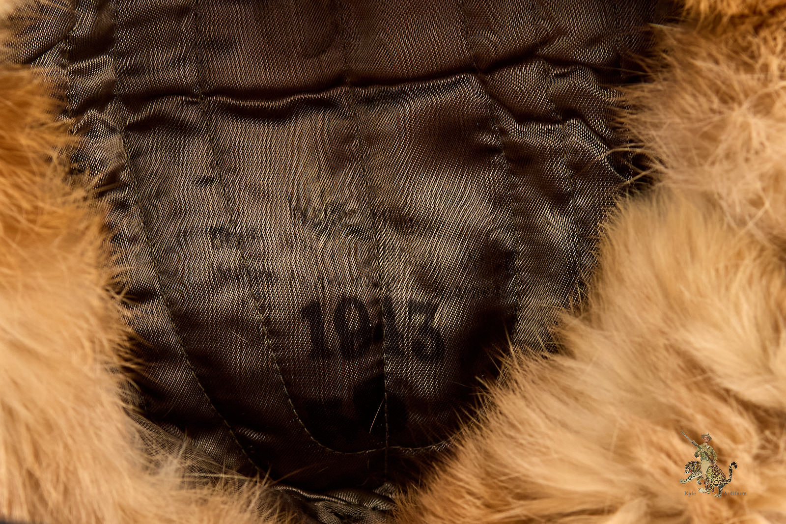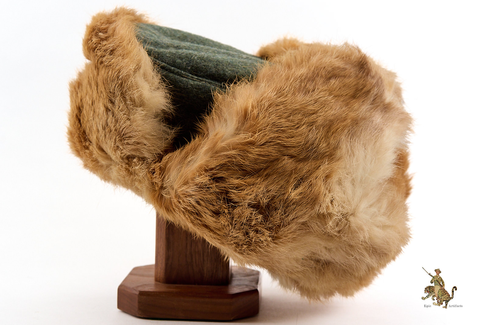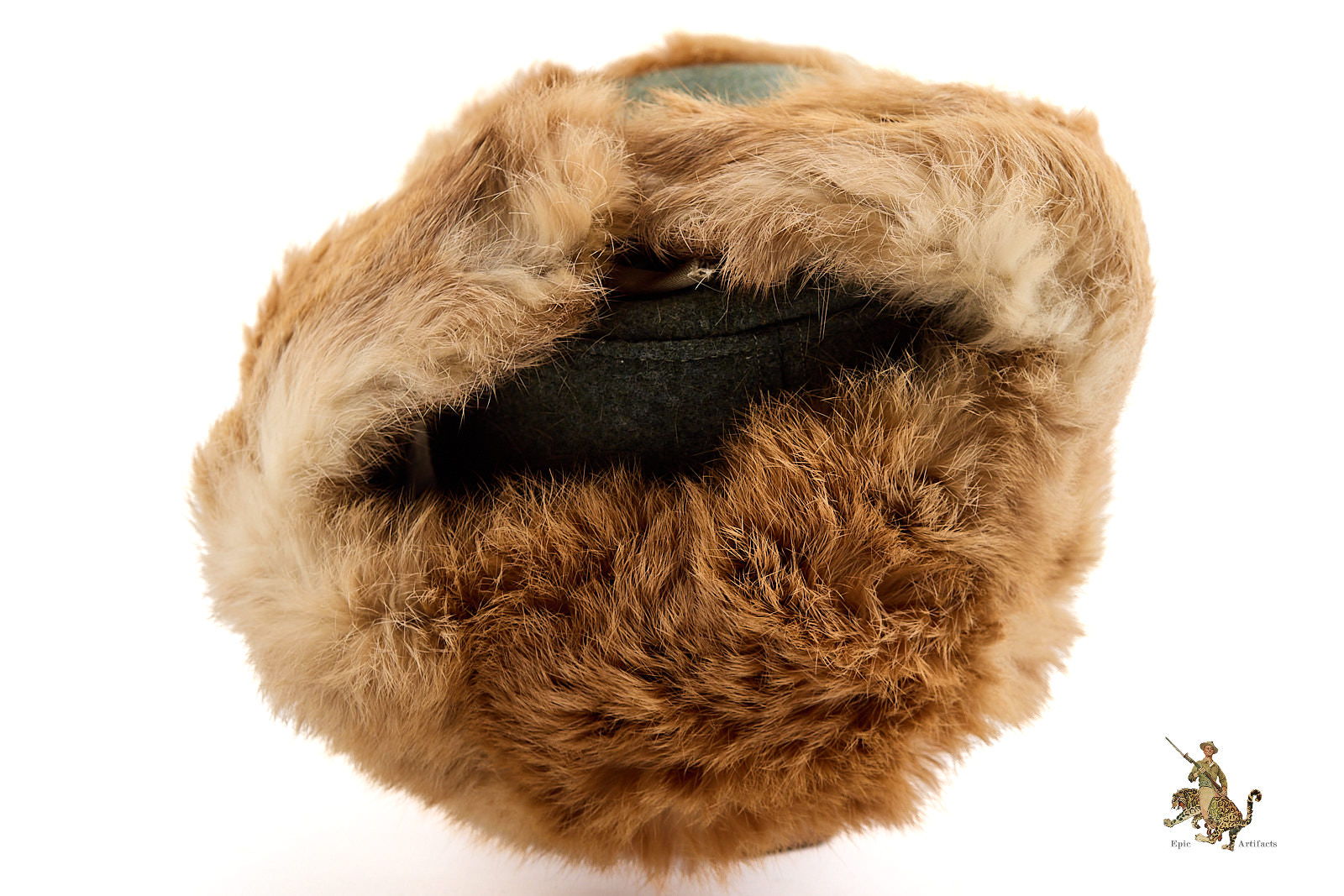 Product Description: An attractive and well-preserved German Heer Pelzmütze Winter Cap, presented here as a fine example of late-war German cold-weather headgear. The exterior is constructed from high-quality field-gray wool, complemented by luxurious light brown rabbit-fur ear flaps. The aluminum Heer eagle insignia retains a bright metallic sheen, with three prongs securely affixed. The interior is fully lined and clearly stamped size 55, dated 1943, and bears a maker’s mark that appears to be Walter Hüber. The button-and-loop fastening system on the ear flaps remains intact and fully functional, and each flap retains its original fabric ties intended for fastening beneath the chin in extreme conditions.