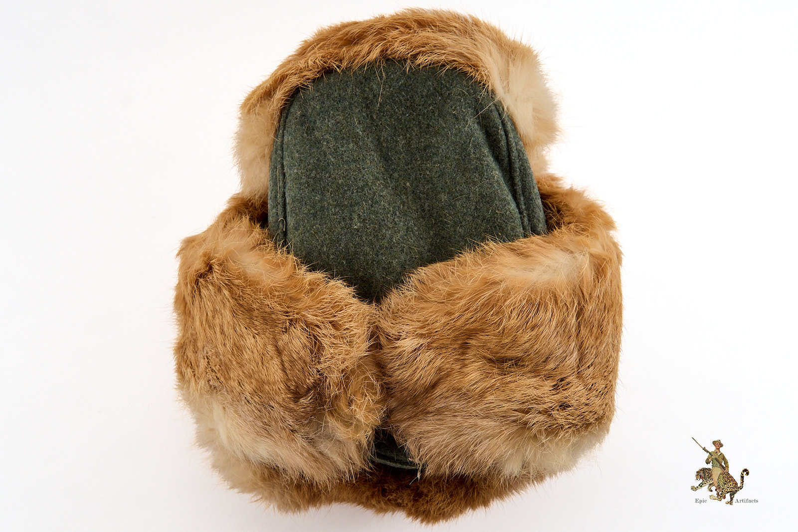Historical Description: German winter caps of the Second World War were developed as essential cold-weather gear for troops serving in the harsh climates of Eastern and Northern Europe. Early in the war, the Wehrmacht relied on modified versions of prewar ski caps and simple wool field caps, but the severe winter conditions encountered during the 1941–42 campaign in the Soviet Union exposed significant shortcomings in existing uniform provisions. As a result, the German Army, Luftwaffe, and Waffen-SS introduced a series of specialized winter caps designed to provide both insulation and practical field use. These caps were typically produced in field-gray, blue-gray, or camouflage-patterned fabrics, often incorporating fur or imitation-fur ear flaps, quilted linings, and adjustable chin ties to offer protection in freezing temperatures and strong winds.