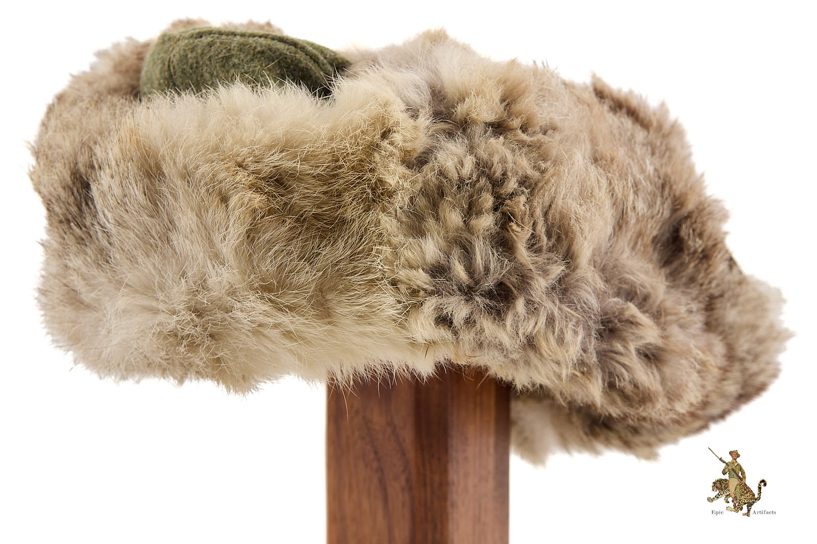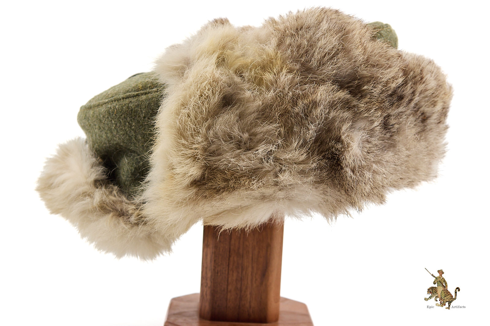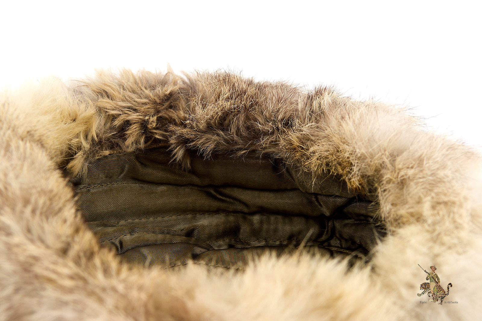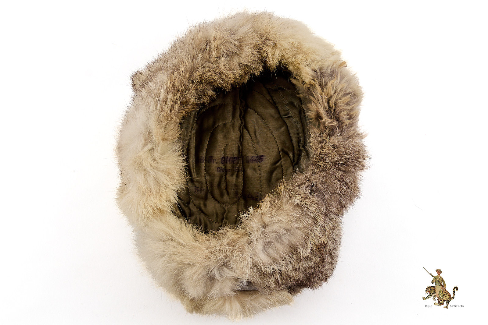 Product Description: An attractive and well-preserved German Heer Pelzmütze Winter Cap, presented here as a fine example of late-war German cold-weather headgear. The exterior is constructed from high-quality field-gray wool, complemented by luxurious rabbit-fur ear flaps. The aluminum Heer eagle insignia retains a bright metallic sheen, with both prongs securely affixed. The interior is fully lined and clearly stamped size 56, dated 1943, and bears a distinct maker’s mark. The button-and-loop fastening system on the ear flaps remains intact and fully functional, and each flap retains its original fabric ties intended for fastening beneath the chin in extreme conditions.