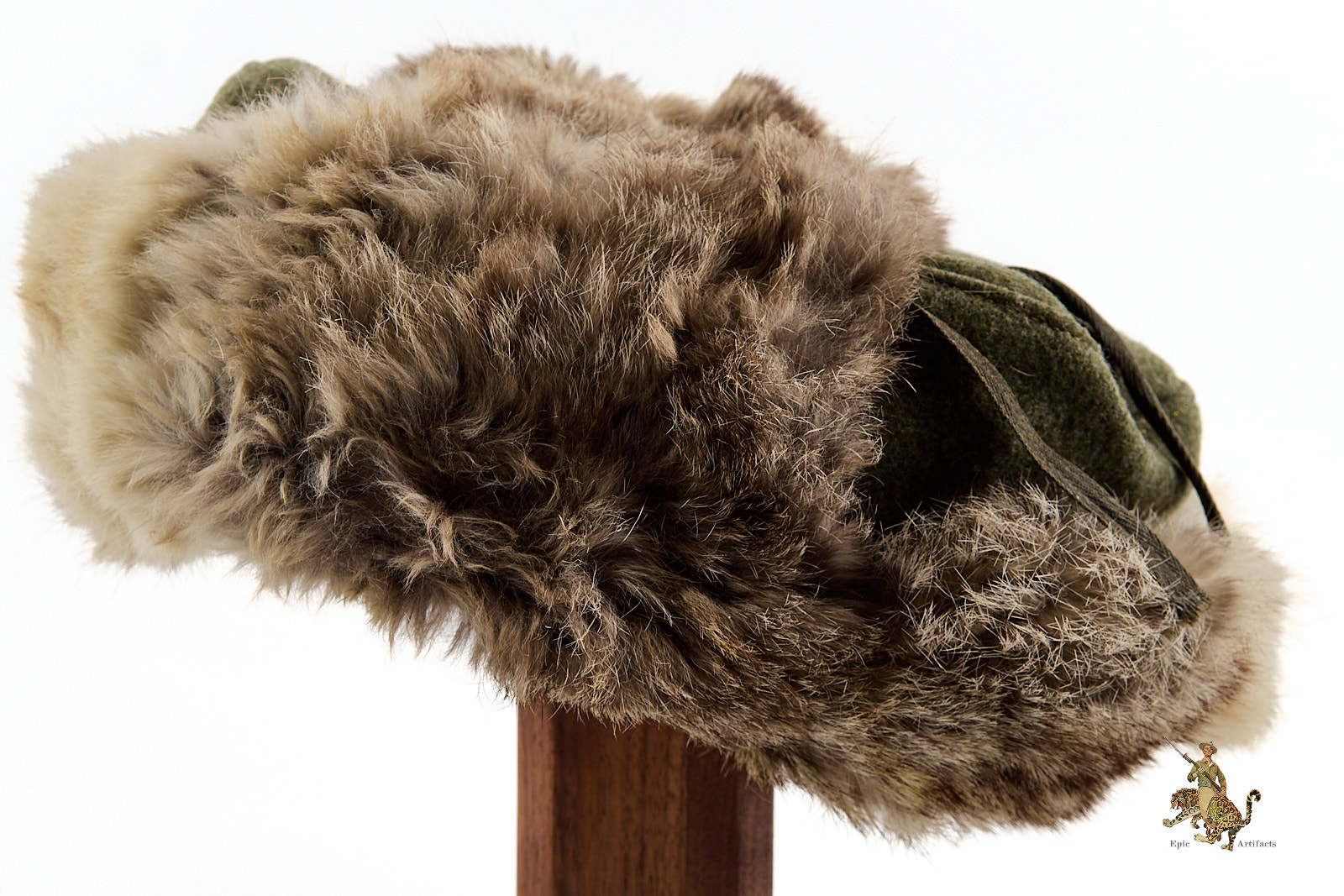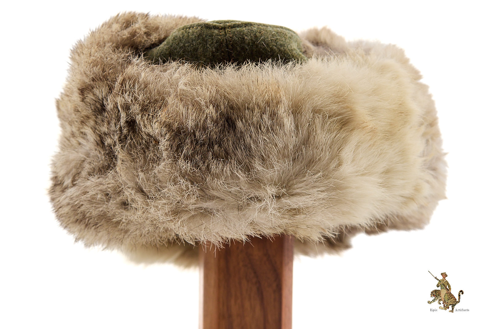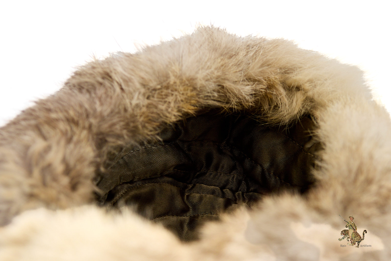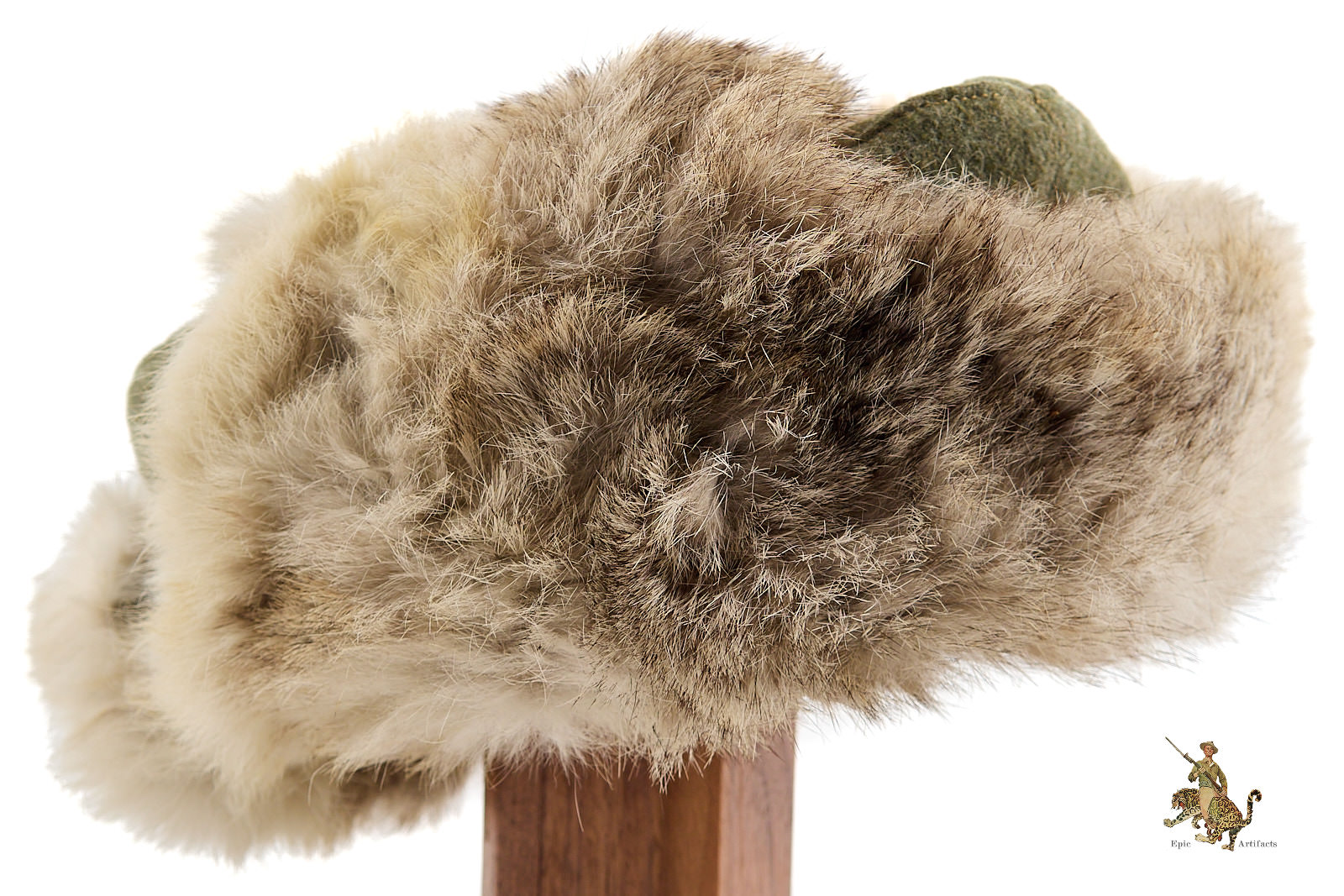 Product Description: An attractive and well-preserved German Heer Pelzmütze Winter Cap, presented here as a fine example of late-war German cold-weather headgear. The exterior is constructed from high-quality field-gray wool, complemented by luxurious rabbit-fur ear flaps. The aluminum Heer eagle insignia retains a bright metallic sheen, with both prongs securely affixed. The interior is fully lined and clearly stamped size 56, dated 1943, and bears a distinct maker’s mark. The button-and-loop fastening system on the ear flaps remains intact and fully functional, and each flap retains its original fabric ties intended for fastening beneath the chin in extreme conditions.