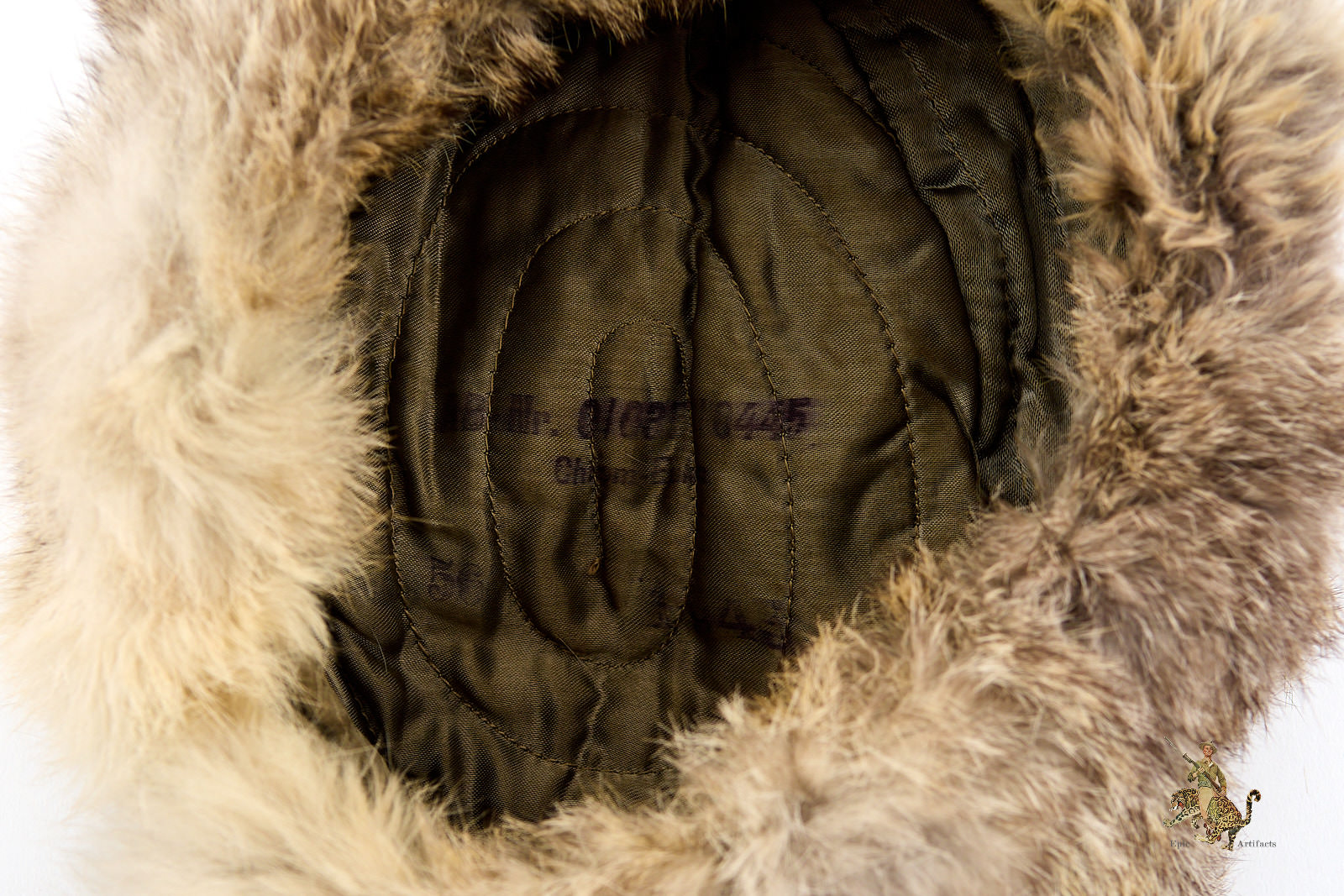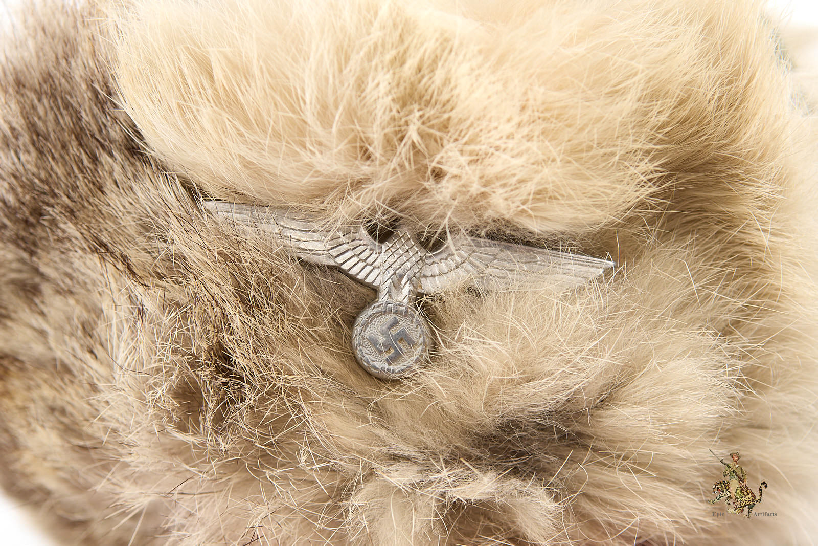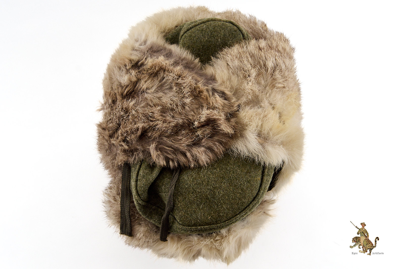 Historical Description: German winter caps of the Second World War were developed as essential cold-weather gear for troops serving in the harsh climates of Eastern and Northern Europe. Early in the war, the Wehrmacht relied on modified versions of prewar ski caps and simple wool field caps, but the severe winter conditions encountered during the 1941–42 campaign in the Soviet Union exposed significant shortcomings in existing uniform provisions. As a result, the German Army, Luftwaffe, and Waffen-SS introduced a series of specialized winter caps designed to provide both insulation and practical field use. These caps were typically produced in field-gray, blue-gray, or camouflage-patterned fabrics, often incorporating fur or imitation-fur ear flaps, quilted linings, and adjustable chin ties to offer protection in freezing temperatures and strong winds.