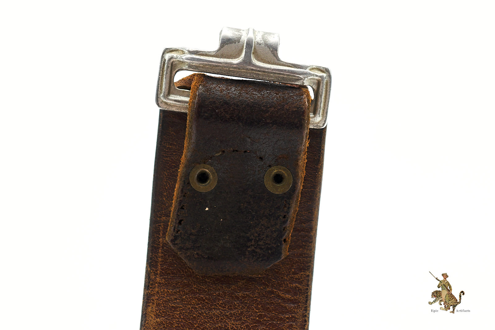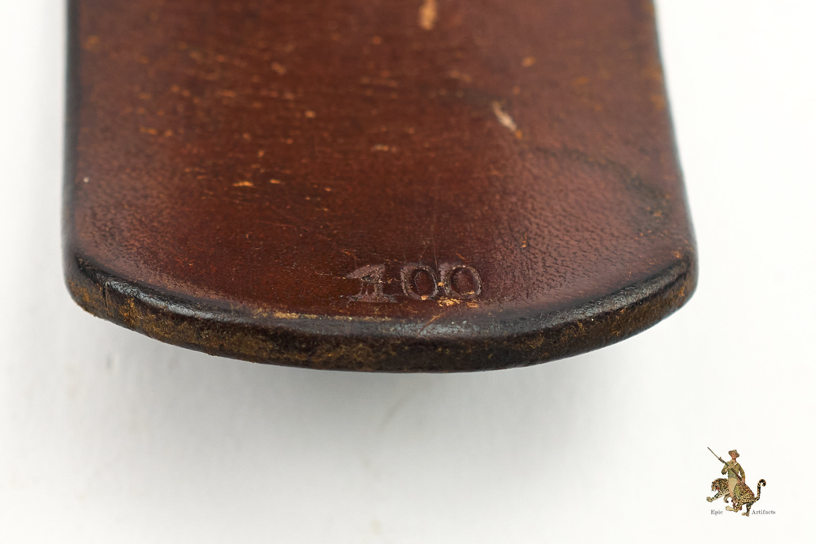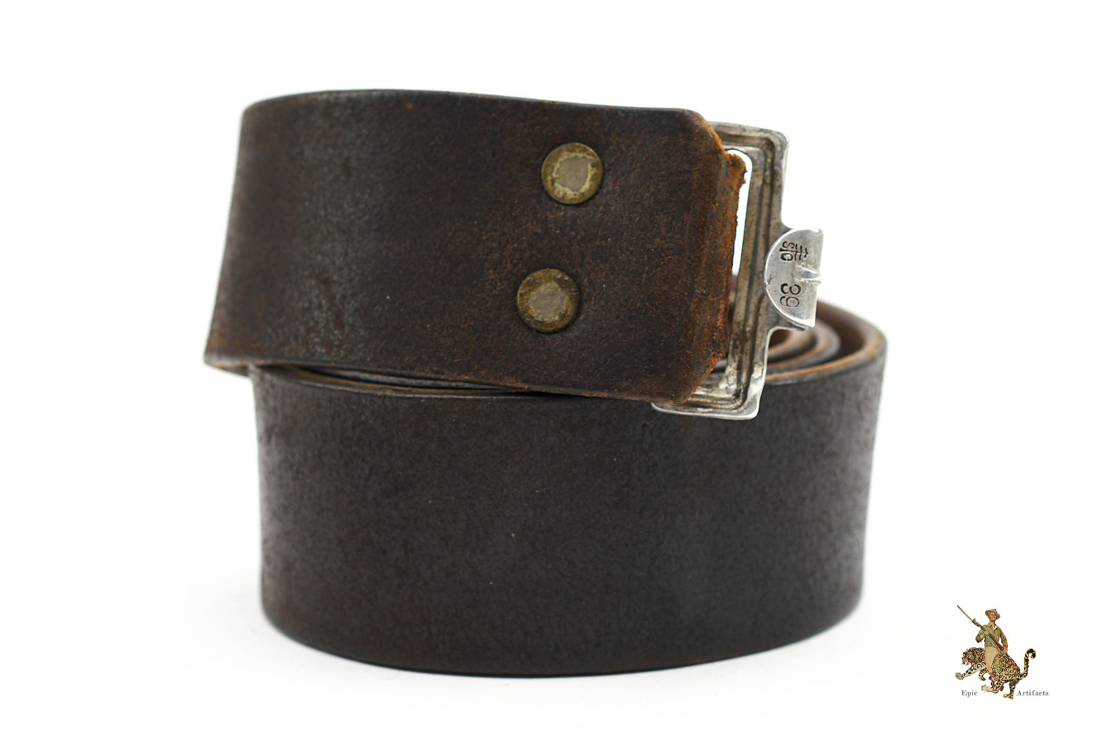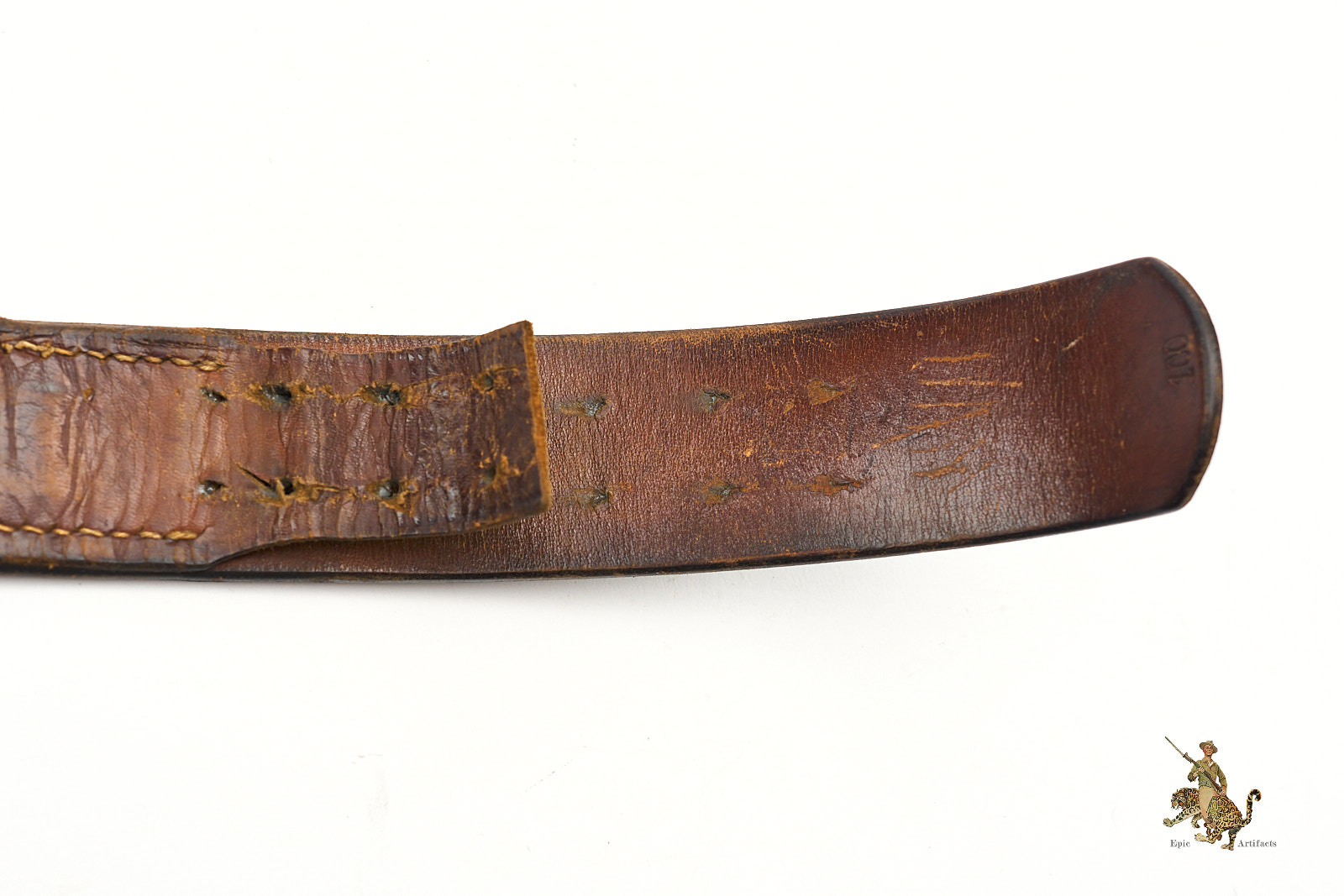 Product Description: German Leather Combat Belt, an attractive and well-preserved example, presented in excellent overall condition. The belt is clearly marked on the buckle hook SC for Schmole & Comp and dated 1939, with an additional size marking of 100. Measuring approximately 36¾ inches along the leather, it retains strong form and color, with the leather remaining notably soft and pliable.