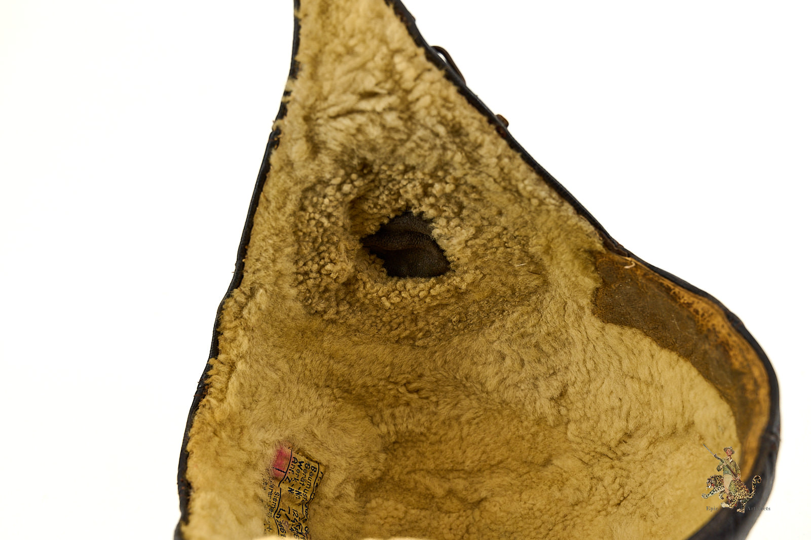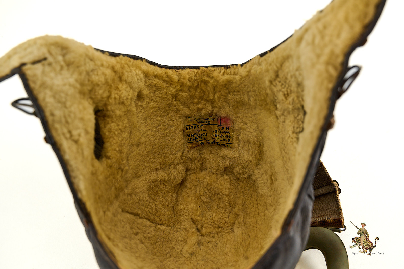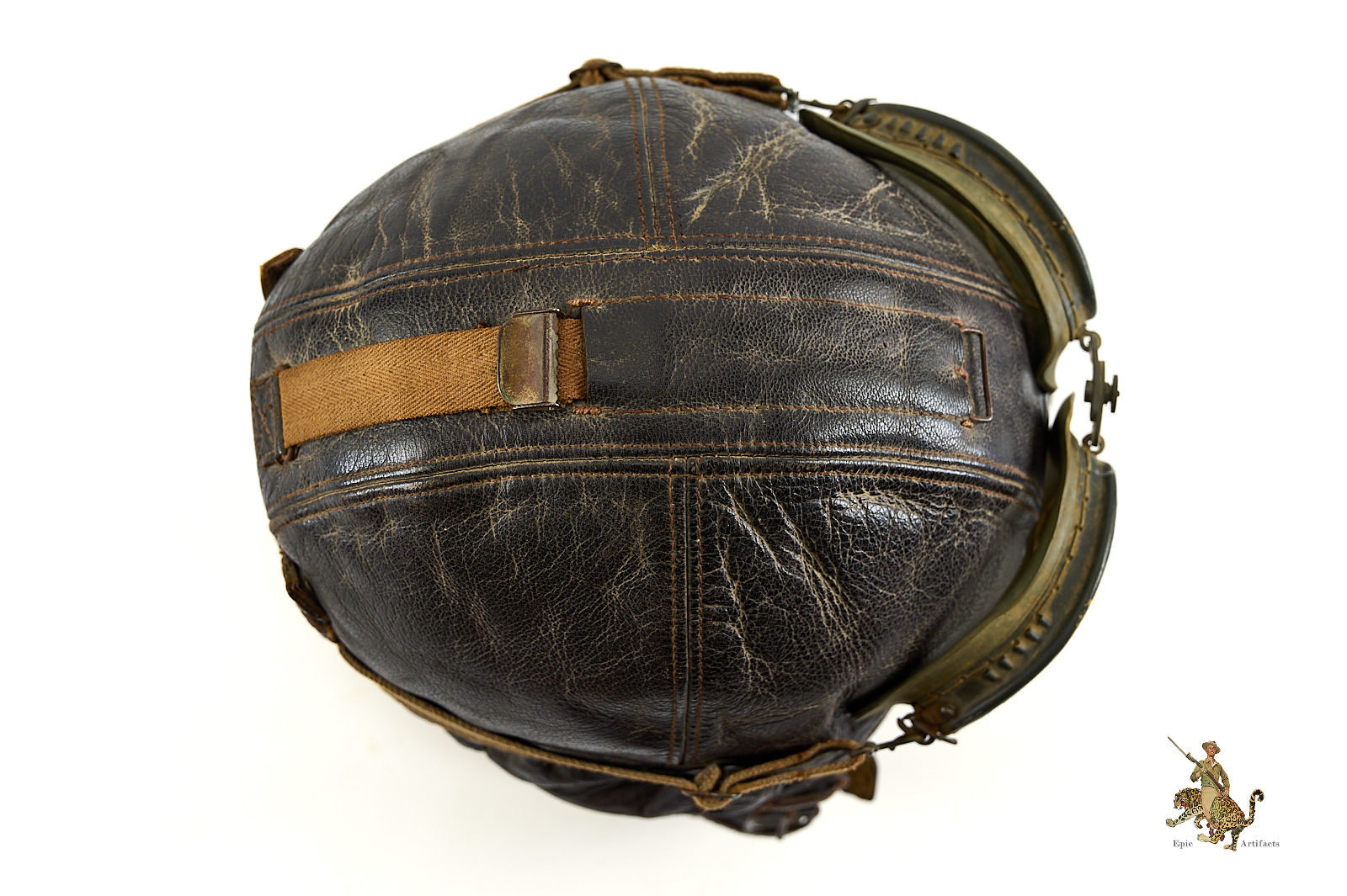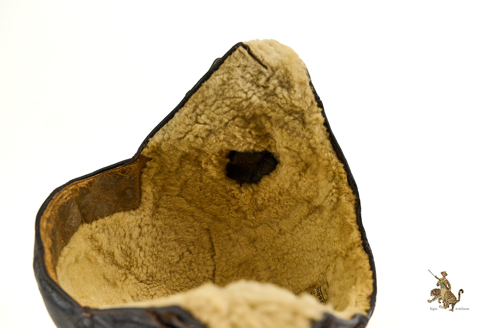 Product Description: A particularly attractive and well-preserved example of the German Leather Flight Cap with Goggles, exhibiting fine original craftsmanship and exceptional condition throughout. The rich brown leather exterior retains its deep, slightly glossy finish with only the lightest evidence of handling and service wear. All exterior stitching remains intact and tight, with fully functional brown-painted press snaps. The steel buckle and retaining clip show light, even patination and minor surface rust consistent with age.