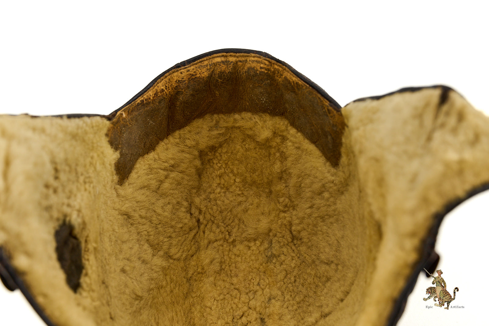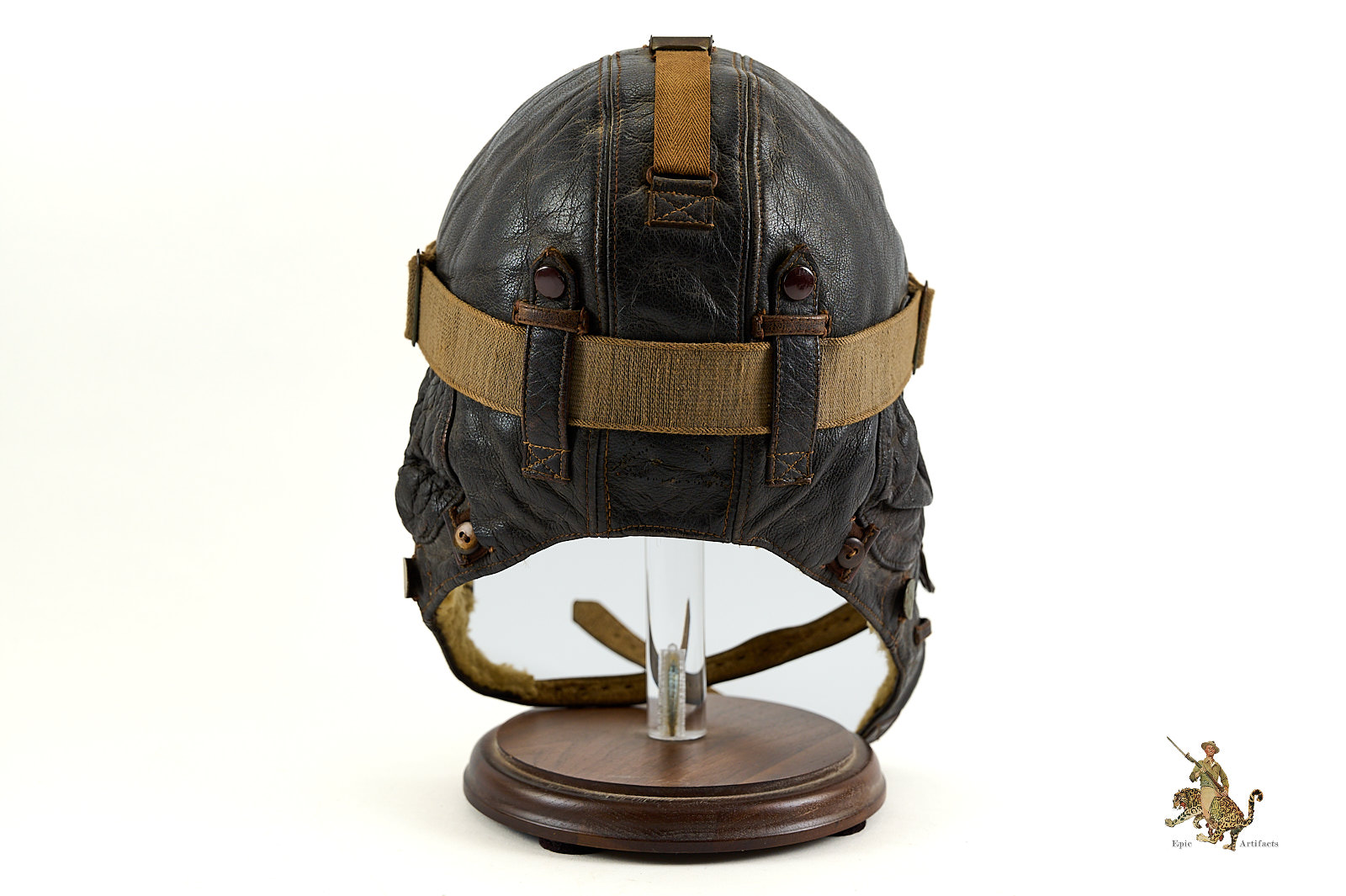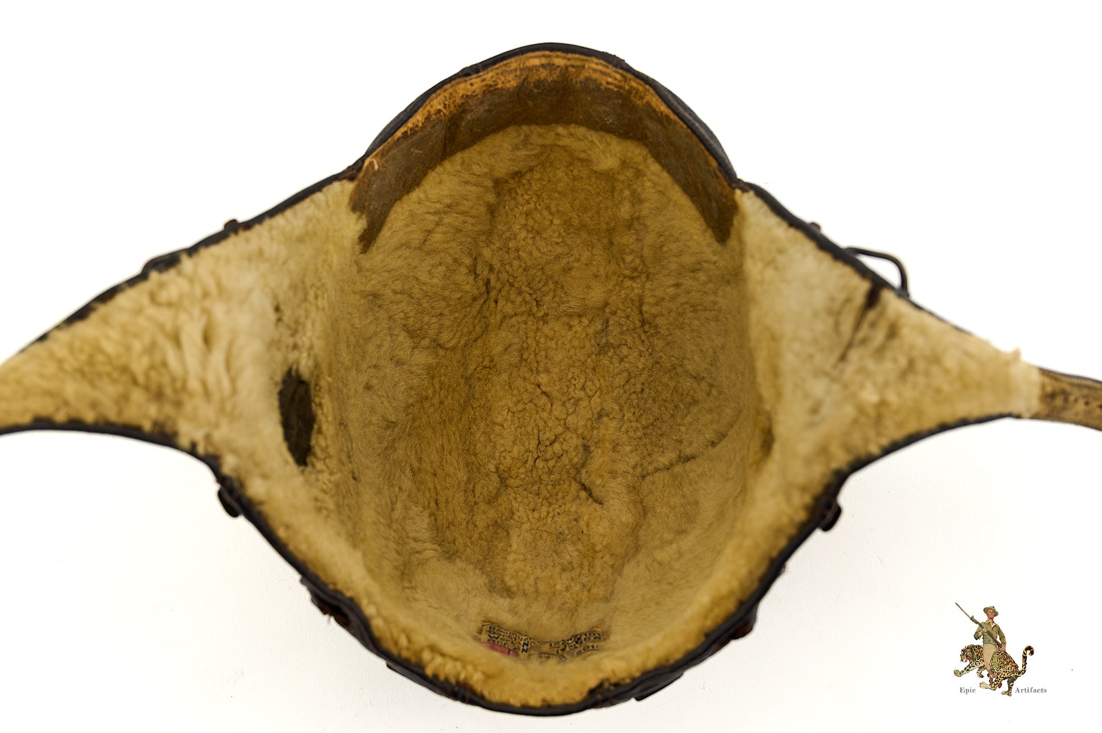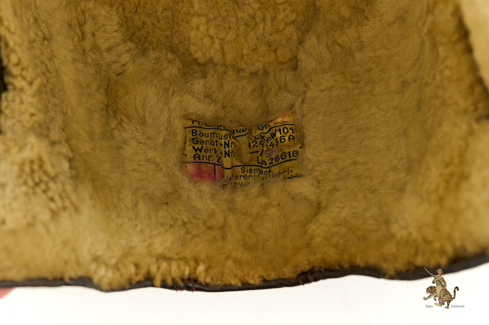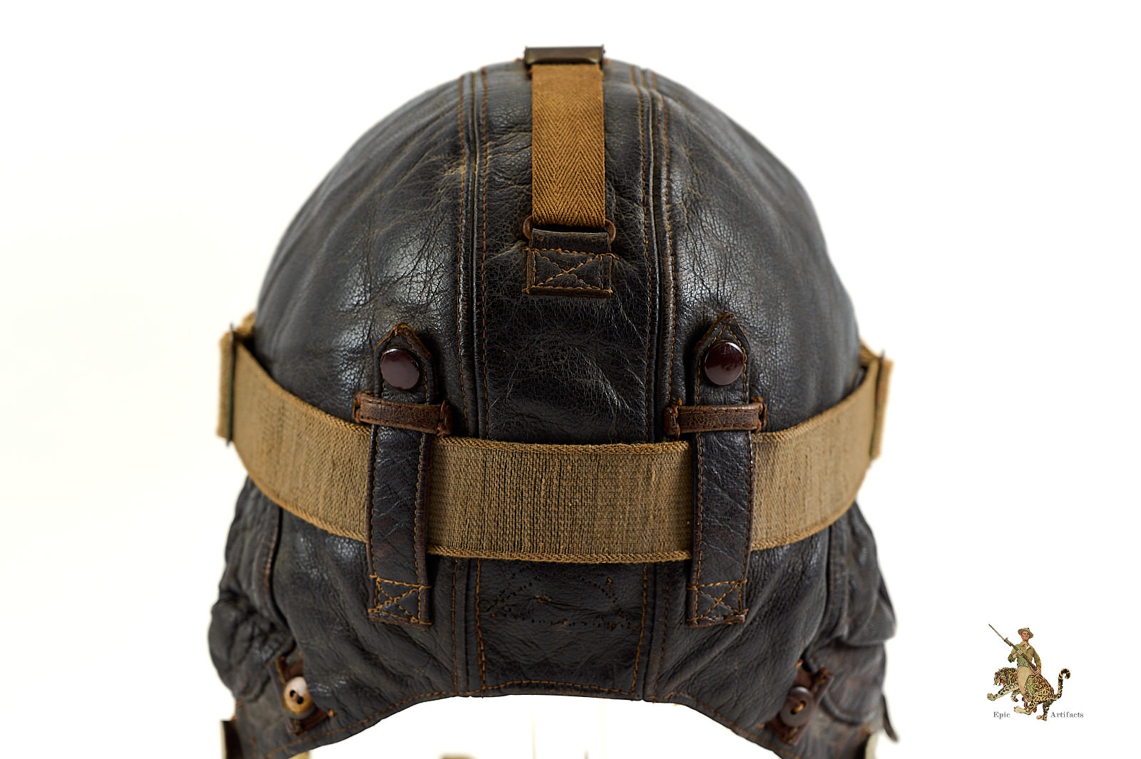Product Description: A particularly attractive and well-preserved example of the German Leather Flight Cap with Goggles, exhibiting fine original craftsmanship and exceptional condition throughout. The rich brown leather exterior retains its deep, slightly glossy finish with only the lightest evidence of handling and service wear. All exterior stitching remains intact and tight, with fully functional brown-painted press snaps. The steel buckle and retaining clip show light, even patination and minor surface rust consistent with age.