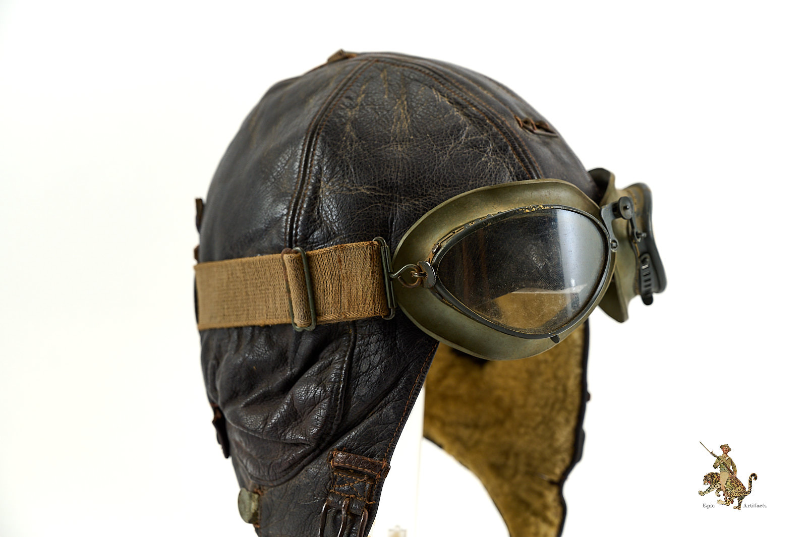 Historical Description: During WWII, flight service was extremely demanding and required specialized uniforms and equipment to deal with harsh aerial environments. Among the various belligerent nations, an extremely wide array of gear was utilized. The various air forces issued specialized flight gear for use in aircraft, in addition to the standard service uniforms. There were wool jackets, electrically heated suits, shearling jackets, and the iconic leather flight jackets. Airmen in unheated WWII-era aircraft were also generally equipped with extreme cold weather items such as leather pants and gloves, and heated shoes or boots. Parachutes, headsets, and similar equipment items were intended to help the airmen perform their duties in the incredibly challenging environment of aerial combat. Aircraft were also equipped with specialized survival gear such as life vests, inflatable rafts, water bottles and machetes, to offer airmen a chance at survival in the event of a crash landing. Headgear worn by WWII aviators ranged from visor caps and standard service caps, to various flight helmets (leather or otherwise) and even the steel helmet. Air force ground crew members also had their own uniforms. Uniforms and equipment worn by WWII aviators are sought after by collectors today.