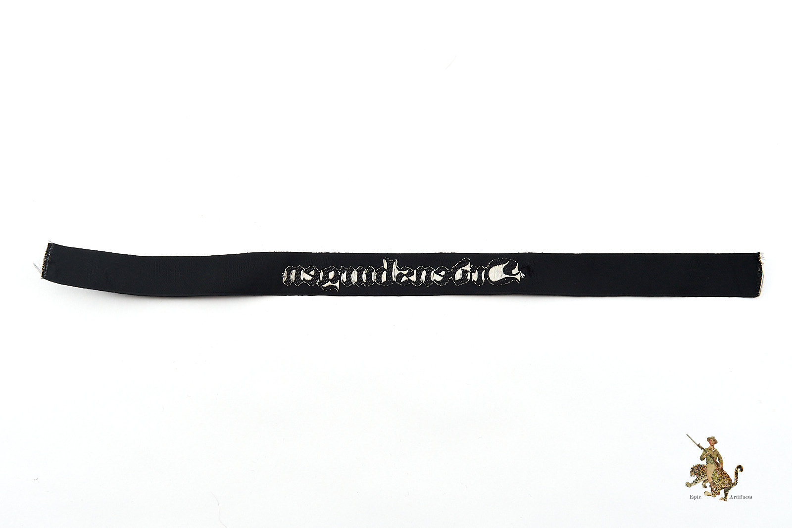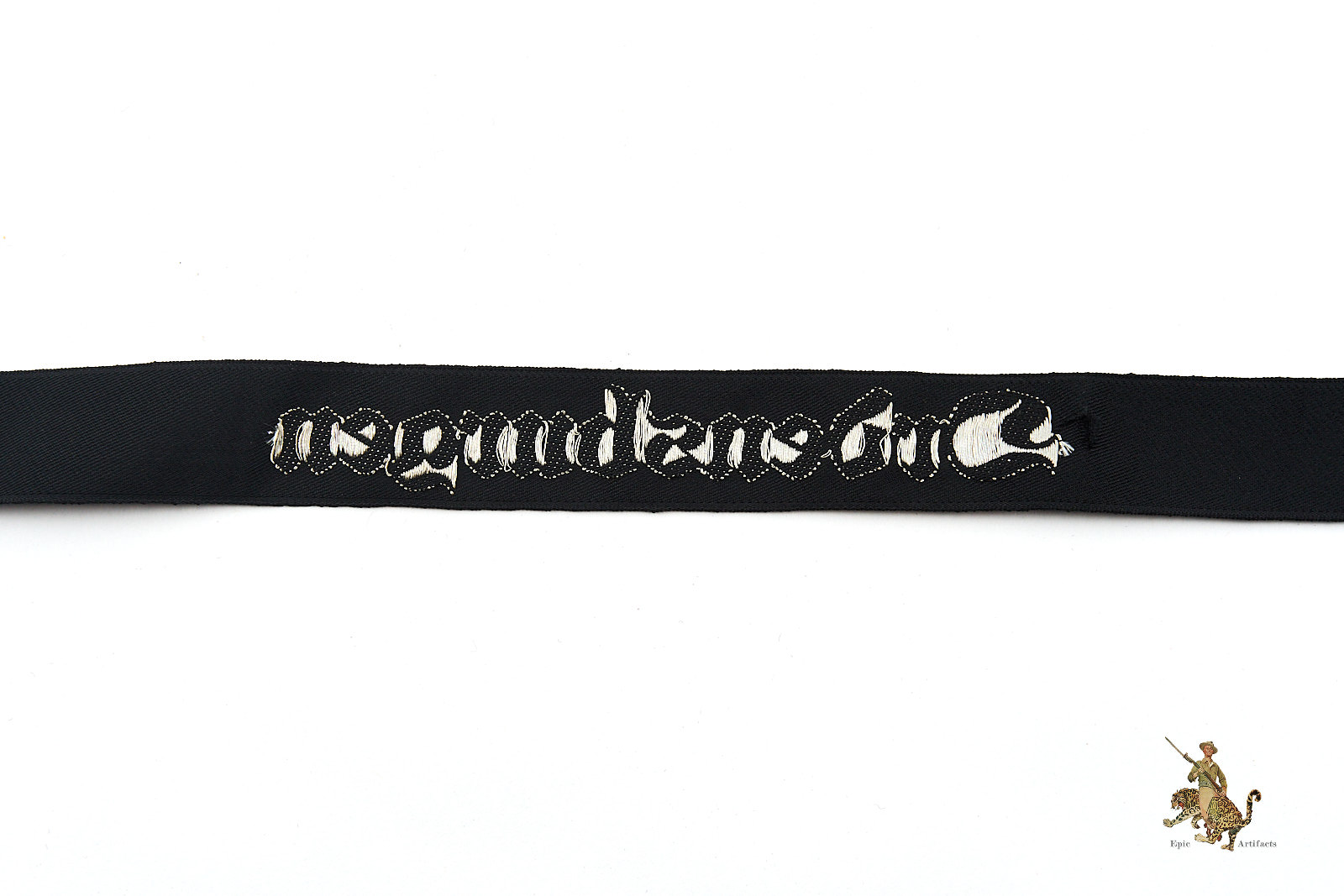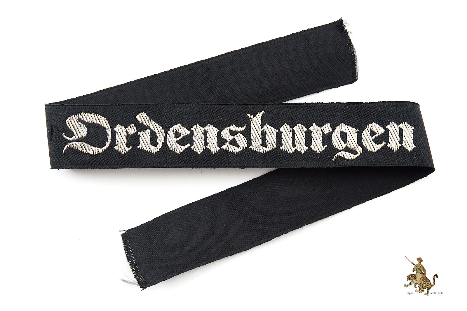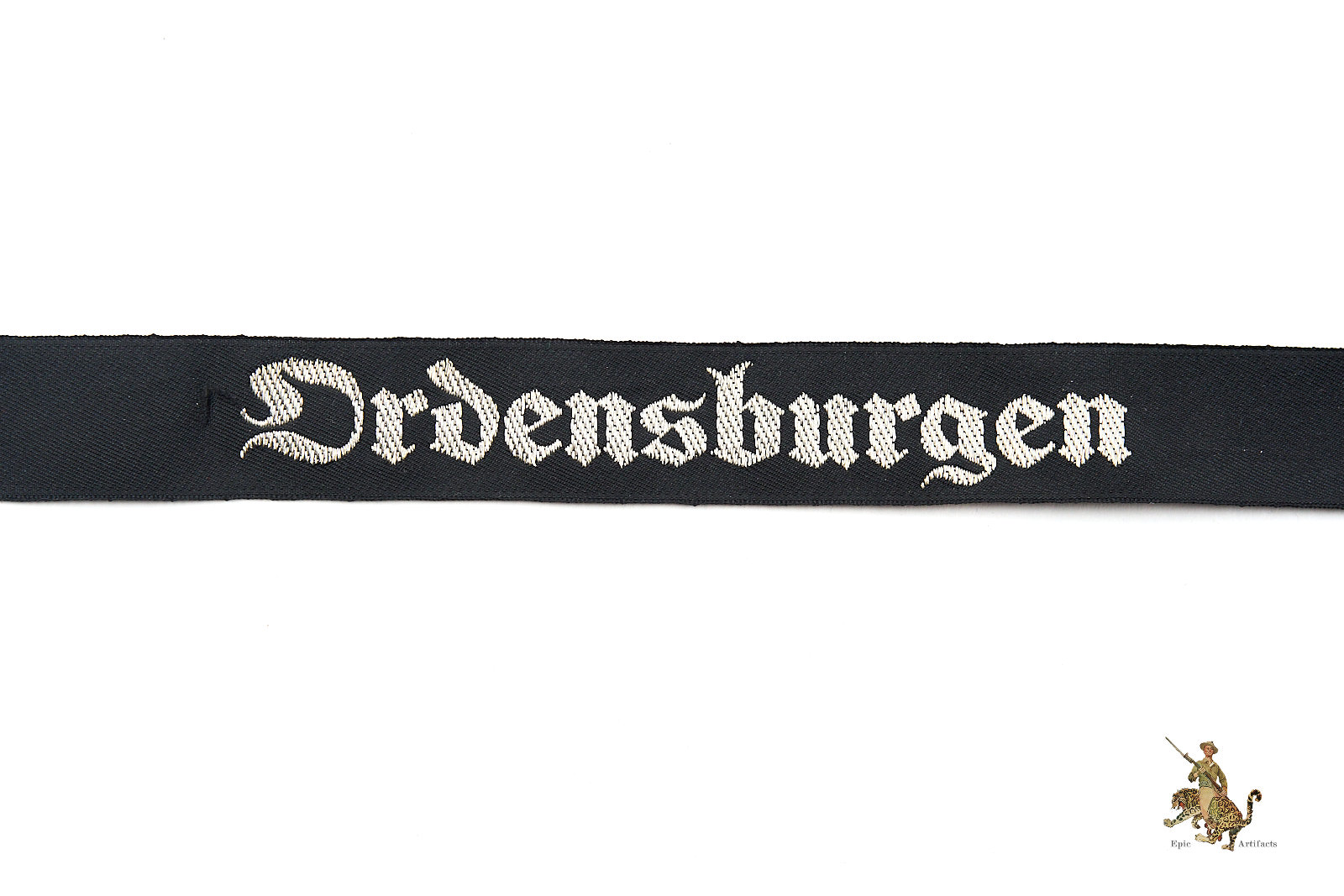 Product Description: This is an original “Ordensburgen” cufftitle, a machine-woven (BeVo) version made of black rayon with silver/aluminum flat-wire threads. The cufftitle features the word “Ordensburgen” in Gothic script, woven in bright silver threads. It measures approximately 14 1/2” in length and was worn during the 1937 period. The cufftitle is in excellent condition, with minimal signs of age or wear, and is an early pattern indicative of the political education system for the Nazi elite.