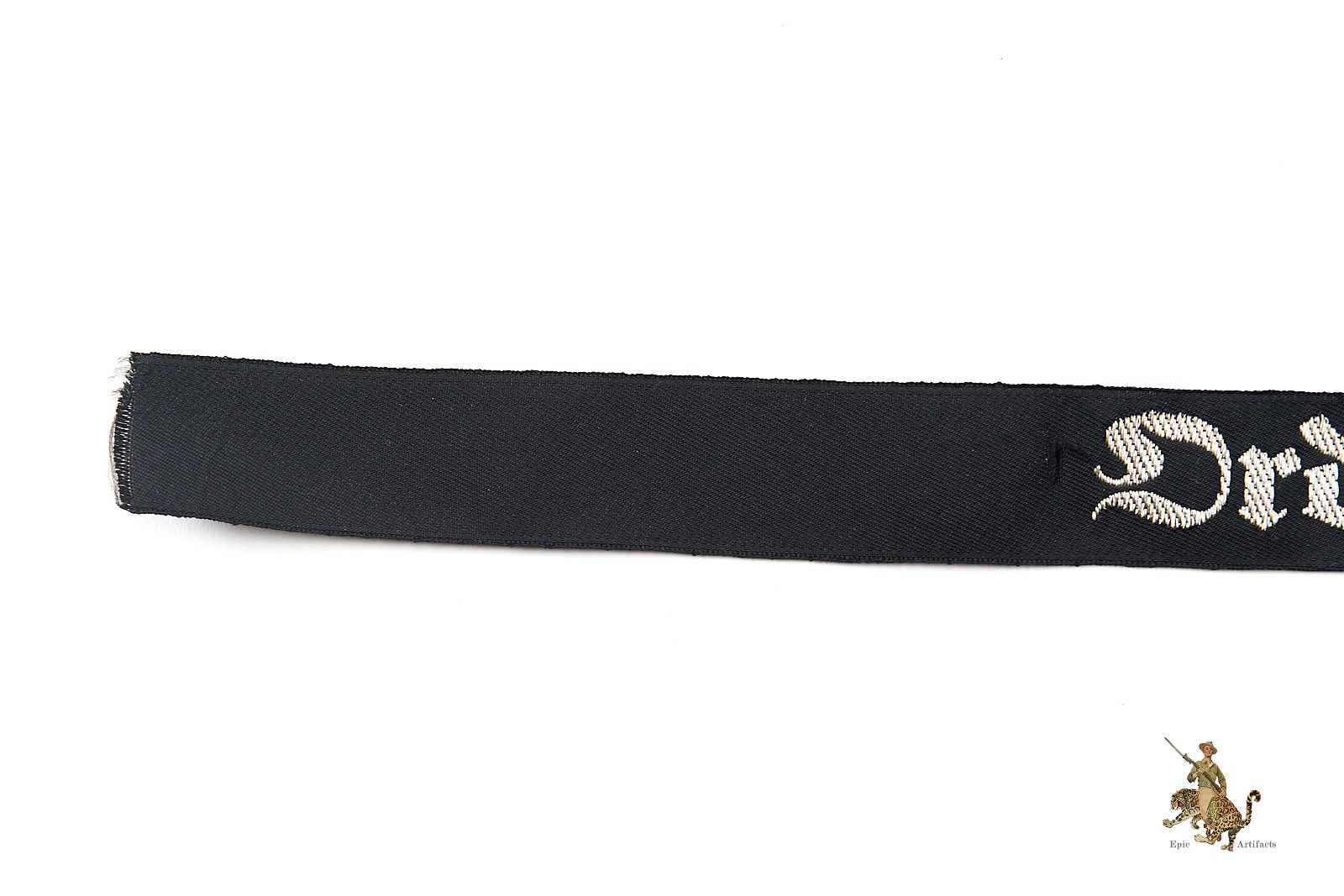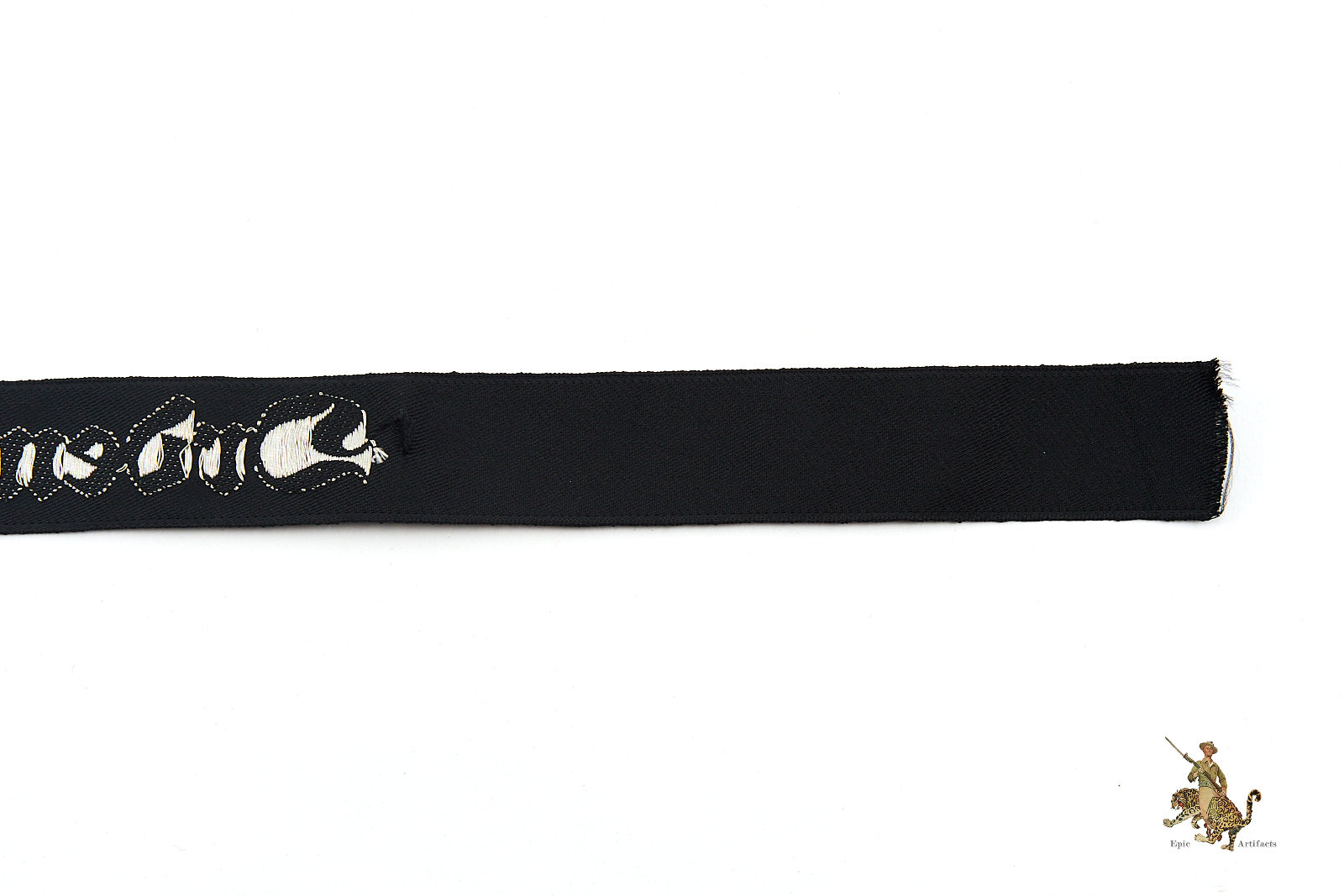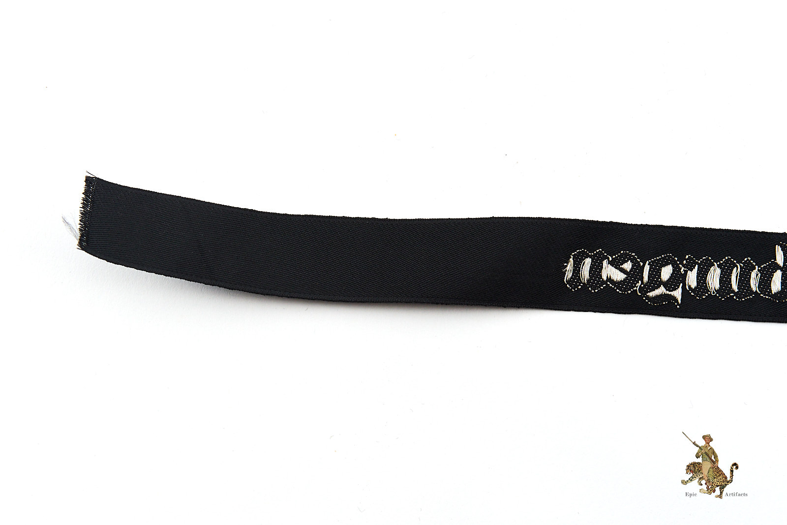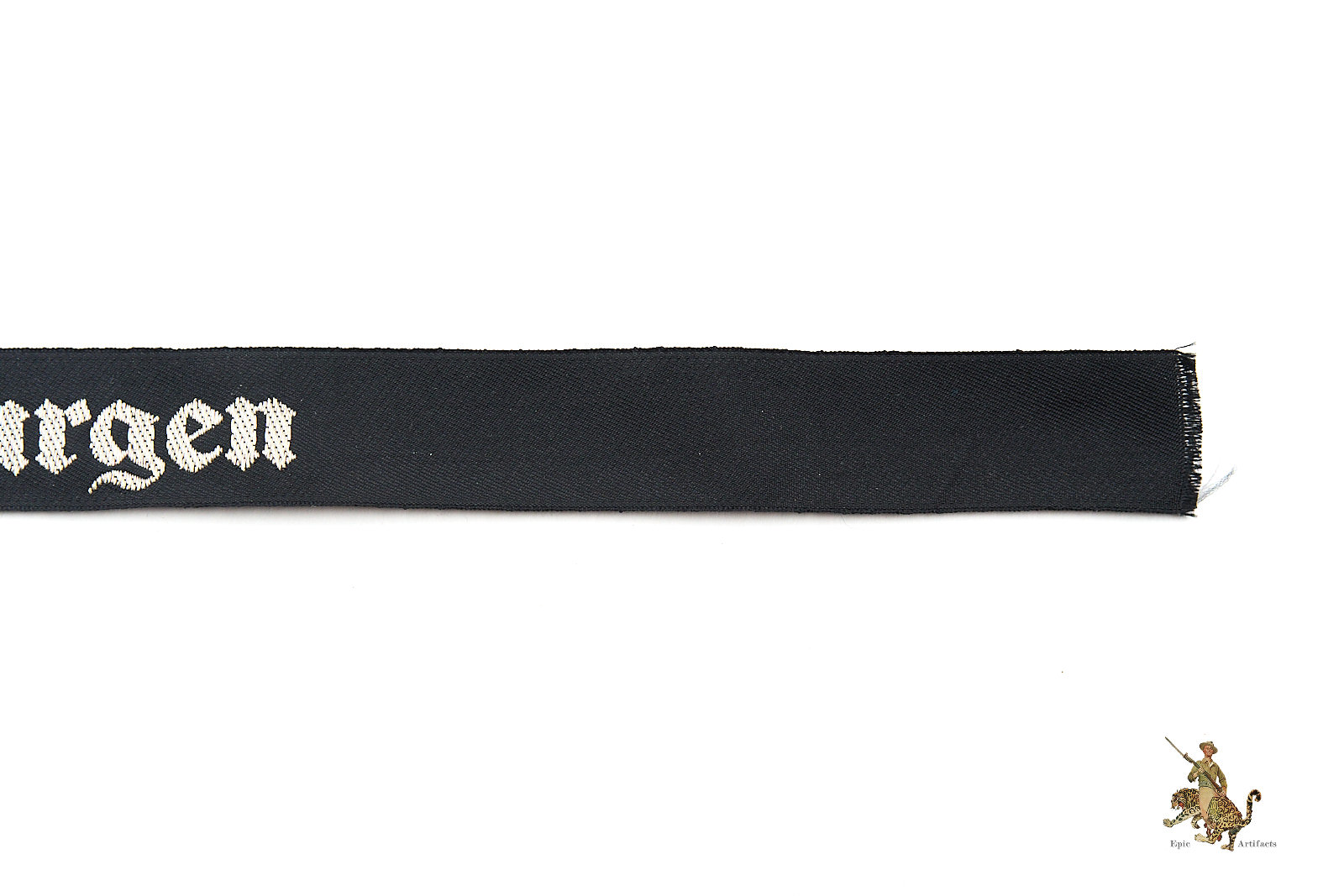 Product Description: This is an original “Ordensburgen” cufftitle, a machine-woven (BeVo) version made of black rayon with silver/aluminum flat-wire threads. The cufftitle features the word “Ordensburgen” in Gothic script, woven in bright silver threads. It measures approximately 14 1/2” in length and was worn during the 1937 period. The cufftitle is in excellent condition, with minimal signs of age or wear, and is an early pattern indicative of the political education system for the Nazi elite.