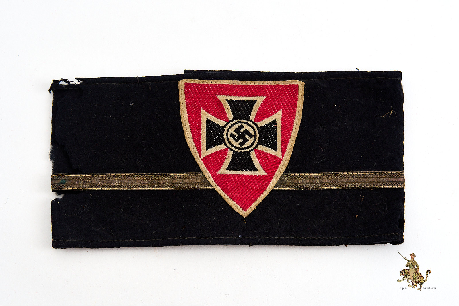 Historical Description: Nearly every military, civil, political and paramilitary organization in existence during the Third Reich used armbands. Armbands were worn on military and civilian uniforms and also on civilian clothes, from suit jackets to work clothing. They were used to denote membership in organizations, to indicate a specific role or function of the bearer, and as insignia of rank. Many organizations would change the design of their armbands over time, which added to the variety produced. These were manufactured in countless variations, ranging from simple printed bands to elaborately hand-embroidered pieces of the highest quality. Some Nazi armbands were worn by all members of large organizations and were made by the millions. Others were intended for use at a specific time and place and were unique. Many types were made in very limited numbers. Some bore metal insignia or special identifiers that indicated the wearer’s rank, unit affiliation, or nationality. Armbands were sometimes but not always marked with ink stamps by the issuing authorities.