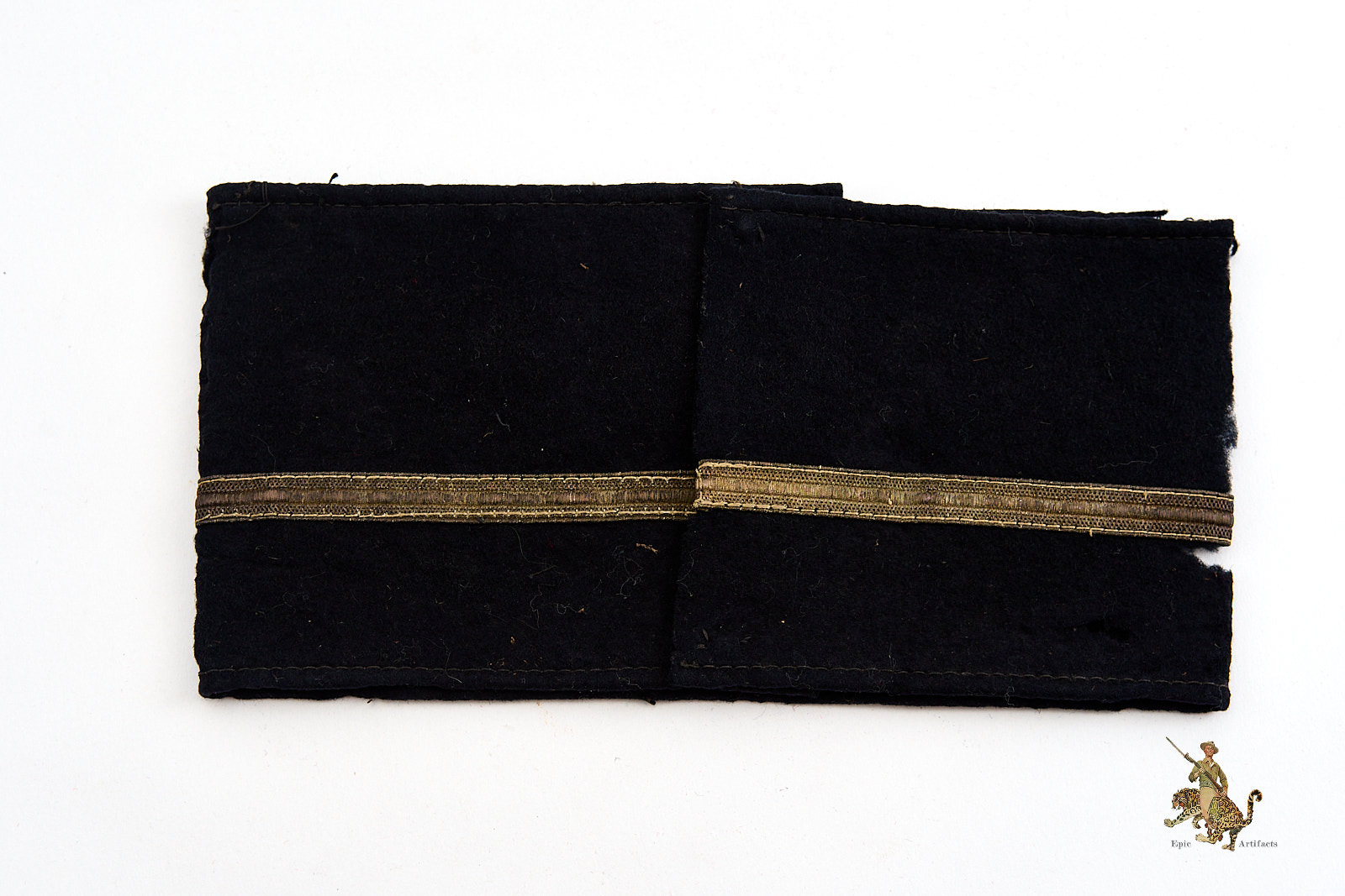 The armband shows honest period wear, including moth holes to the blue wool body and one side that has been cut. The reverse retains snap fasteners used to attach and easily remove the band from the tunic for laundering—an excellent, untouched detail indicative of true field use.