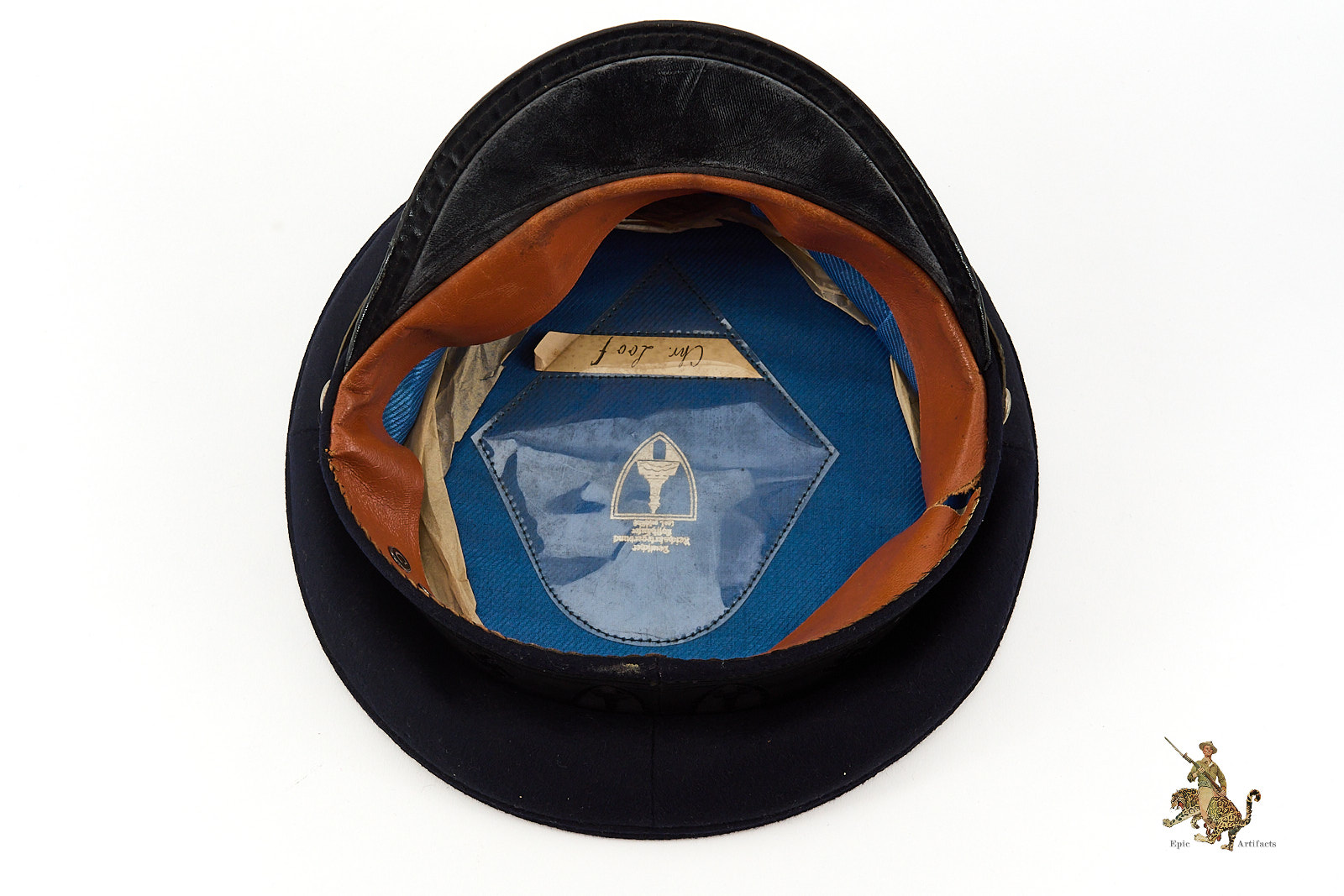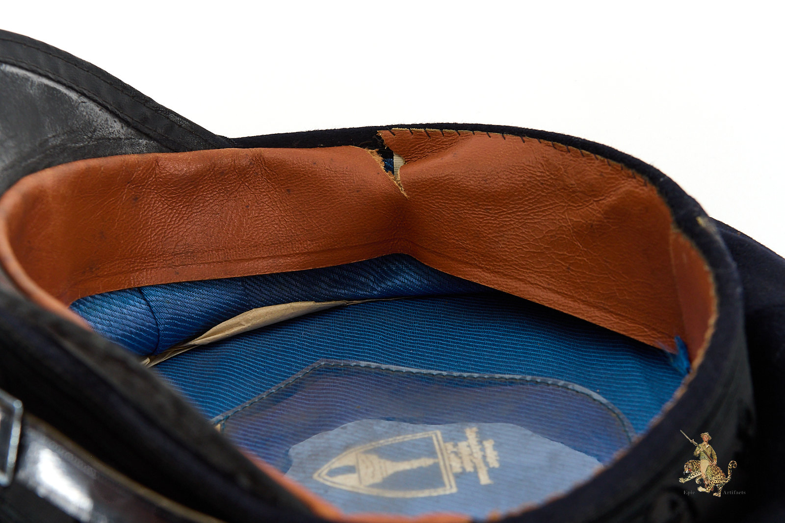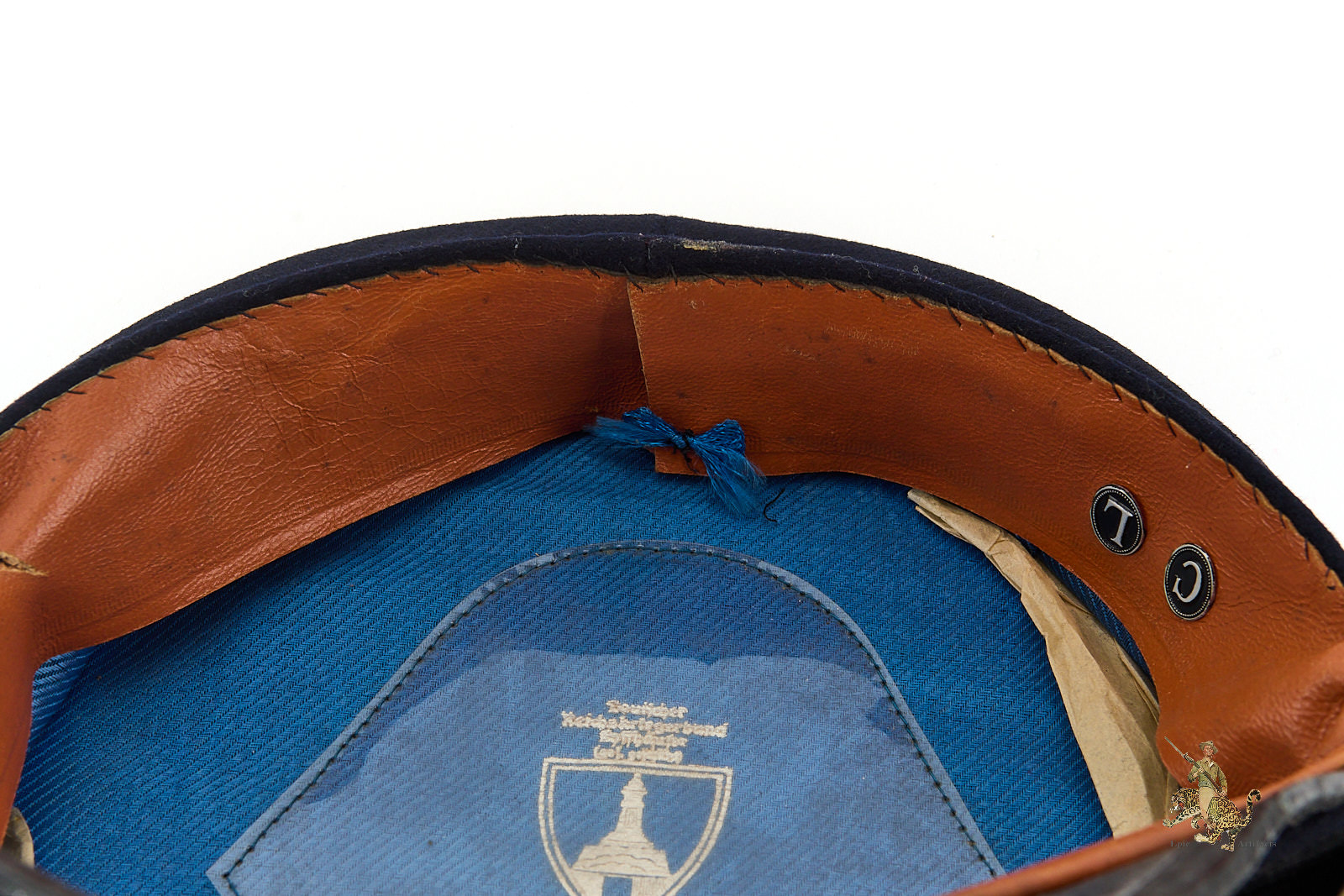 The interior is equally compelling, bearing a Kyffhäuserbund stamp within the crown alongside a maker’s mark in silver print. A personal touch is provided by a handwritten name, “Chr. Loof,” on an inserted slip of paper, further complemented by aluminum initial tabs “C L” affixed to the side of the leather sweatband. The sweatband itself remains largely intact, with only a small tear opposite the initials. The original tissue paper still remains around the crown as shown.  Overall, attractive and full of character, this German Veterans Kyffhäuserbund Visor Cap, combines originality, personalization, and excellent display appeal.  An increasingly scarce example of a German Veterans Kyffhäuserbund Visor Cap.  Overall this cap rates in excellent condition.