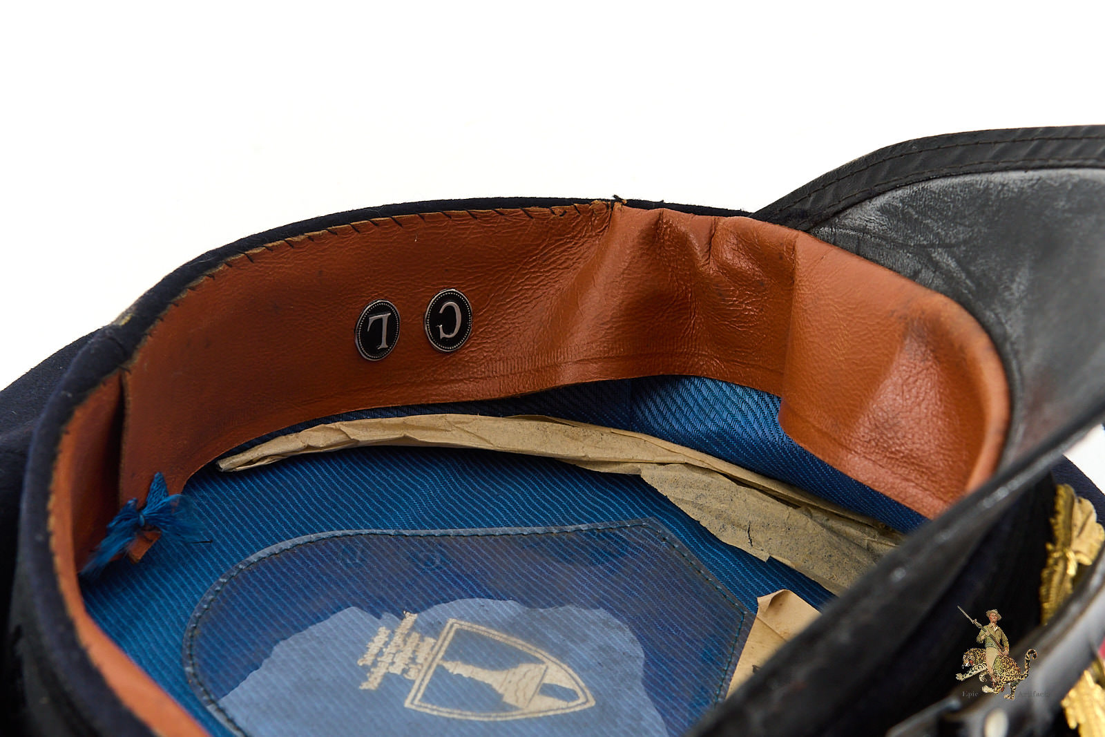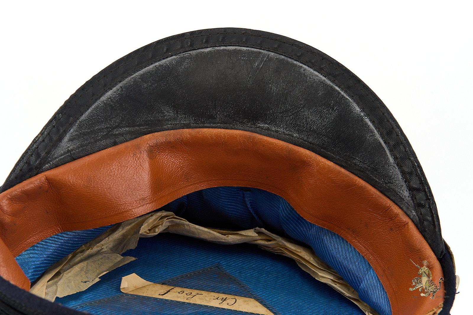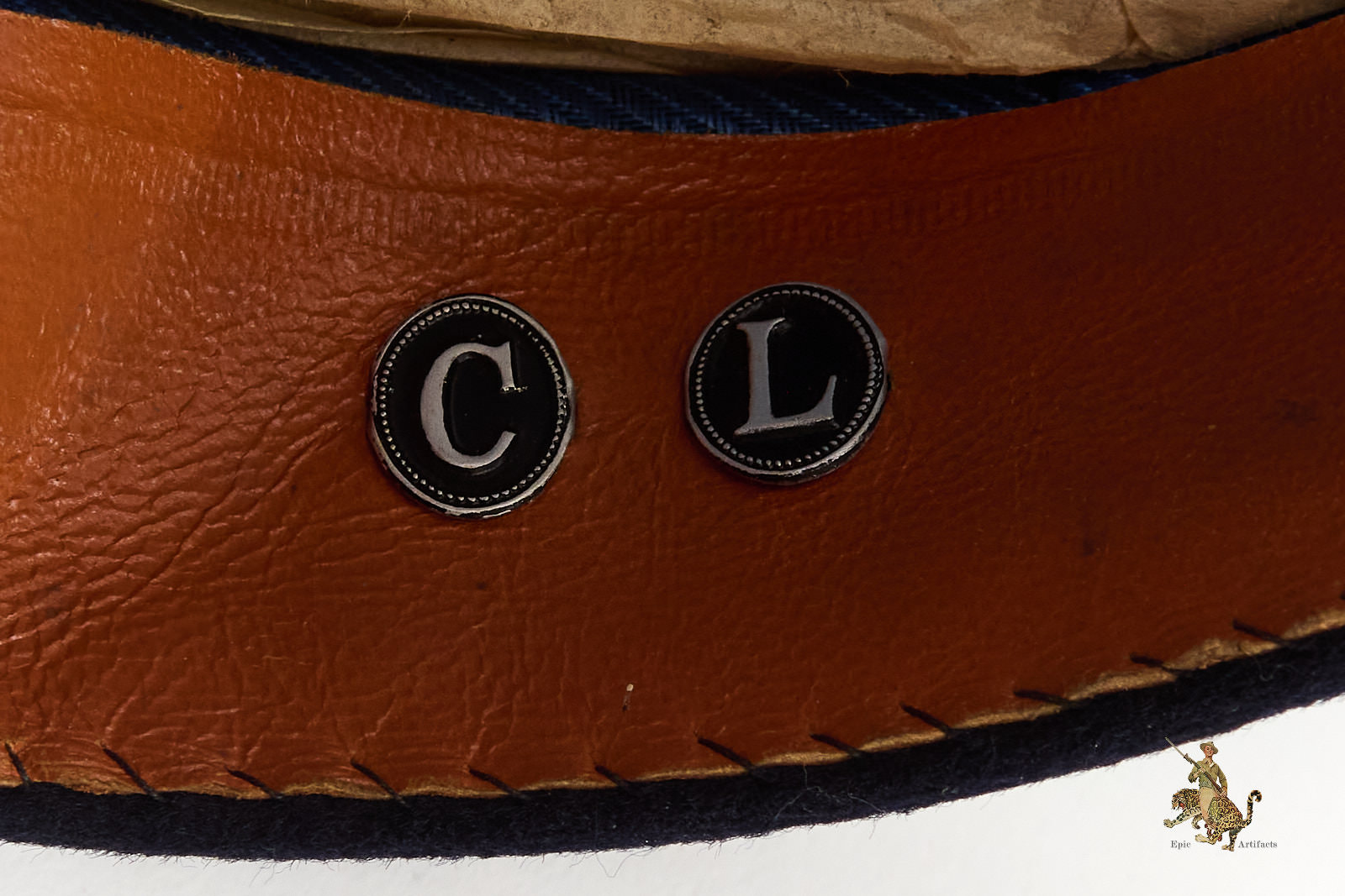The interior is equally compelling, bearing a Kyffhäuserbund stamp within the crown alongside a maker’s mark in silver print. A personal touch is provided by a handwritten name, “Chr. Loof,” on an inserted slip of paper, further complemented by aluminum initial tabs “C L” affixed to the side of the leather sweatband. The sweatband itself remains largely intact, with only a small tear opposite the initials. The original tissue paper still remains around the crown as shown.  Overall, attractive and full of character, this German Veterans Kyffhäuserbund Visor Cap, combines originality, personalization, and excellent display appeal.  An increasingly scarce example of a German Veterans Kyffhäuserbund Visor Cap.  Overall this cap rates in excellent condition.