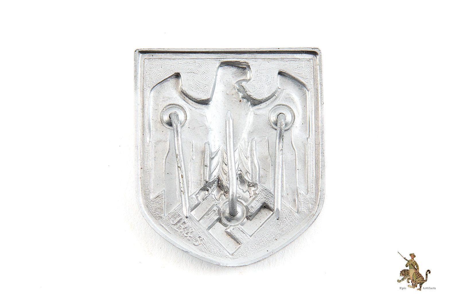 Product Description: Very nice Heer 2nd Pattern Pith Helmet Insignia – J.F.S.. This Heer Pith Helmet Shield is constructed out of a die struck zinc-alloy base that has been silver washed with black paint. Shield retains all three of the intact prongs which are crimped. The shield emblem depicts a Heer Eagle gripping Swastika. The emblem is near mint, with full original finish on the obverse. The Heer Pith Helmet Shield is maker marked “J.F.S.” for the firm Josef Felix Sohn, in Ludenscheid.