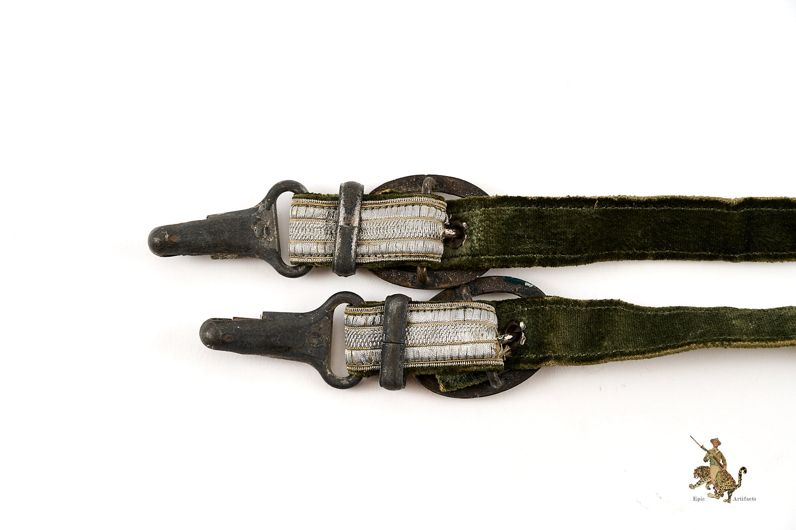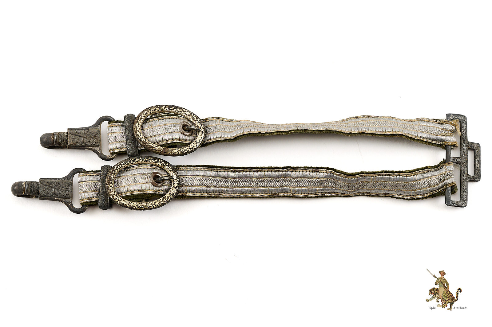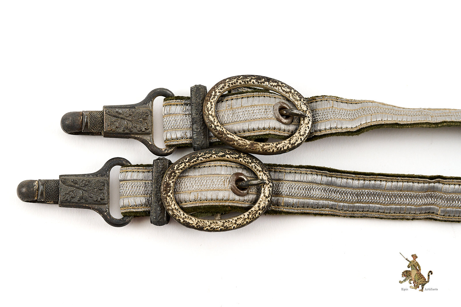 Product Description: This is a very nice set of Heer (Army) Dagger Officer Hangers, perfect for completing a dagger. They are complete, and very clean, showing only very slight traces of age and wear. The aluminum wire braid is nice and bright, with no damage and only very light wear. The backing fabric is a high quality velvet, in an appealing field gray shade, and shows no staining.  A small amount of fraying to the bullion tape on on strap where attached through the loop. The hardware is zinc based, as is typical, and still retains most of the original light silver finish to the buckles, while the other fittings show the underlying zinc. The detail is crisp, with no wear to the finely executed ornamentation. These Heer (Army) Dagger Officer Hangers are well-made, and well-preserved. The condition rates as excellent.