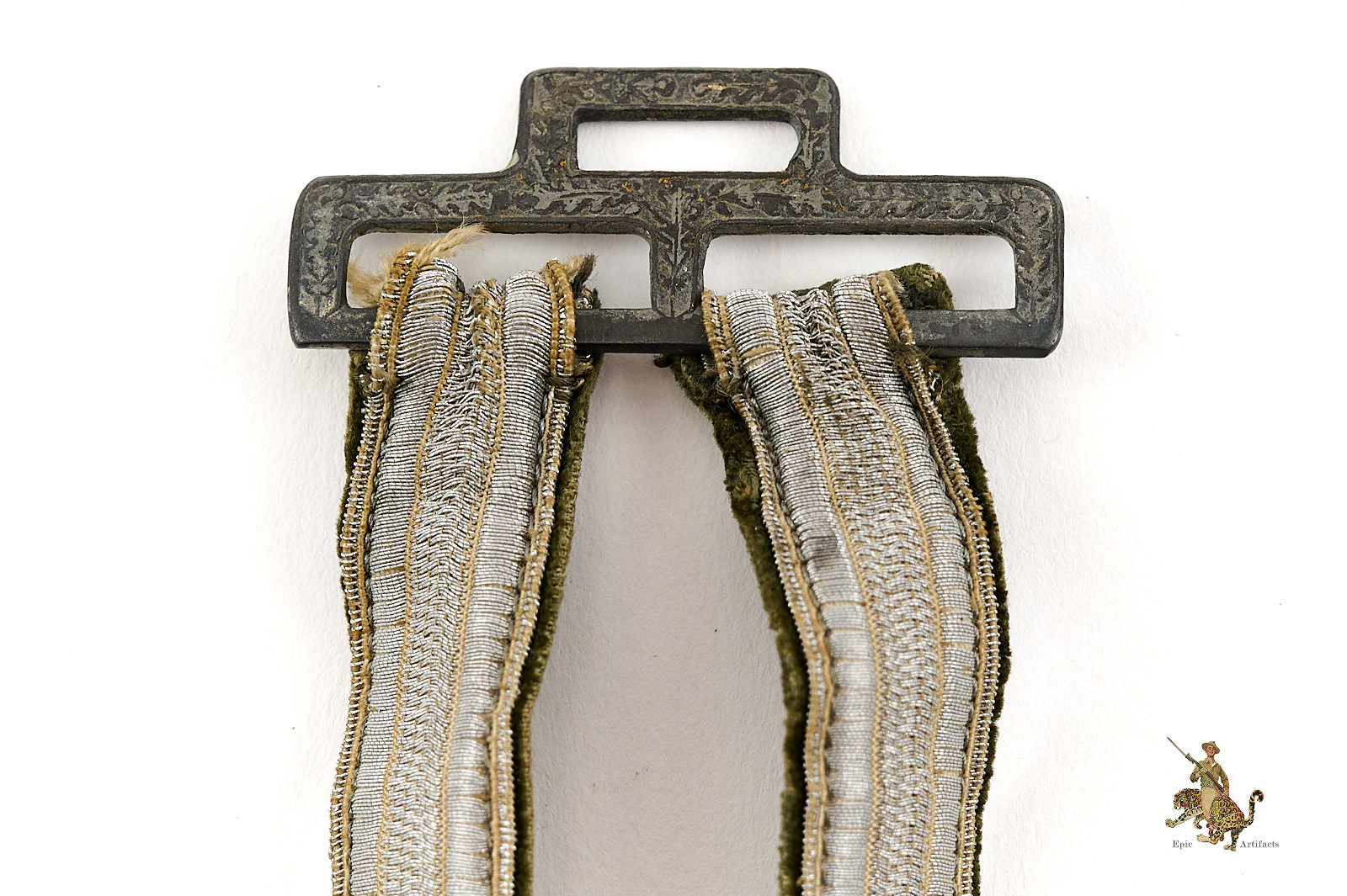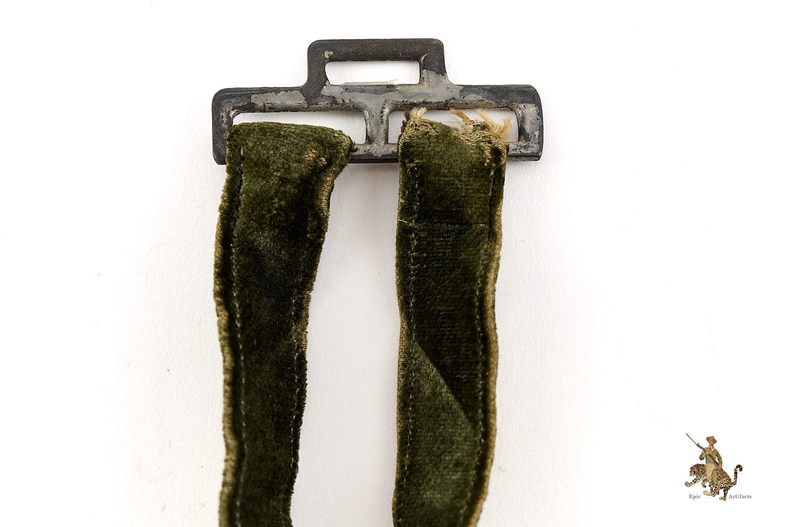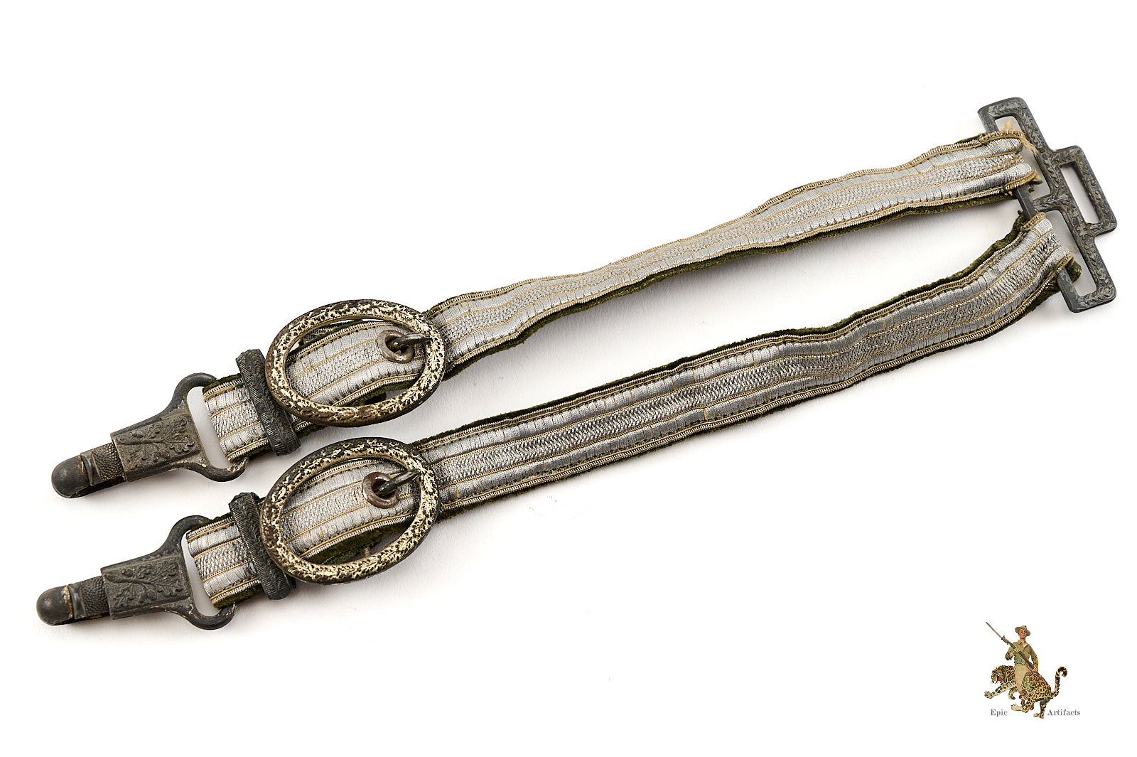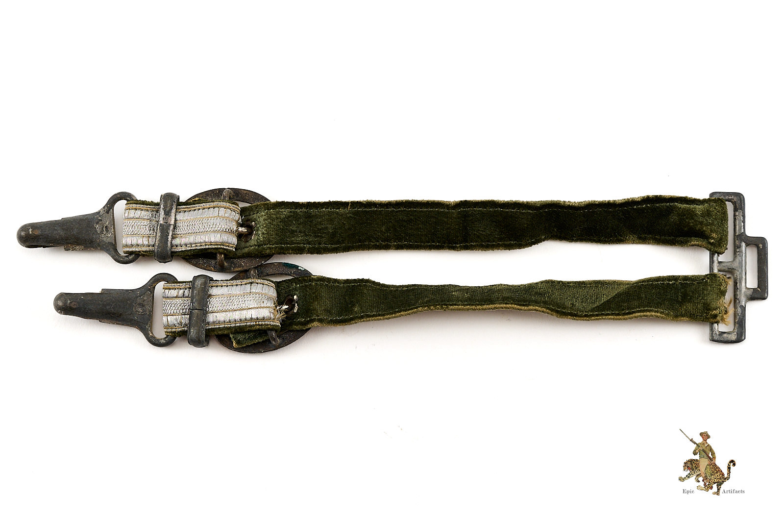 Product Description: This is a very nice set of Heer (Army) Dagger Officer Hangers, perfect for completing a dagger. They are complete, and very clean, showing only very slight traces of age and wear. The aluminum wire braid is nice and bright, with no damage and only very light wear. The backing fabric is a high quality velvet, in an appealing field gray shade, and shows no staining.  A small amount of fraying to the bullion tape on on strap where attached through the loop. The hardware is zinc based, as is typical, and still retains most of the original light silver finish to the buckles, while the other fittings show the underlying zinc. The detail is crisp, with no wear to the finely executed ornamentation. These Heer (Army) Dagger Officer Hangers are well-made, and well-preserved. The condition rates as excellent.