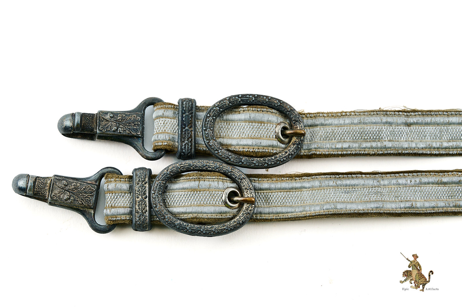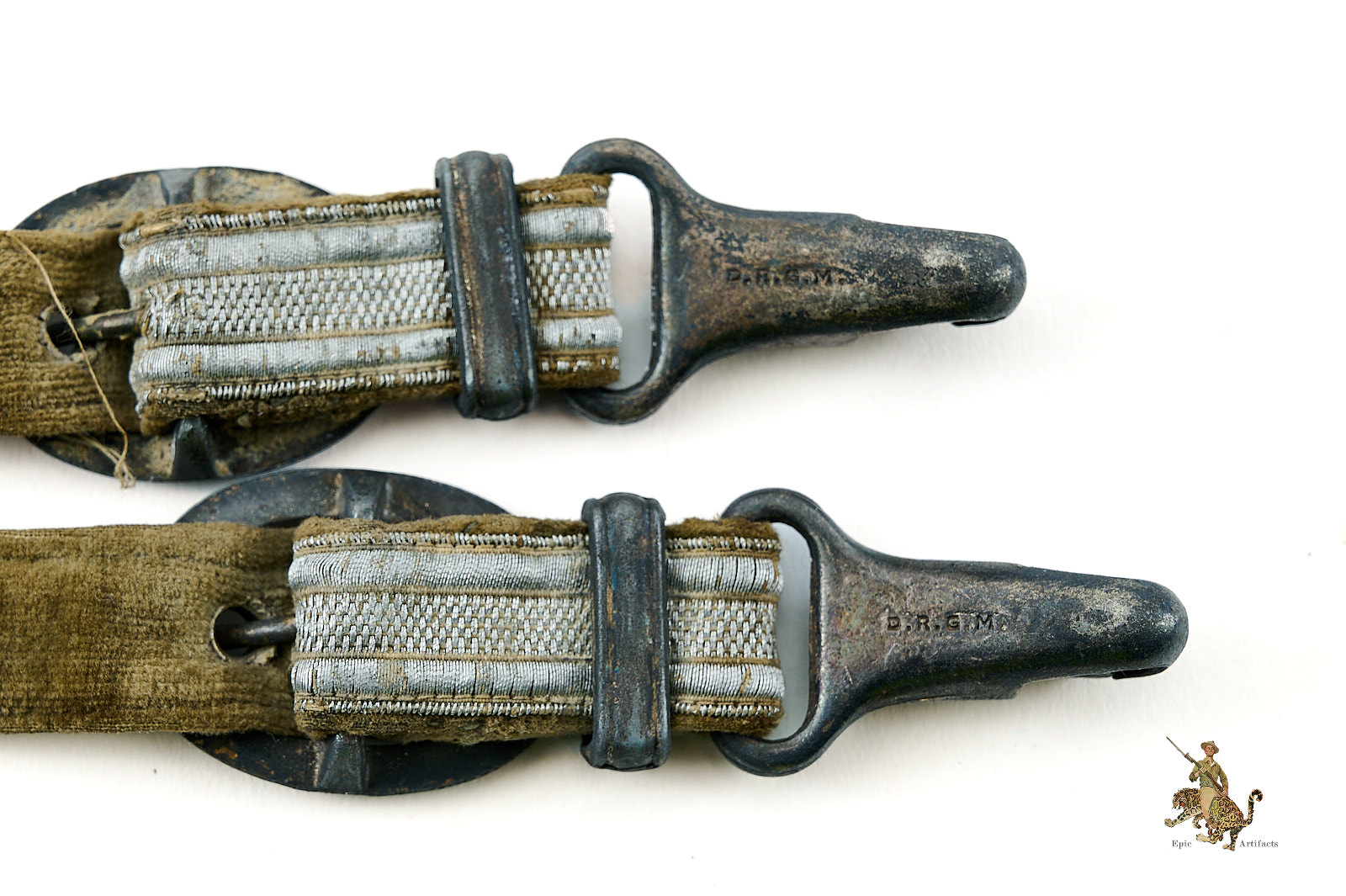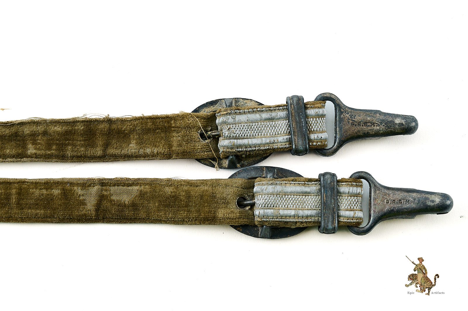 Product Description: A well preserved set of Heer Army Dagger Hangers, presented here in excellent condition and embodying both craftsmanship and historical character. The aluminum wire braid remains notably bright, complementing the high-quality velvet backing in an attractive green hue, which displays only minor areas of rub consistent with use over time. The edges do show some fraying and loose threads.  The left strap has a partial tear to one side where it has rubbed against the loop over time.