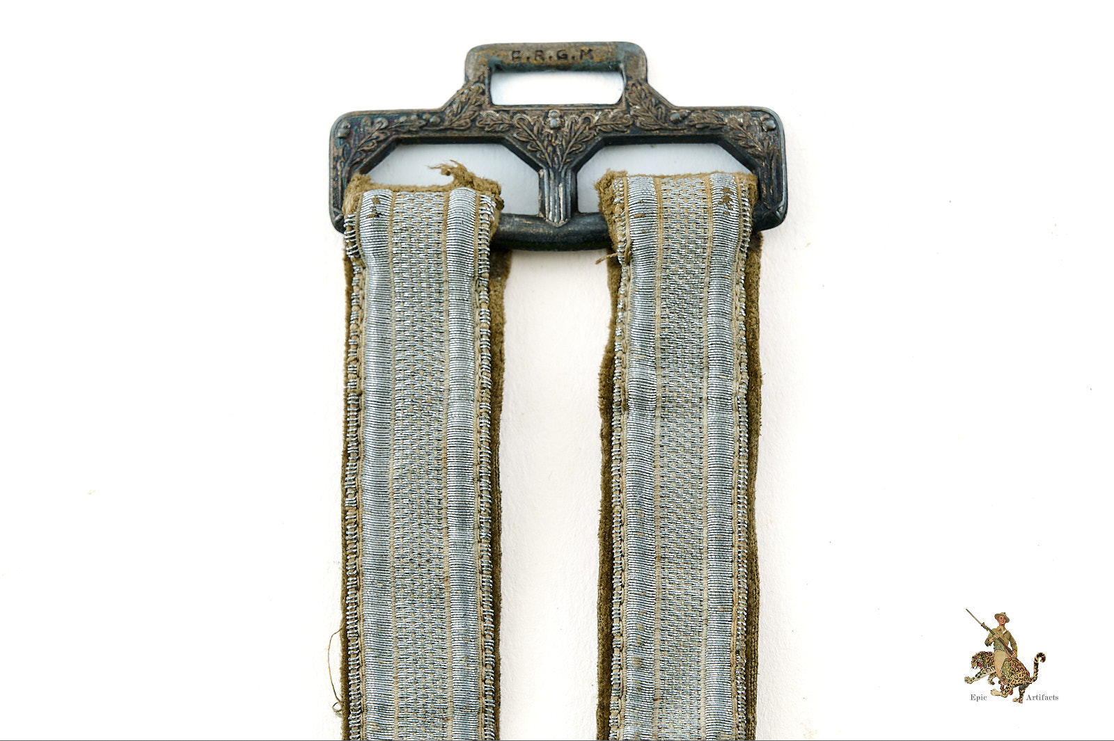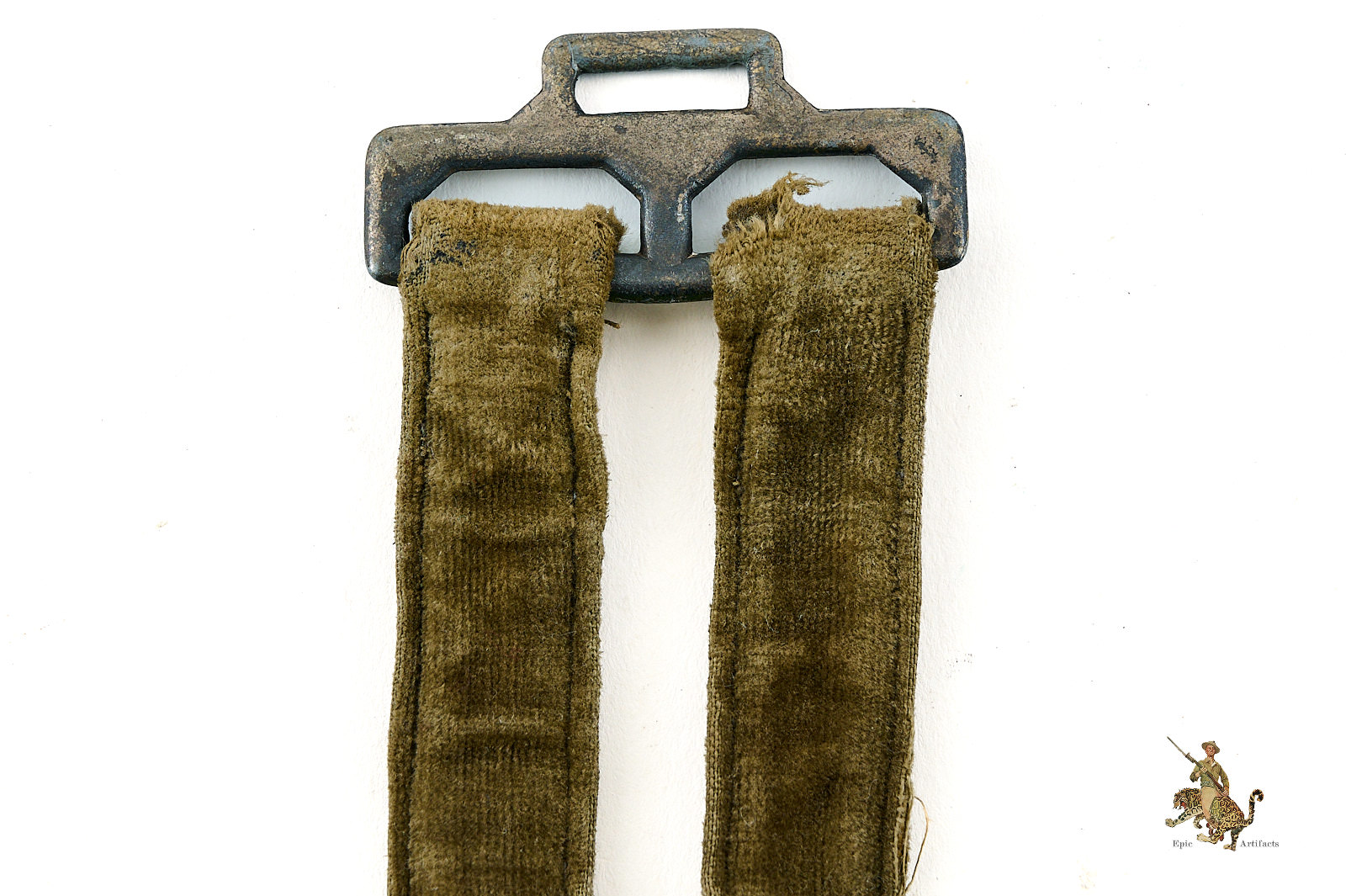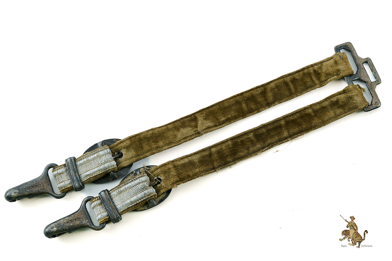 Product Description: A well preserved set of Heer Army Dagger Hangers, presented here in excellent condition and embodying both craftsmanship and historical character. The aluminum wire braid remains notably bright, complementing the high-quality velvet backing in an attractive green hue, which displays only minor areas of rub consistent with use over time. The edges do show some fraying and loose threads.  The left strap has a partial tear to one side where it has rubbed against the loop over time.